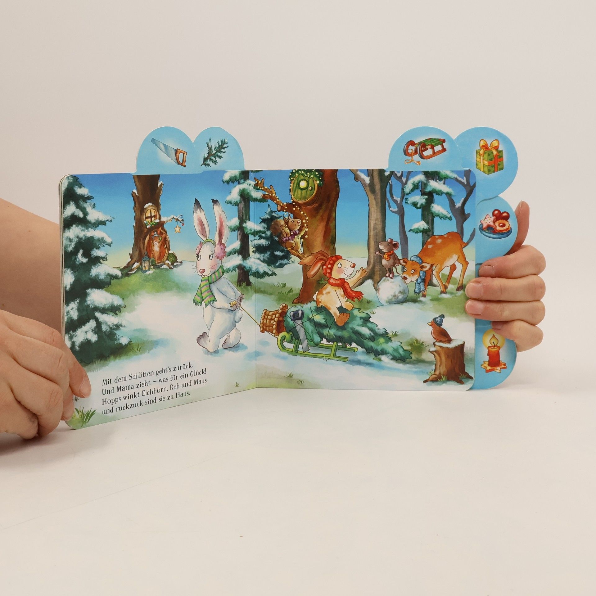 Oh wie schön, es weihnachtet sehr! Hase Hopps freut sich schon. Doch zuerst gibt es noch einiges zu tun: Mit Mama sucht er im Wald gemeinsam eine hübsche Tanne aus und bringt sie auf dem Schlitten nach Haus. Gemeinsam wird der Baum geschmückt. Ein schönes Geschenk für Papa und eins für Mama denkt sich Hopps auch noch aus. Und natürlich hilft er fleißig mit beim Plätzchenbacken. Wie herrlich das duftet! Und endlich ist Bescherung, Hopps kuschelt sich mit Mama und Papa zusammen und denkt: Liebhaben ist das beste Geschenk. Eine erste Weihnachtsgeschichte mit liebenswerten Tierfigren, gereimten kurzen Texten und stabilem Rundumregister für kleine Hände.