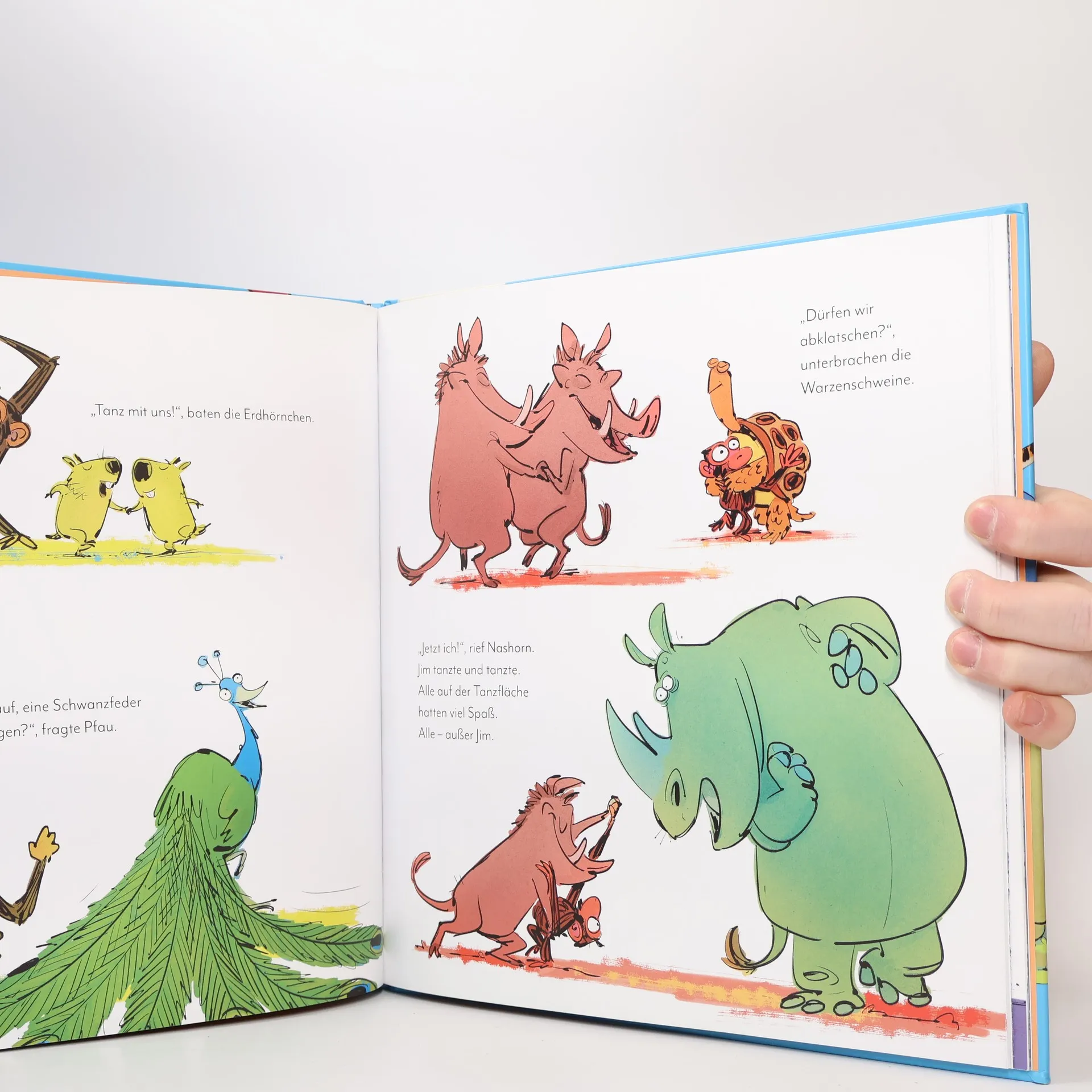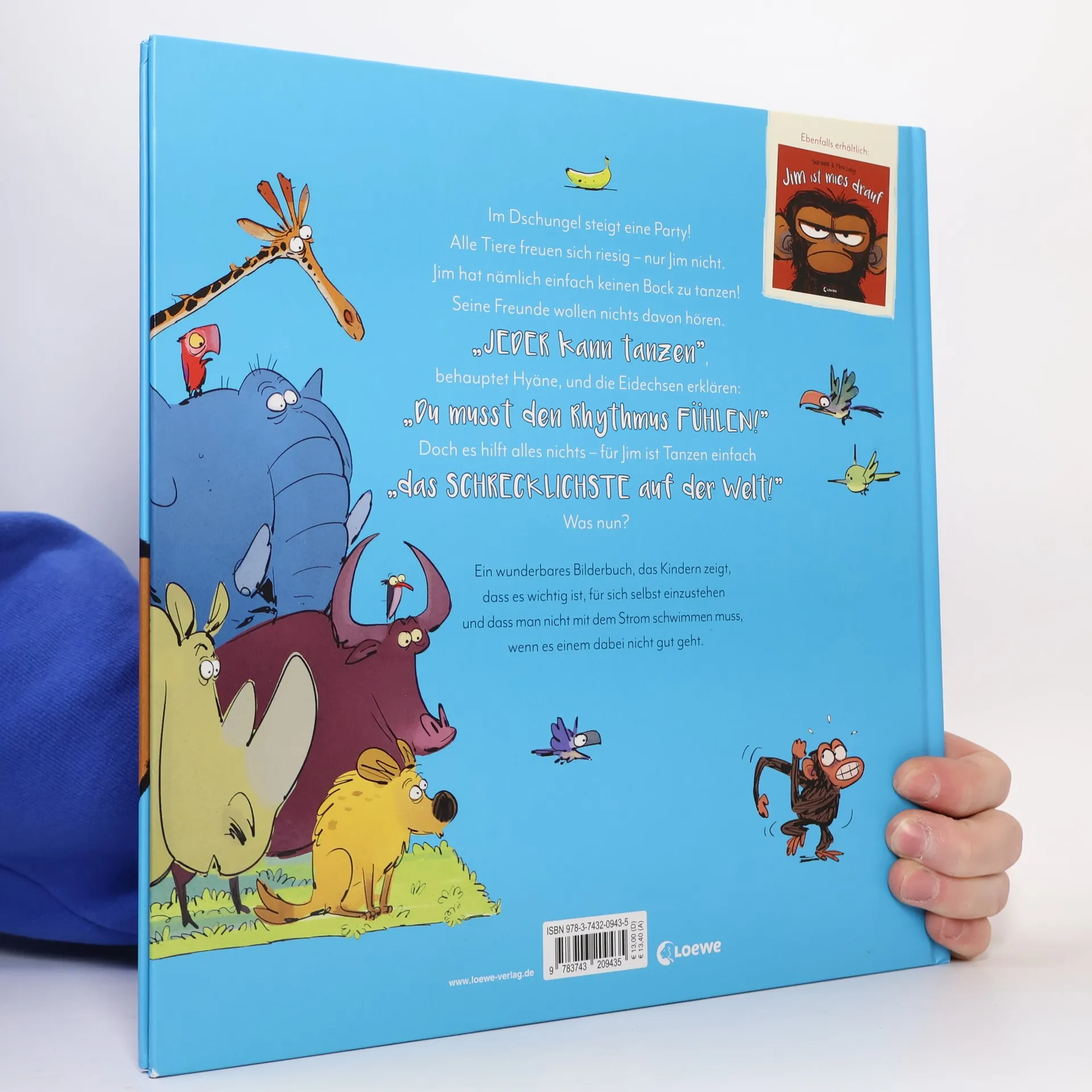Das Buch ist bei deiner Buchhandlung vor Ort und bei vielen Online-Buchshops erhältlich! Im Dschungel steigt eine Party! Alle Tiere freuen sich riesig – nur Jim nicht. Jim hat nämlich einfach keinen Bock zu tanzen! Seine Freunde wollen nichts davon hören. „Jeder kann tanzen“, behauptet Hyäne, und die Eidechsen erklären: „Du musst den Rhythmus fühlen!“ Doch es hilft alles nichts – für Jim ist Tanzen einfach „das Schrecklichste auf der Welt!“ Was nun? Ein wunderbares Bilderbuch, das Kindern zeigt, dass es wichtig ist, für sich selbst einzustehen und dass man nicht mit dem Strom schwimmen muss, wenn es einem dabei nicht gut geht. Es ist nicht immer einfach, zu seinen Gefühlen zu stehen – besonders, wenn scheinbar alle Freunde etwas besonders toll finden, nur man selbst nicht. Doch das bedeutet nicht, dass man automatisch nicht mitmachen kann, oder dass man deshalb anderen den Spaß verdirbt. Das lernt auch Affe Jim in diesem witzigen und einfühlsamen Bilderbuch. Kindgerecht und lustig wird der Umgang mit schwer erklärbaren Gefühlen thematisiert und gezeigt, dass Nein sagen völlig in Ordnung ist. Der Nachfolgeband zum erfolgreichen Bilderbuch Jim ist mies drauf .