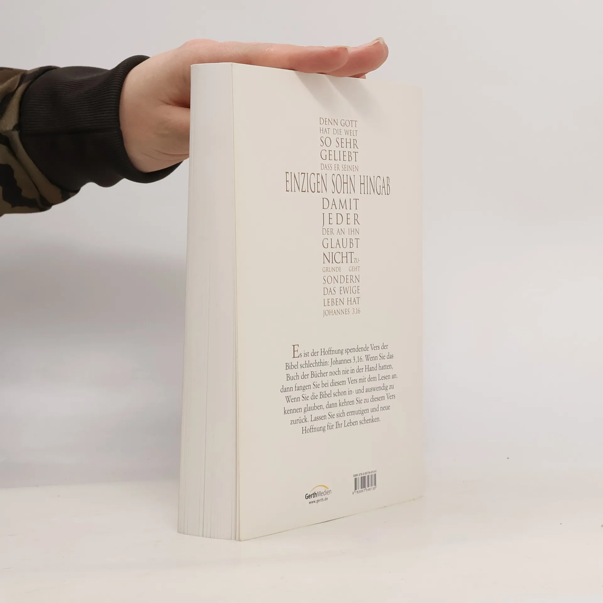 Es ist der Hoffnung spendende Vers der Bibel schlechthin: Johannes 3,16. Wenn Sie das Buch der Bücher noch nie in der Hand hatten, dann fangen Sie bei diesem Vers mit dem Lesen an. Wenn Sie die Bibel schon in- und auswendig zu kennen glauben, dann kehren Sie zu diesem Vers zurück. Lassen Sie sich ermutigen und neue Hoffnung für Ihr Leben schenken.