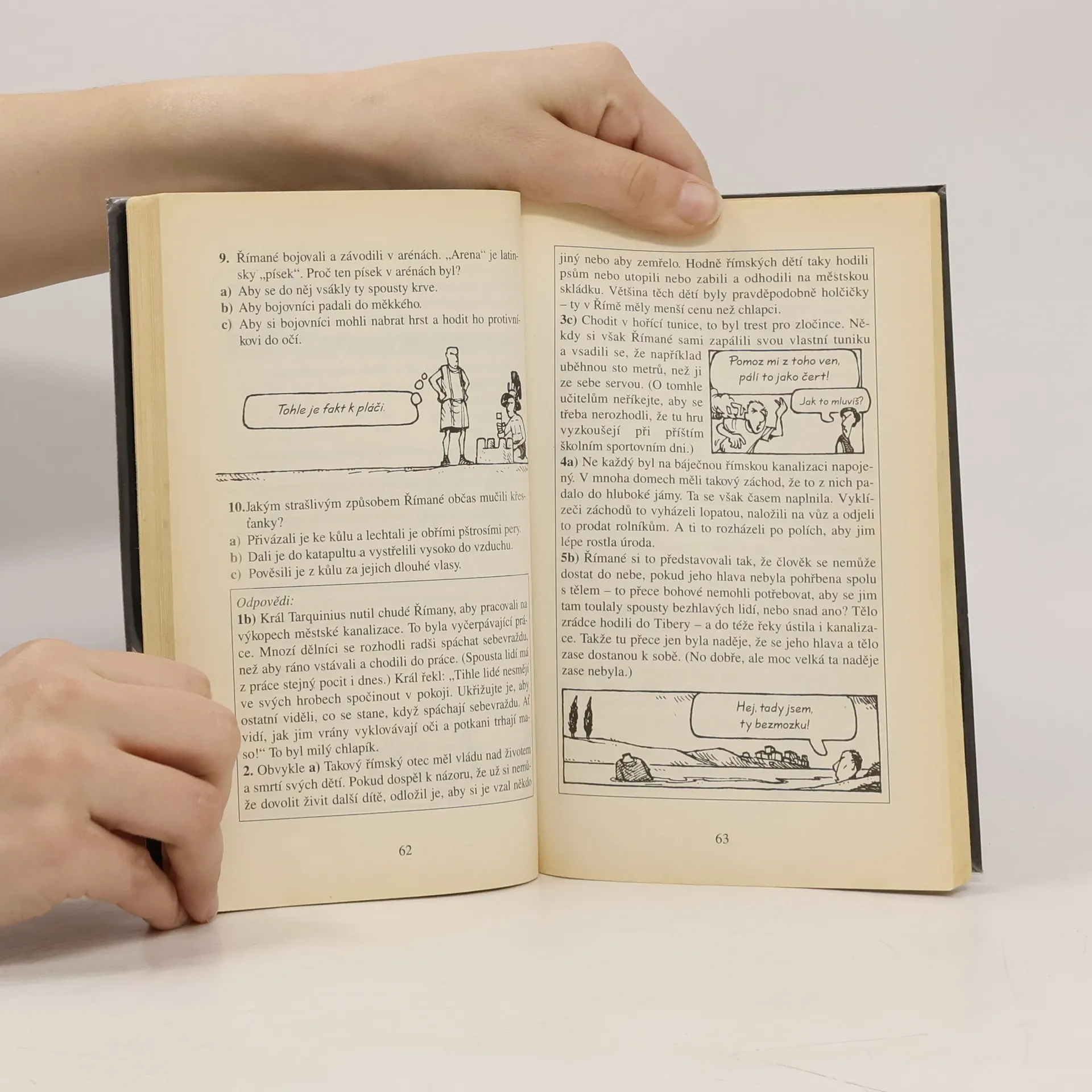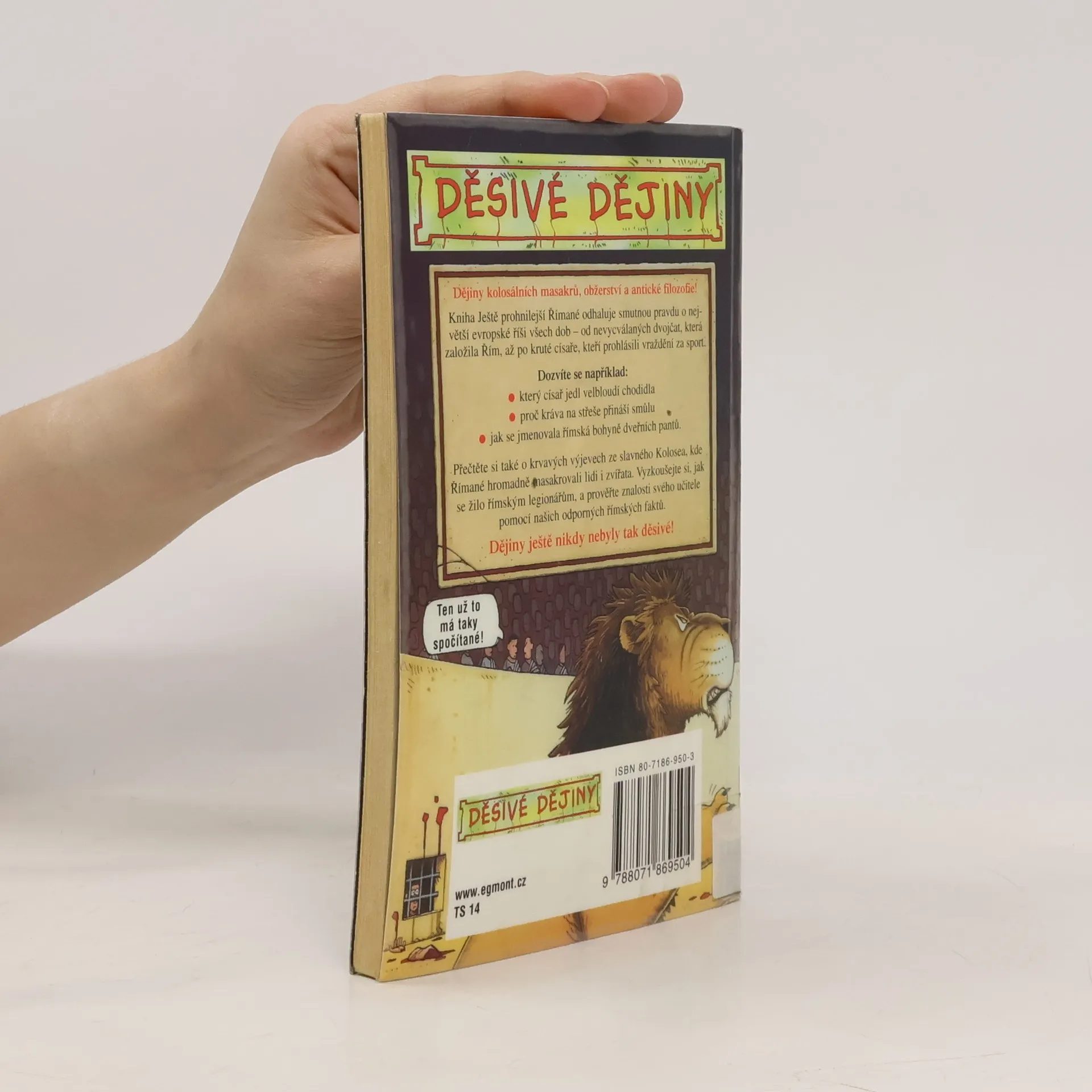 Tato knížka odhaluje smutnou pravdu o největší evropské říši všech dob – od nevycválaných dvojčat, která založila Řím, až po kruté císaře, kteří prohlásili vraždění za národní sport. Přečtěte si o krvavých výjevech ze slavného Kolosea, vyzkoušejte si, jak se žilo římským legionářům, a prověřte znalosti svého učitele pomocí našich odporných římských faktů. Dějiny ještě nikdy nebyly tak děsivé!