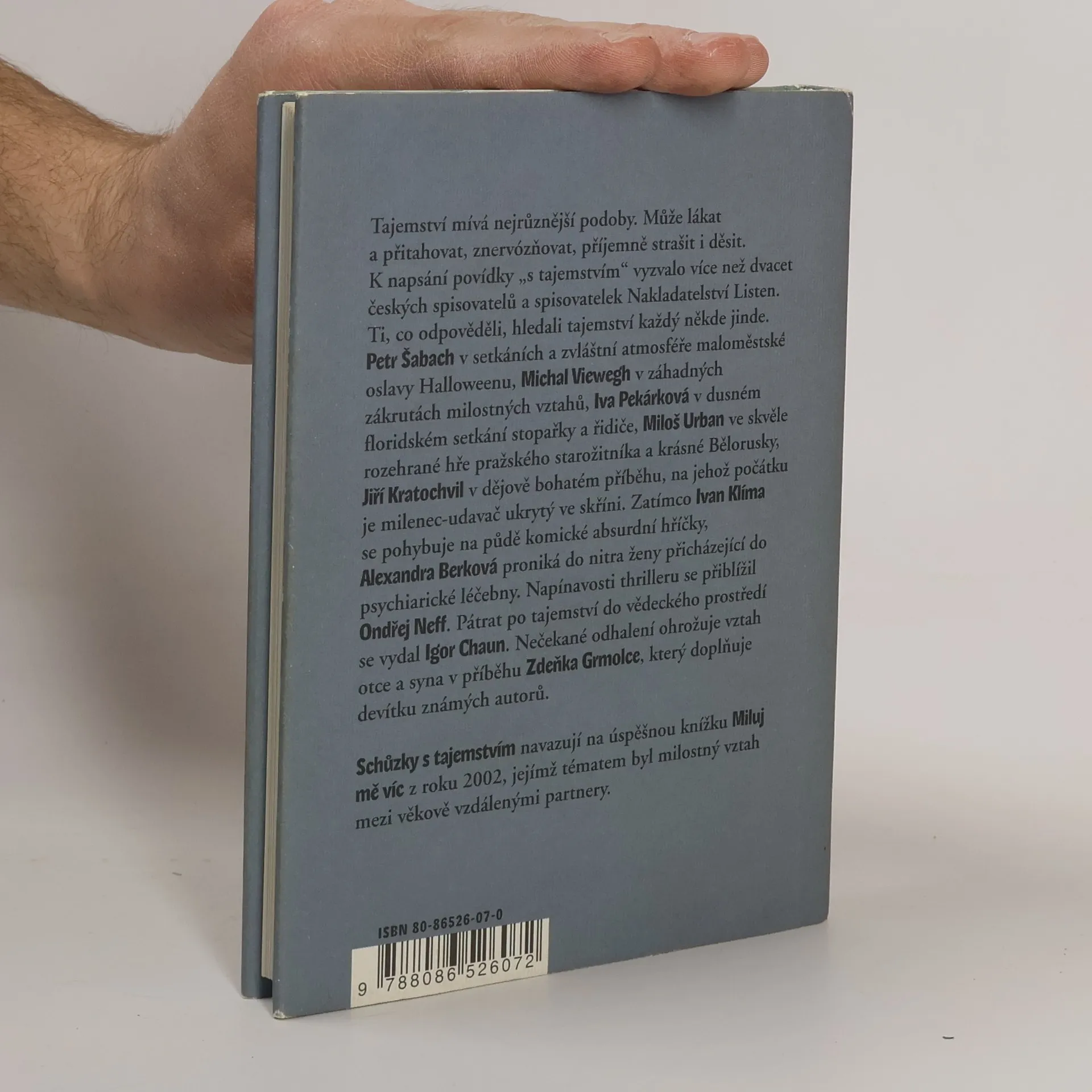 Povídky s tajemstvím známých českých autorů (Petr Šabach, Michal Viewegh, Iva Pekárková, Miloš Urban, Jiří Kratochvil, Ivan Klíma, Ondřej Neff, Igor Chaun, Zdeněk Grmolec) napsané speciálně pro tuto knížku.