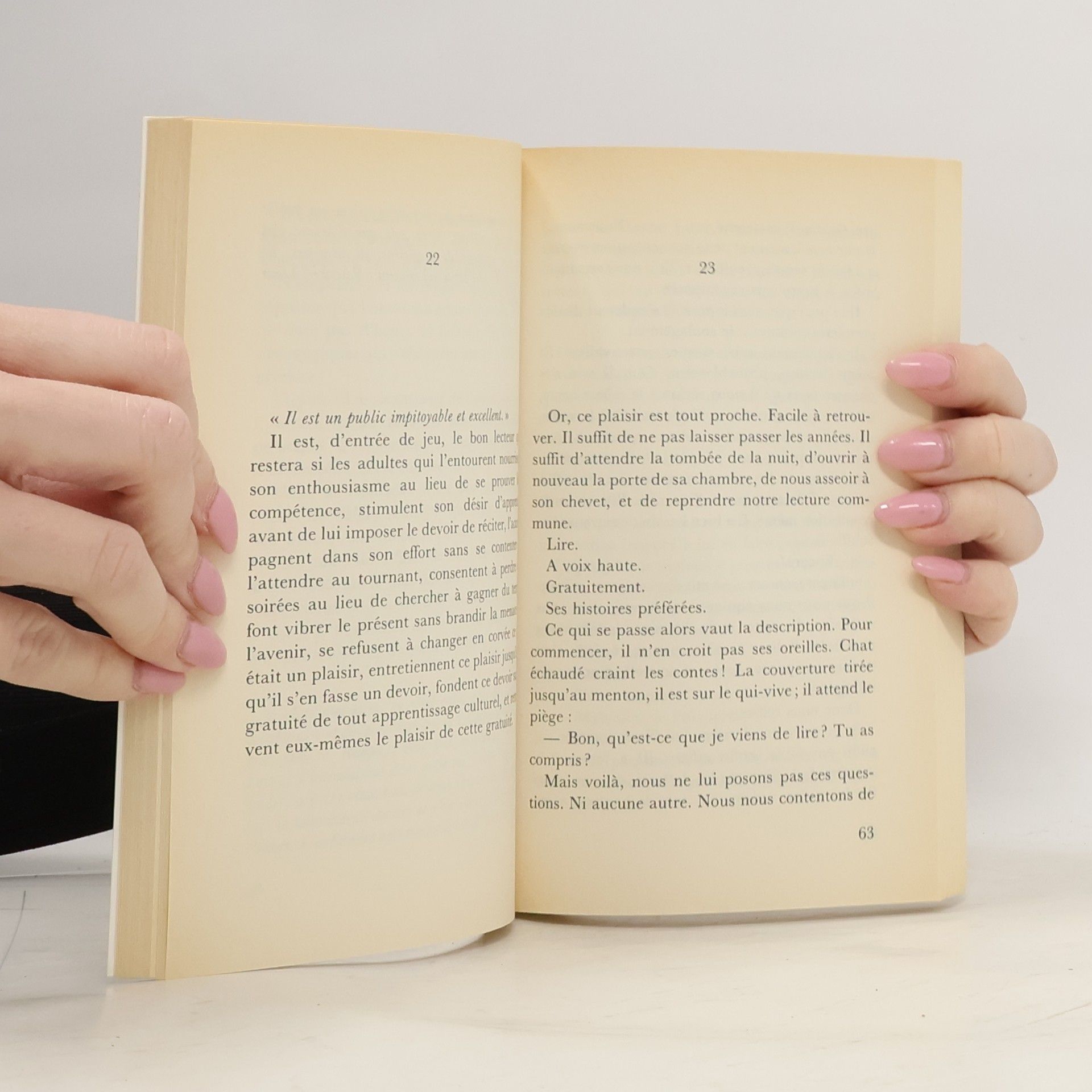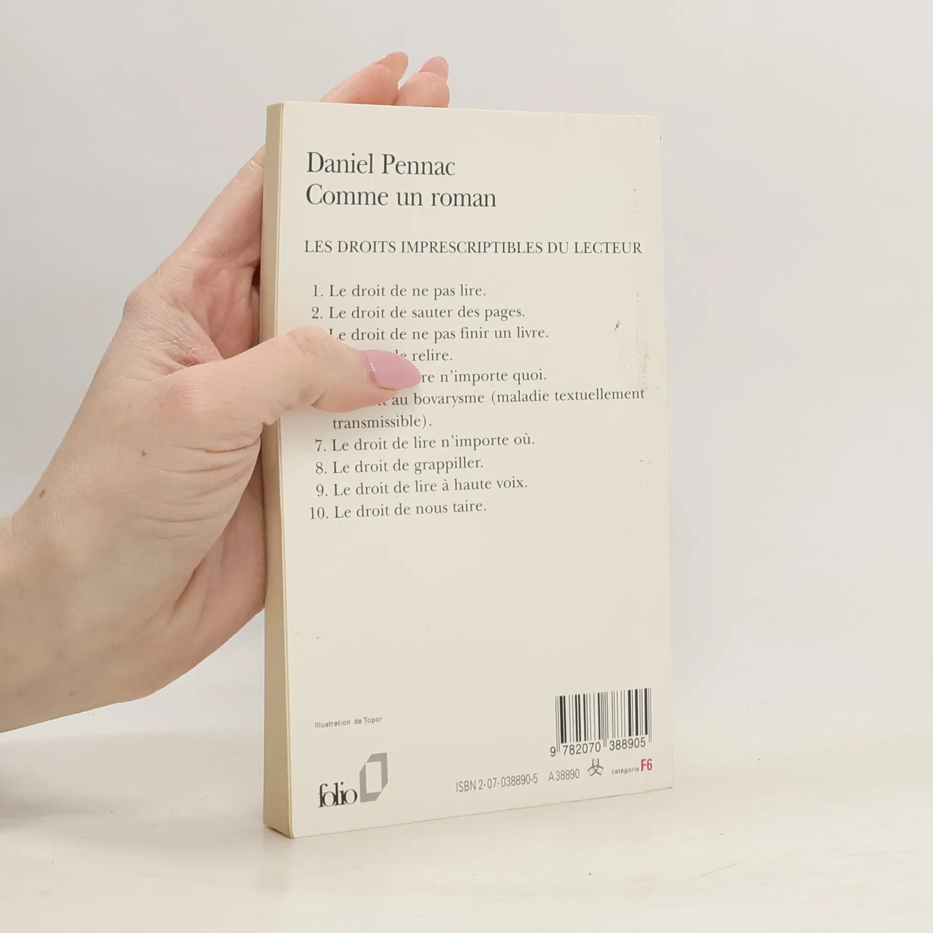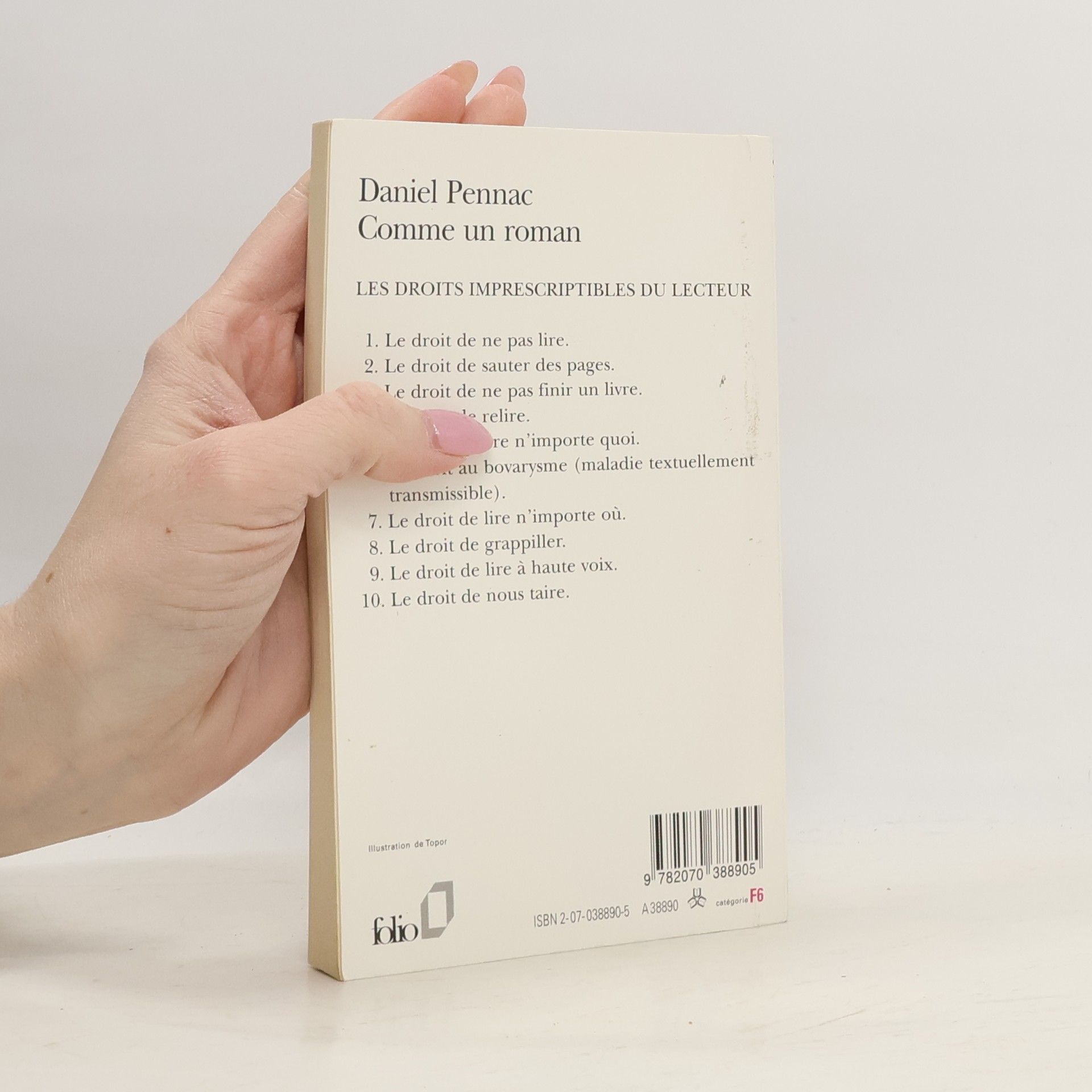 Les droits imprescriptibles du lecteur 1. Le droit de ne pas lire. 2. Le droit de sauter des pages. 3. Le droit de ne pas finir un livre. 4. Le droit de relire. 5. Le droit de lire n'importe quoi. 6. Le droit au bovarysme (maladie textuellement transmissible). 7. Le droit de lire n'importe où. 8. Le droit de grappiller. 9. Le droit de lire à haute voix. 10. Le droit de nous taire.