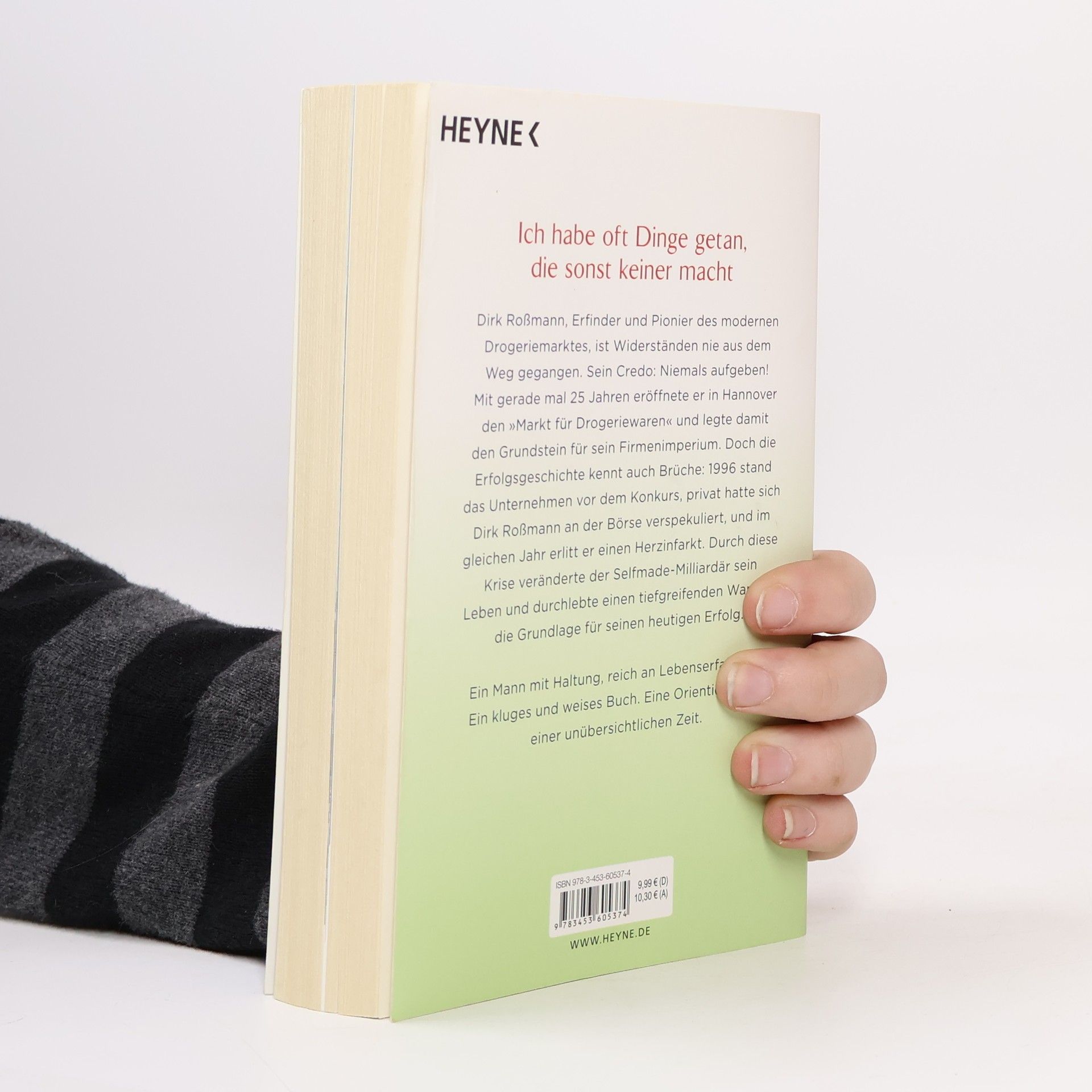 Ich habe oft Dinge getan, die sonst keiner macht Er ist ein Mann der Widersprüche. Harter Wettbewerber einerseits, sozial engagiert andererseits. Dirk Roßmann, Erfinder und Pionier des modernen Drogeriemarktes, große Unternehmerpersönlichkeit und mehrfacher Millionär. Widerständen ist er nie aus dem Weg gegangen. Sein Credo: Niemals aufgeben! Bereits im Alter von 12 zeigte sich sein Unternehmergeist: Er lieferte Drogerieartikel mit dem Fahrrad aus und verkaufte sie 10 Prozent billiger. Mit gerade mal 25 Jahren eröffnete er in Hannover den „Markt für Drogeriewaren“ und legte damit den Grundstein für seine Firma. Doch die Erfolgsgeschichte kennt auch Brüche: 1996 stand das Unternehmen vor dem Konkurs, privat hatte sich Dirk Roßmann an der Börse verspekuliert, und im gleichen Jahr erlitt er einen Herzinfarkt. „Von da an habe ich alles auf Null gestellt und versucht, die Firma zu retten.“ Durch diese Krise veränderte Dirk Roßmann sein Leben und durchlebte einen tiefgreifenden Wandel. Das sieht er heute als Grund für seinen Erfolg an. Ein Mann mit Haltung, reich an Lebenserfahrung, ein kluges und weises Buch, Orientierung in einer unübersichtlichen Zeit. Ausstattung: mit Bildteil