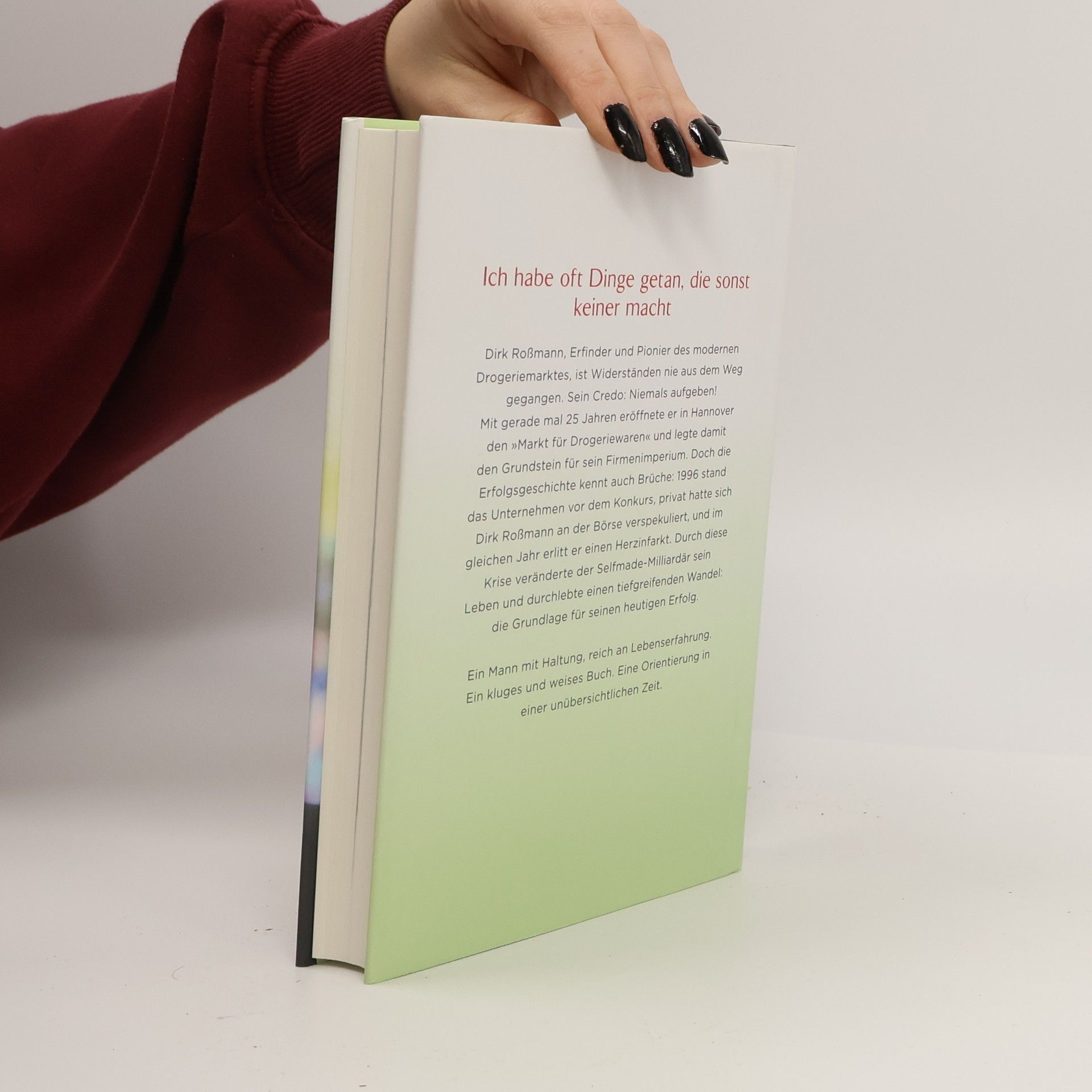 Ich habe oft Dinge getan, die sonst keiner macht Er ist ein Mann der Widersprüche. Harter Wettbewerber einerseits, sozial engagiert andererseits. Dirk Roßmann, Erfinder und Pionier des modernen Drogeriemarktes, große Unternehmerpersönlichkeit und mehrfacher Millionär. Widerständen ist er nie aus dem Weg gegangen. Sein Credo: niemals aufgeben! Bereits im Alter von 12 zeigte sich sein Unternehmergeist: Er lieferte Drogerieartikel mit dem Fahrrad aus und verkaufte sie 10 Prozent billiger. Mit gerade mal 25 Jahren eröffnete er in Hannover den „Markt für Drogeriewaren“ und legte damit den Grundstein für sein Firmenimperium. Doch die Erfolgsgeschichte kennt auch Brüche: 1996 stand das Unternehmen vor dem Konkurs, privat hatte sich Dirk Roßmann an der Börse verspekuliert, und im gleichen Jahr erlitt er einen Herzinfarkt. "Von da an habe ich alles auf Null gestellt und versucht, die Firma zu retten." Durch diese Krise veränderte Dirk Roßmann sein Leben und durchlebte einen tiefgreifenden Wandel. Das sieht er heute als Grund für seinen Erfolg an. - Ein Mann mit Haltung, reich an Lebenserfahrung, ein kluges und weises Buch, eine Orientierung in einer unübersichtlichen Zeit.