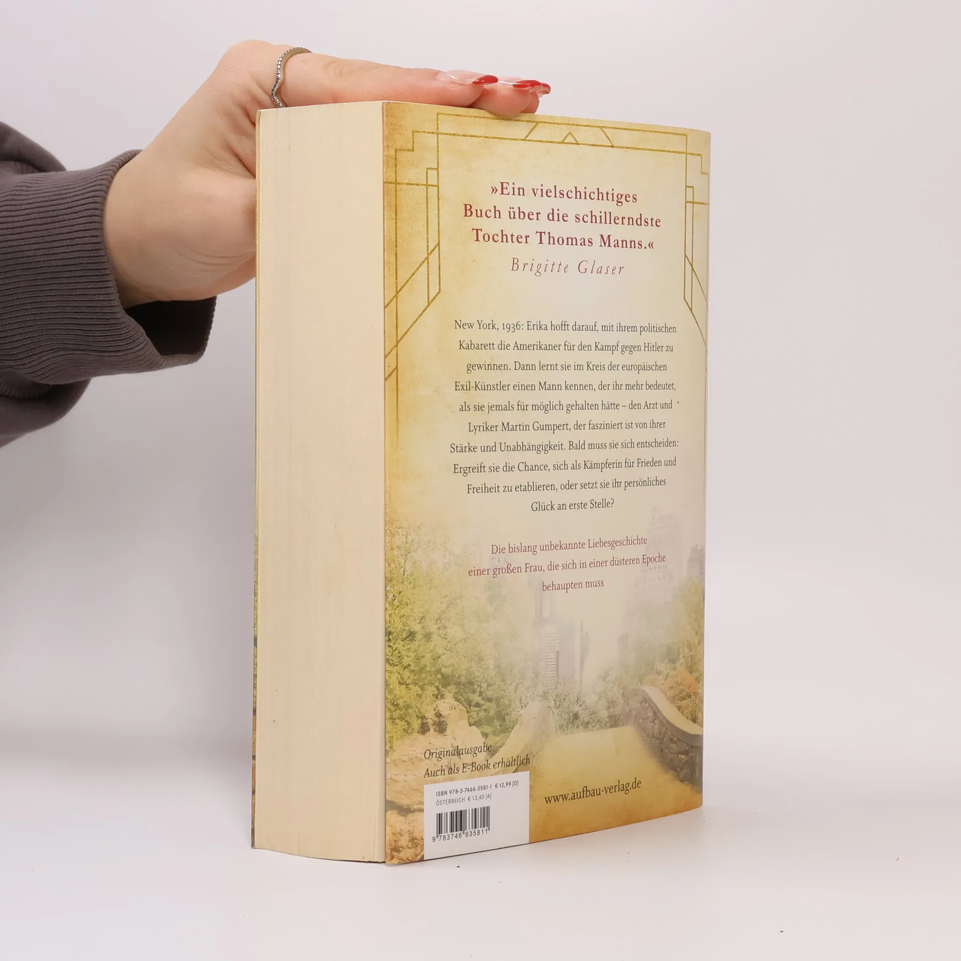 „Ein vielschichtiges Buch über die schillerndste Tochter Thomas Manns.“ Brigitte Glaser.New York, 1936: Erika hofft darauf, mit ihrem politischen Kabarett die Amerikaner für den Kampf gegen Hitler zu gewinnen. Dann lernt sie im Kreis der europäischen Exil-Künstler einen Mann kennen, der ihr mehr bedeutet, als sie jemals für möglich gehalten hätte – den Arzt und Lyriker Martin Gumpert, der fasziniert ist von ihrer Stärke und Unabhängigkeit. Bald muss sie sich Ergreift sie die Chance, sich als Kämpferin für Frieden und Freiheit zu etablieren, oder setzt sie ihr persönliches Glück an erste Stelle?Die bislang unbekannte Liebesgeschichte einer großen Frau, die sich in einer düsteren Epoche behaupten muss.