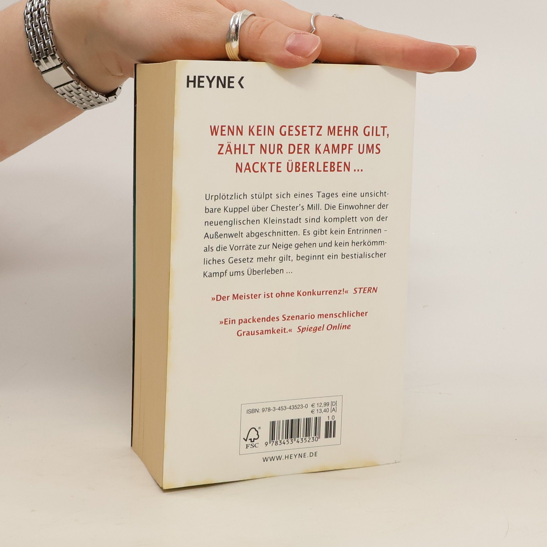 Wenn kein Gesetz mehr gilt, zählt nur der Kampf ums nackte Überleben... Mit „Die Arena” legt Stephen King ein faszinierendes neues Monumentalwerk vor – seinen umfangreichsten und fesselndsten Roman seit „The Stand – Das letzte Gefecht”. Urplötzlich stülpt sich eines Tages wie eine unsichtbare Kuppel ein undurchdringliches Kraftfeld über Chester’s Mill. Die Einwohner der neuenglischen Kleinstadt sind komplett von ihrer Umwelt abgeschnitten. Und auf einmal gilt kein herkömmliches Gesetz mehr ...