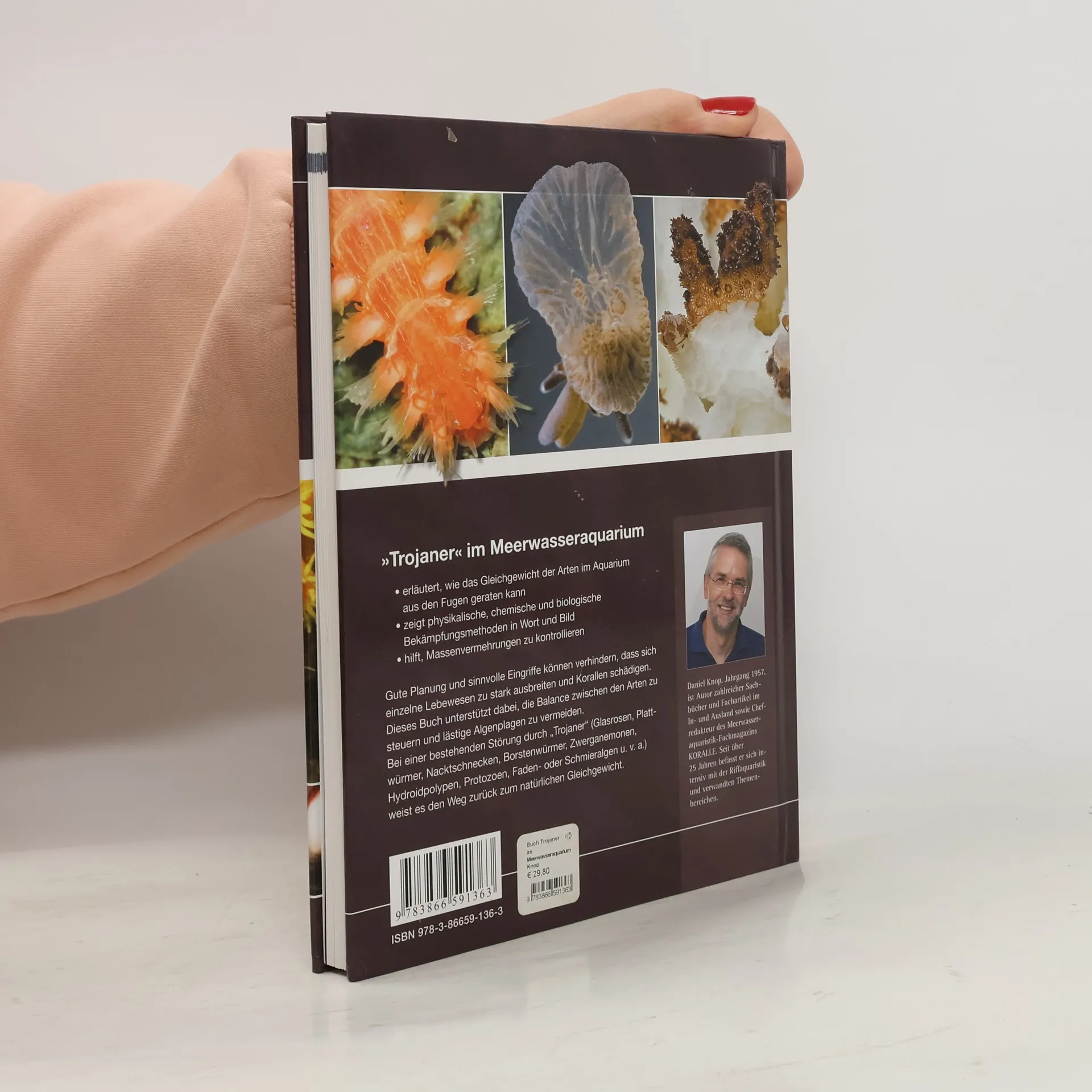 Manche Wirbellose und Algen gelangen unbemerkt in das Riffaquarium und vermehren sich hier stark, so dass die Artenbalance gestört wird. Sie breiten sich aus, drängen Korallen zu­rück und schädigen sie. Solche Arten, die sich zu einer Plage entwickeln können, nennt Autor Daniel Knop daher in Anlehnung etwa an die Computer-Terminologie „Trojaner“. Der Aquarianer muss nun eingreifen und steuern, damit die Balance zwischen den gepflegten Wirbellosenarten erhalten bleibt. In diesem Buch beschreibt Daniel Knop das komplexe Geflecht von Beziehungen zwischen den Arten im Aquarium, mit seinen sensiblen Gleichgewichten und gegenseitigen Abhängigkeiten. Er erläutert, wodurch die Artenbalance aus den Fugen gerät und was der Aquarianer tun kann, um „Trojaner“ zu kontrollieren und die Balance wieder herzustellen, damit die Korallen ungestört zu wachsen vermögen. Dazu werden nicht nur physikalische und chemische Bekämpfungsmethoden vorgestellt, sondern auch hilfreiche Tierarten zur biologischen Kontrolle. Als „Trojaner“ hier besprochene Organismen: - Glasrosen („Aiptasien“) -Turbellarien („Plattwürmer“, „Planarien“) - Borstenwürmer - Nacktschnecken - Hydroidpolypen - Krustenanemonen - Schwämme - Zwerganemonen („Manjano“-Anemonen) - Gänsefußseesterne (Asterina) - Protozoen („RTN“) - Fadenalgen - Schmieralgen - Kieselalgen und weitere