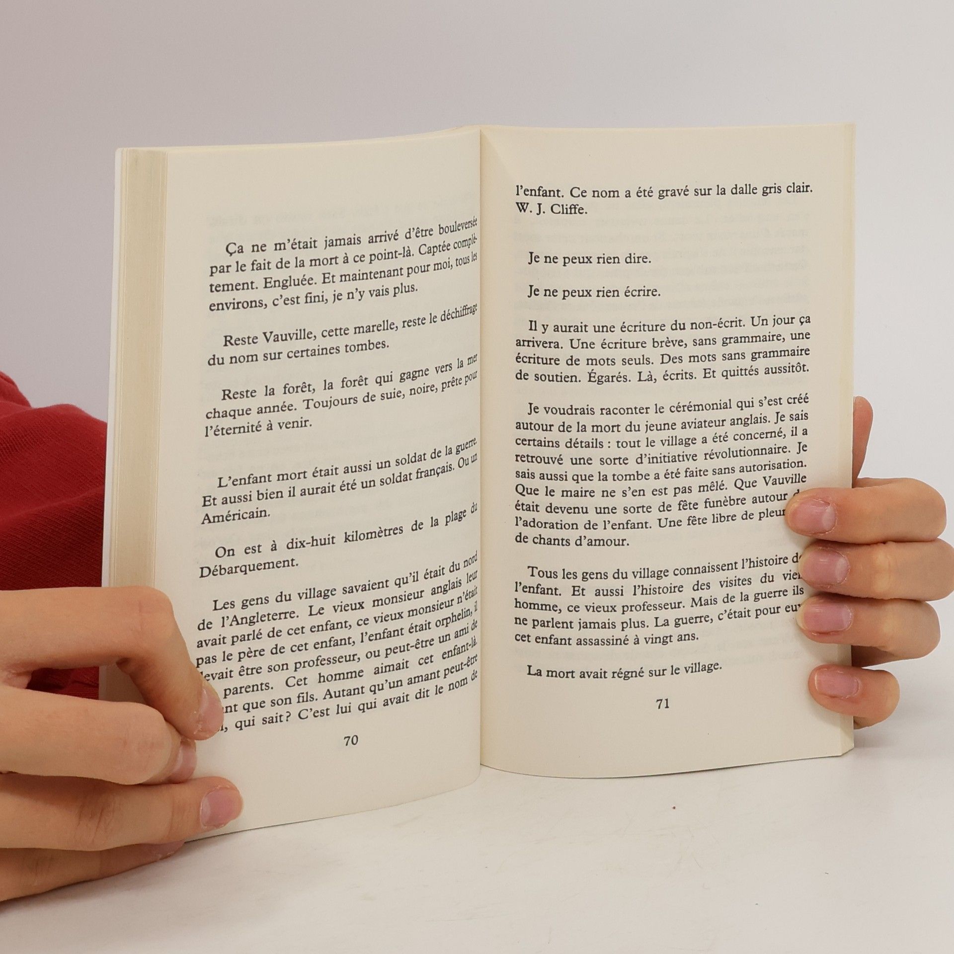 " Il faut toujours une séparation d'avec les autres gens autour de la personne qui écrit les livres. C'est une solitude essentielle. C'est la solitude de l'auteur, celle de l'écrit. Pour débuter la chose, on se demande ce que c'était ce silence autour de soi. Et pratiquement à chaque pas que l'on fait dans une maison et à toutes les heures de la journée, dans toutes les lumières, qu'elles soient du dehors ou des lampes allumées dans le jour. Cette solitude réelle du corps devient celle, inviolable, de l'écrit. Je ne parlais de ça à personne. Dans cette période-là de ma première solitude j'avais déjà découvert que c'était écrire qu'il fallait que je fasse. J'en avais déjà été confirmée par Raymond Queneau. Le seul jugement de Raymond Queneau. Cette phrase : "Ne faites rien d'autre dans la vie que ça, écrire." écrire, c'était ça la seule chose qui peuplait ma vie et qui l'enchantait. Je l'ai fait. L'écriture ne m'a jamais quittée. "