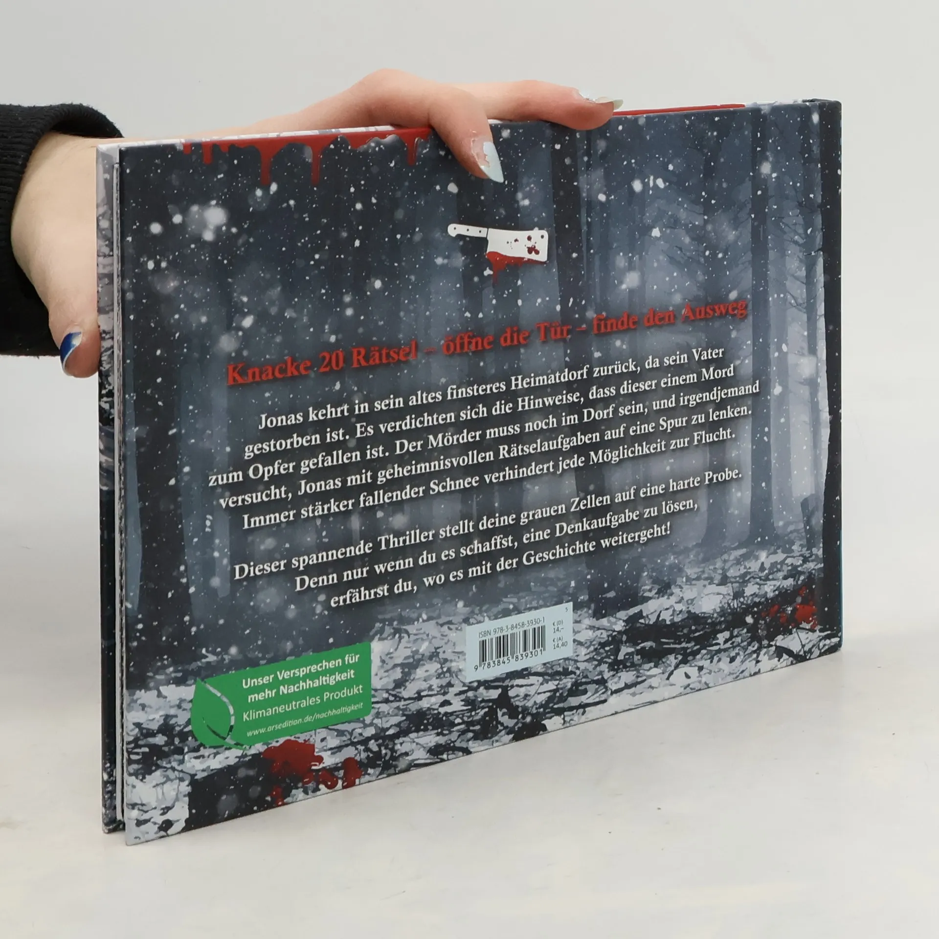 Tauche ein in ein aufregendes Abenteuer mit diesem Escape-Room-Thriller! Wenn du Escape-Rooms und Krimis liebst, ist dieses Buch genau das Richtige für dich. Nach dem Erfolg ihres Adventskalenders präsentiert Eva Eich eine packende Geschichte: Jonas kehrt in sein düsteres Heimatdorf zurück, um den Tod seines Vaters zu klären, der möglicherweise einem Mord zum Opfer fiel. Während der Schnee unaufhörlich fällt und alle Fluchtwege versperrt sind, erhält Jonas mysteriöse Rätsel, die ihn auf die Spur des Mörders führen sollen. Dieses Buch fordert deine Denkkünste heraus, denn nur durch das Lösen von Rätseln erfährst du, wie die Geschichte weitergeht. Mit hochwertigem Hardcover und 20 Doppelseiten zum Aufschneiden bleibt die Spannung bis zum Schluss erhalten. Es ist das ideale Geschenk für Abenteurer, Spiele-Fans und Rätselliebhaber. Jedes Kapitel birgt ein kniffliges Escape-Rätsel, das dich zum nächsten Kapitel führt, während eine Lösungs-Hilfe sicherstellt, dass du nicht in einer Sackgasse landest. Das offene Ende stellt sicher, dass nur die, die alle Denkspiele lösen, die letzte Tür öffnen und dem Albtraum entkommen können. Knacke 20 Rätsel, öffne die Tür und finde deinen Ausweg! Eine innovative Mischung aus Spannungsliteratur, die für jeden Abenteurer ein Highlight ist.