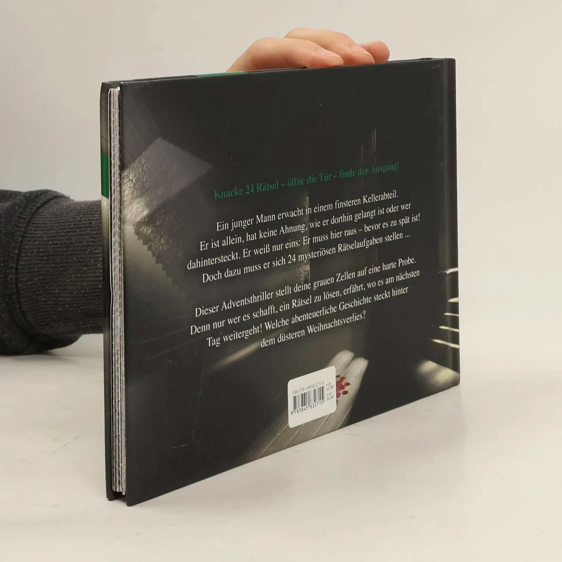 Du magst Escape-Rooms? Du liest gerne Krimi-Adventskalender? Und du traust dich, dich in ein mysteriöses Abenteuer zu begeben? Dann wappne dich und öffne die erste Tür!! Ein junger Mann erwacht in einem finsteren Kellerabteil. Er ist allein, hat keine Ahnung, wie er dort hingelangt ist oder wer dahinter steckt. Er weiß nur eins: Er muss hier raus – bevor es zu spät ist! Doch dazu muss er sich 24 mysteriösen Rätselaufgaben stellen ... Dieser Adventsthriller stellt deine grauen Zellen auf eine harte Probe. Denn, nur wer es schafft, ein Rätsel zu lösen, erfährt, wo es am nächsten Tag weitergeht! Welche abenteuerliche Geschichte steckt hinter dem düsteren Weihnachtsverlies? • Für Abenteurer und Super-Hirne: Jeden Tag ein kniffliges Escape-Rätsel • Eine Lösungs-Hilfe sorgt dafür, dass du nicht in einer Sackgasse landest • Nur wer alle Rätsel löst, öffnet auch die letzte Tür und entkommt dem Albtraum! Knacke 24 Rätsel – öffne die Tür – finde den Ausgang! Eine völlig neue Art Adventskalender: Escape-Room und spannender Thriller in einem!