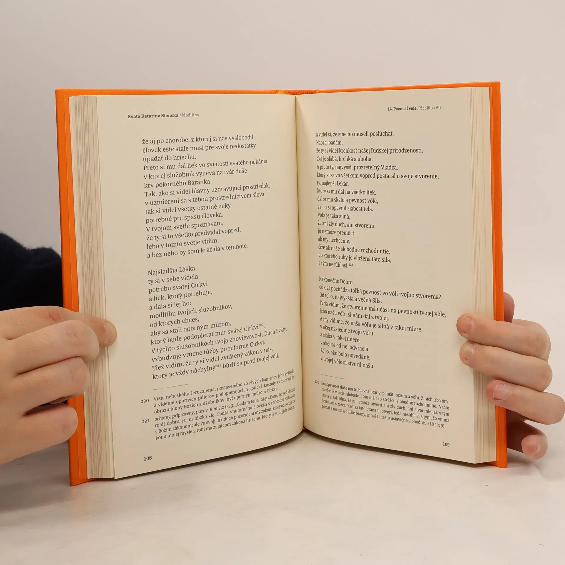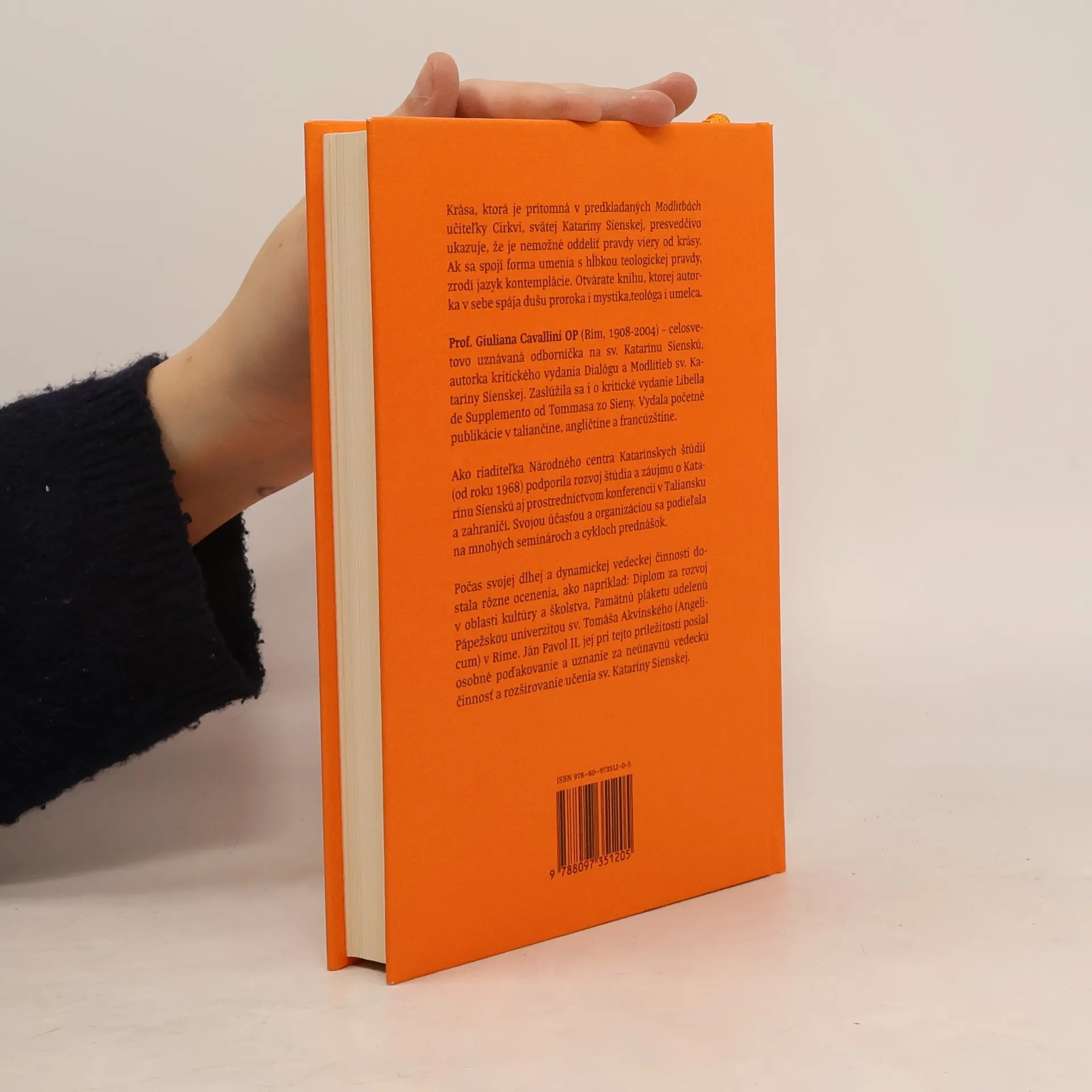 Krása, ktorá je prítomná v predkladaných Modlitbách učiteľky Cirkvi, svätej Kataríny Sienskej, presvedčivo ukazuje, že je nemožné oddeliť pravdy viery od krásy. Ak sa spojí forma umenia s hĺbkou teologickej pravdy, zrodí jazyk kontemplácie. Otvárate knihu, ktorej autorka v sebe spája dušu proroka i mystika, teológa i umelca. Prof. Giuliana Cavallini OP (Rím, 1908-2004) celosvetovo uznávaná odborníčka na sv. Katarínu Sienskú, autorka kritického vydania Dialógu a Modlitieb sv. Kataríny Sienskej. Zaslúžila sa i o kritické vydanie Libella de Supplemento od Tommasa zo Sieny. Vydala početné publikácie v taliančine, angličtine a francúzštine. Ako riaditeľka Národného centra Katarínskych štúdií (od roku 1968) podporila rozvoj štúdia a záujmu o Katarínu Sienskú aj prostredníctvom konferencií v Taliansku a zahraničí. Svojou účasťou a organizáciou sa podieľala na mnohých seminároch a cykloch prednášok. Počas svojej dlhej a dynamickej vedeckej činnosti dostala rôzne ocenenia, ako napríklad: Diplom za rozvoj v oblasti kultúry a školstva, Pamätnú plaketu udelenú Pápežskou univerzitou sv. Tomáša Akvinského (Angelicum) v Ríme. Ján Pavol II. jej pri tejto príležitosti poslal osobné poďakovanie a uznanie za neúnavnú vedeckú činnosť a rozširovanie učenia sv. Kataríny Sienskej. Imprimatur: Damián Mačura OP.