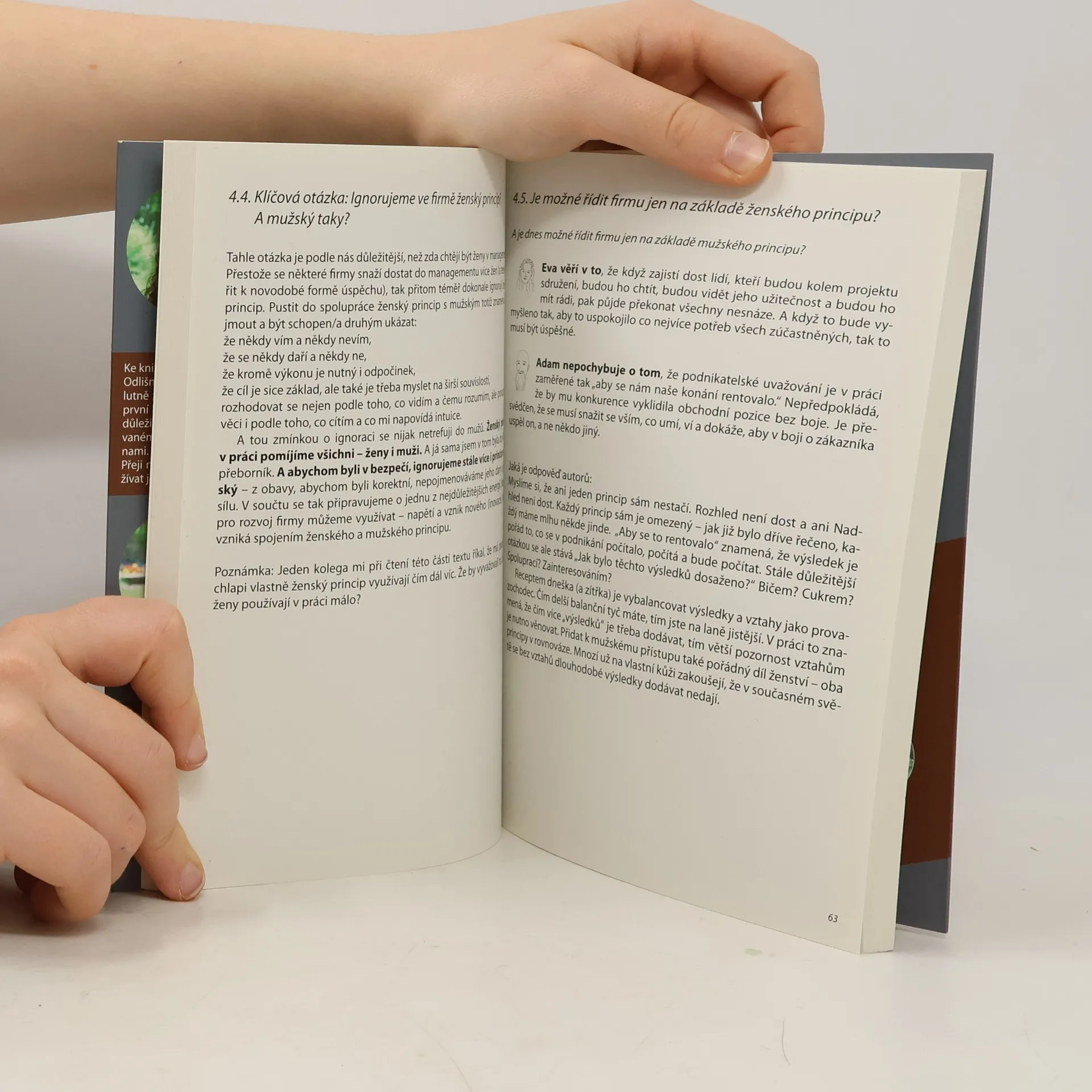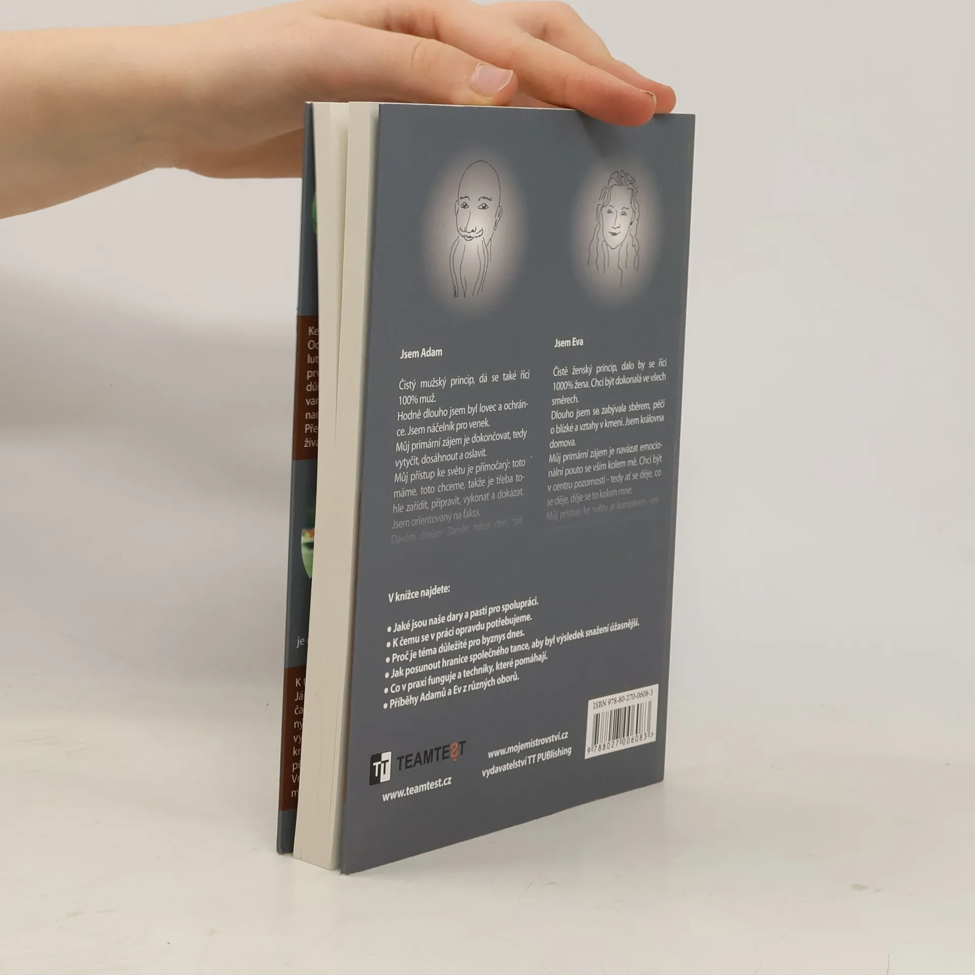 Kniha Radky Maňákové a Miloše Píchy se odvážila prolomit tabu genderové korektnosti a ukazuje možnosti i úskalí spolupráce mužů a žen v práci. Potvrzení domněnky, že opravdu nejsme stejní a že každý potřebuje něco jiného, je v současnosti pro mnohé z nás výbušné téma. „Jak se v práci mohou oba principy, ženský a mužský, doplnit tak, aby vzniklo něco úžasnějšího, než umí udělat každý z nich sám?“, to je otázka, která čtenáře knížkou provází. V různorodých „příbězích“ z manažerské praxe a v myšlenkových „asociačních výletech“ vám autoři představí rozdíly v uvažování, ve vnímání pracovních situací a v postupu k řešení. Objevíte plíživé nebezpečí unisex přístupu, spatříte pasti „nevědomých“ reakcí na projevy opačného principu a pousmějete se nad Milošovými kresbami, které znázorňují uvažování vyhraněných Adamů a Ev. A poté uvidíte dary, které do spolupráce principy přináší a možnosti jejich společného tance. A jak s těmito dary pracovat? Jak je rozvíjet? A jak do práce přinést více jiskření a radosti? A komu se to už opravdu povedlo? …tak to jsou přesně ty otázky, na které autoři hledají a nacházejí mnohdy nečekané odpovědi.