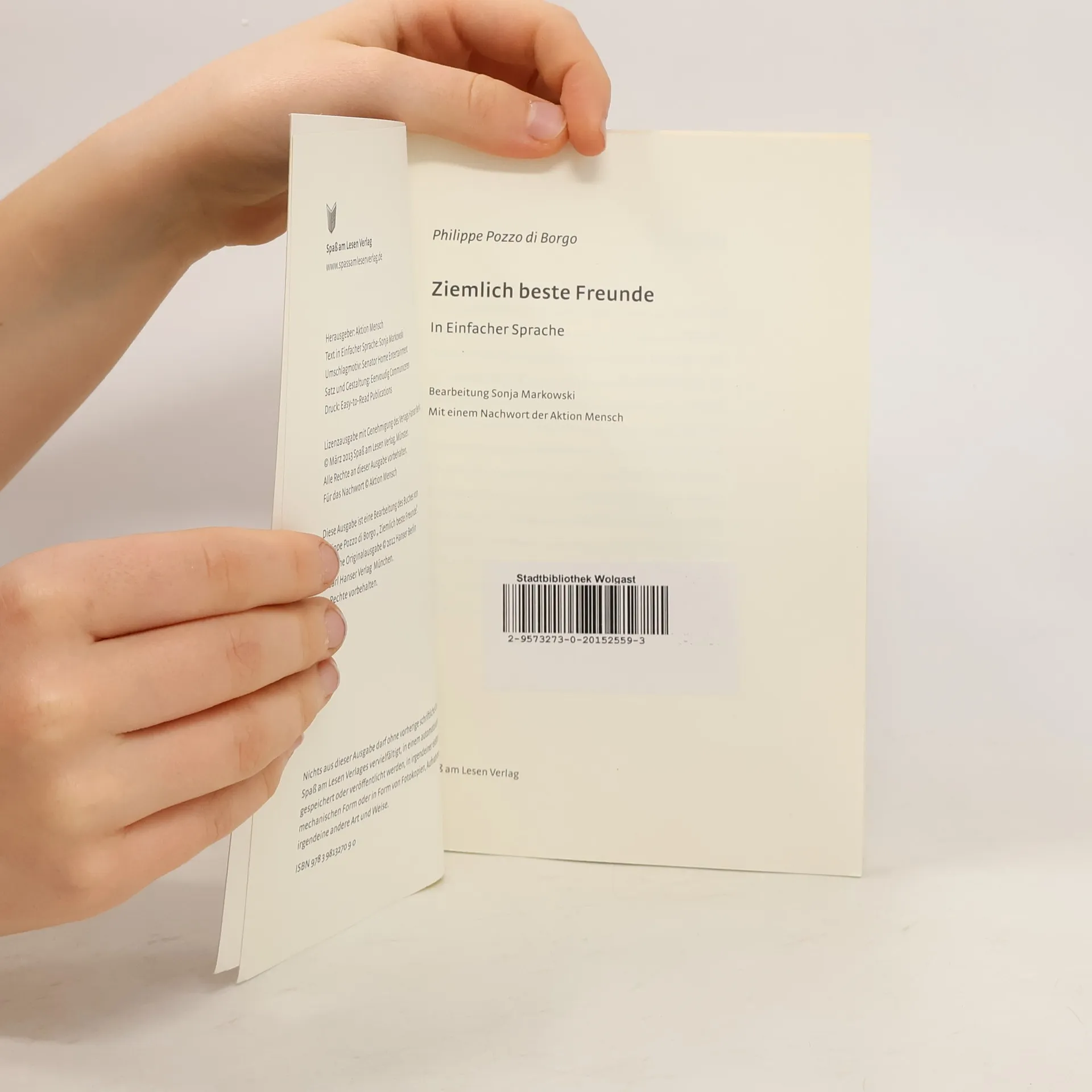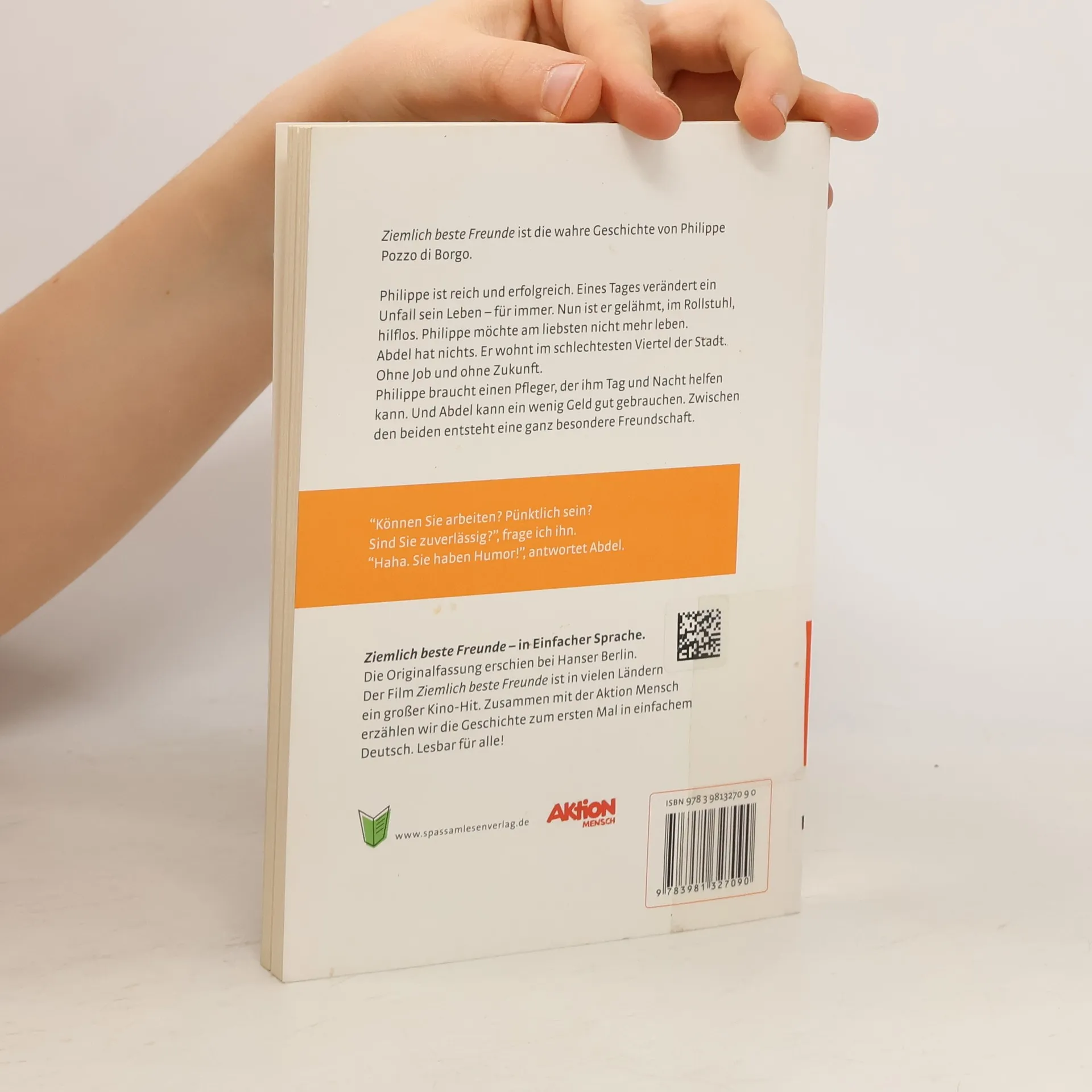 Ziemlich beste Freunde ist die wahre Geschichte von Phillipe Pozzo di Borgo. Philippe ist reich und erfolgreich. Eines Tages verändert ein Unfall sein Leben – für immer. Nun ist er gelähmt, im Rollstuhl, hilflos. Philippe möchte am liebsten nicht mehr leben. Abdel hat nichts. Er wohnt im schlechtesten Viertel der Stadt. Ohne Job und ohne Zukunft. Philippe braucht einen Pfleger, der ihm Tag und Nacht helfen kann. Und Abdel kann ein wenig Geld gut gebrauchen. Zwischen den beiden entsteht eine ganz besondere Freundschaft. Die Originalfassung erschien bei Hanser Berlin. Der Film Ziemlich beste Freunde ist in vielen Ländern ein großer Kino-Hit. Zusammen mit der Aktion Mensch erzählen wir die Geschichte zum ersten Mal in einfachem Deutsch. Lesbar für alle!