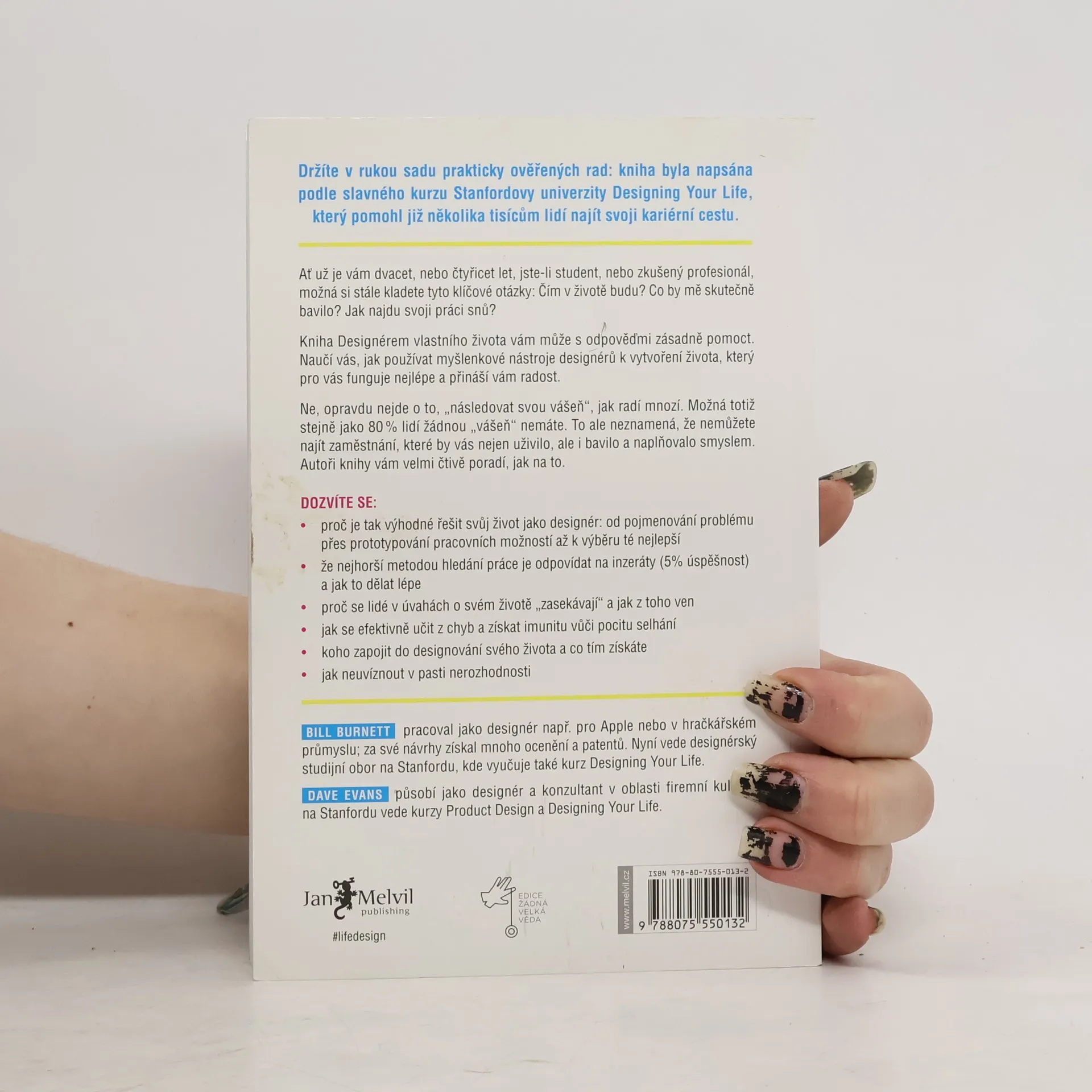 Jak si vybudovat naplňující a radostný život. Ať už jste mladí nebo starší, mnozí stále hledají odpověď na otázku, čím se stanou. Možná potřebujete pomoc při zjišťování svých cílů a způsobů, jak jich dosáhnout. Bill Burnett a Dave Evans navazují na svůj úspěšný kurz Life Design na Stanfordově univerzitě, který pomohl tisícům lidí – od studentů po důchodce – najít novou budoucnost. Jejich metoda vás naučí používat designérské nástroje k vytvoření života, jaký si představujete. Nejde o to „následovat svou vášeň“, pokud ji zatím nemáte. Designéři řeší problémy pomocí designérského myšlení. Vše kolem nás, od technologií po produkty, bylo navrženo s cílem vyřešit konkrétní problém. Autoři ukazují, jak nám toto myšlení může pomoci vytvořit smysluplný život, bez ohledu na naši minulost nebo věk. Designérské myšlení, které stojí za úžasnými inovacemi, lze využít k budování kariéry a naplňujícího života, který je kreativní, produktivní a plný překvapení. Tato kniha nevyřeší vaše problémy, to musíte udělat sami, ale může vás inspirovat k většímu úsilí při práci na lepším životě.