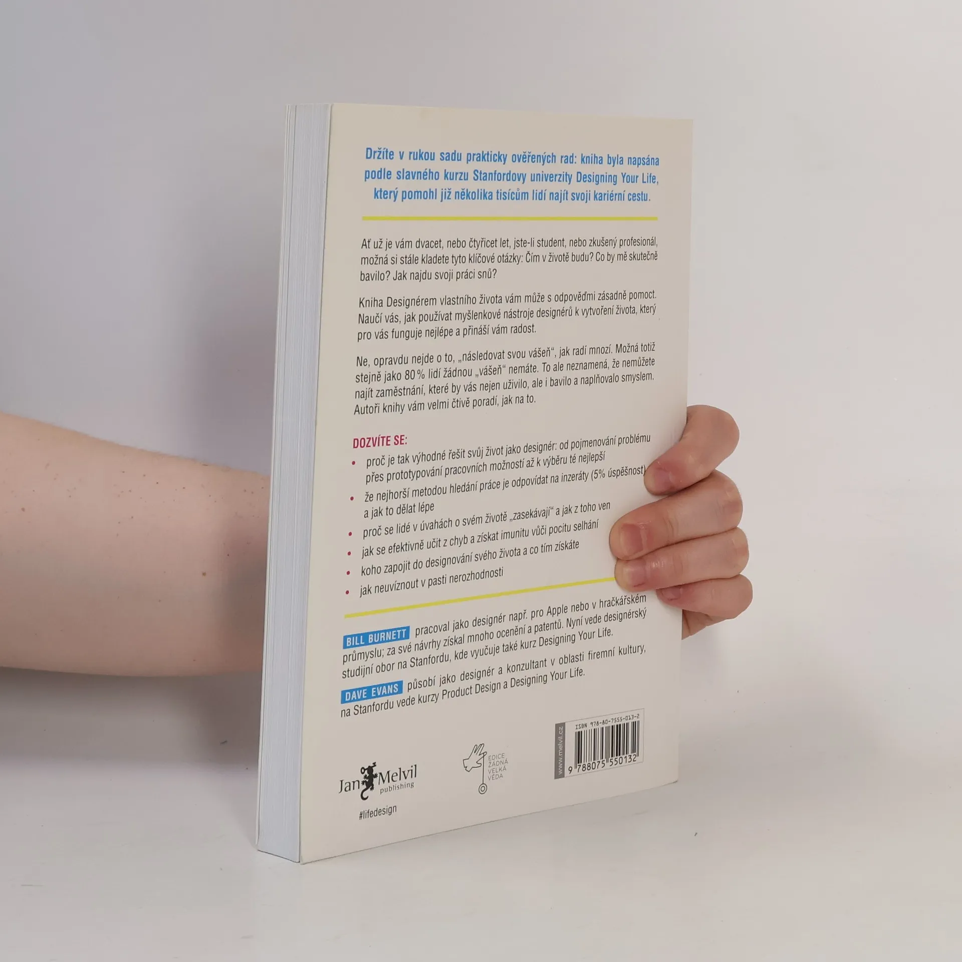 Jak si vybudovat naplňující a radostný život. Ať už jste mladí nebo starší, mnozí stále hledají odpověď na otázku, čím se stanou. Možná potřebujete pomoc při zjišťování svých cílů a způsobů, jak jich dosáhnout. Bill Burnett a Dave Evans navazují na svůj úspěšný kurz Life Design na Stanfordově univerzitě, který pomohl tisícům lidí – od studentů po důchodce – najít novou budoucnost. Jejich metoda vás naučí používat designérské nástroje k vytvoření života, jaký si představujete. Nejde o to „následovat svou vášeň“, pokud ji zatím nemáte. Designéři řeší problémy pomocí designérského myšlení. Vše kolem nás, od technologií po produkty, bylo navrženo s cílem vyřešit konkrétní problém. Autoři ukazují, jak nám toto myšlení může pomoci vytvořit smysluplný život, bez ohledu na naši minulost nebo věk. Designérské myšlení, které stojí za úžasnými inovacemi, lze využít k budování kariéry a naplňujícího života, který je kreativní, produktivní a plný překvapení. Tato kniha nevyřeší vaše problémy, to musíte udělat sami, ale může vás inspirovat k většímu úsilí při práci na lepším životě.