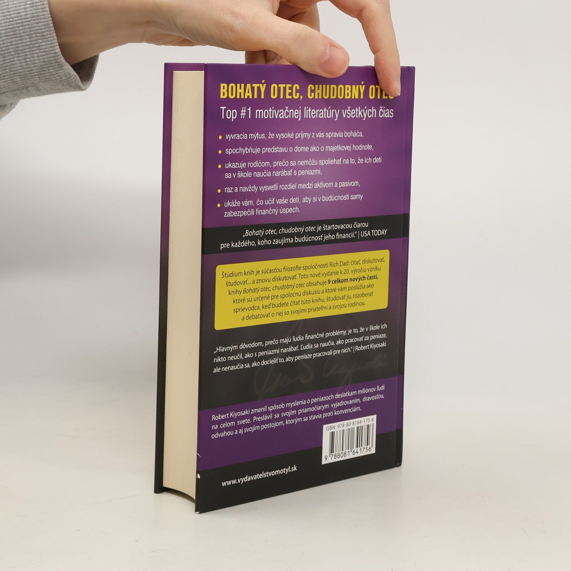 BOHATÝ OTEC, CHUDOBNÝ OTEC vyvracia mýtus, že vysoké príjmy z vás spravia boháča, spochybňuje predstavu o dome ako o majetkovej hodnote, ukazuje rodičom, prečo sa nemôžu spoliehať na to, že ich deti sa v škole naučia narábať s peniazmi, raz a navždy vysvetlí rozdiel medzi aktívom a pasívom, ukáže vám, čo učiť vaše deti, aby si v budúcnosti samy zabezpečili finančný úspech. Štúdium kníh je súčasťou filozofie spoločnosti Rich Dad: čítať, diskutovať, študovať... a znovu diskutovať. Toto nové, štvrté, vydanie k 20. výročiu vzniku knihy Bohatý otec, chudobný otec obsahuje 9 celkom nových častí, ktoré sú určené pre spoločnú diskusiu a ktoré vám poslúžia ako sprievodca, keď budete čítať túto knihu, študovať ju, rozoberať a debatovať o nej so svojimi priateľmi a svojou rodinou. Robert Kiyosaki zmenil spôsob myslenia o peniazoch desiatkam miliónov ľudí na celom svete. Preslávil sa svojím priamočiarym vyjadrovaním, dravosťou, odvahou a aj svojím postojom, ktorým sa stavia proti konvenciám.