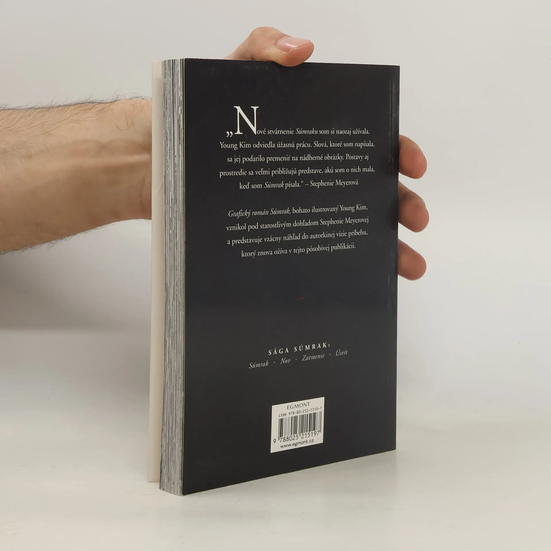 „Nové stvárnenie Súmraku som si ohromne užívala. Young odviedla úžasnú prácu. Slová, ktoré som napísala, sa jej podarilo premeniť na nádherné obrázky. Postavy aj prostredie sa veľmi približujú predstave, akú som o nich mala, keď som Súmrak písala.“ – Stephenie Meyerová Grafický román Súmrak, bohato ilustrovaný Young Kim, vznikol pod starostlivým dohľadom Stephenie Meyerovej a predstavuje vzácny náhľad do autorkinej vízie príbehu, ktorý znova ožíva v tejto pôsobivej publikácii.