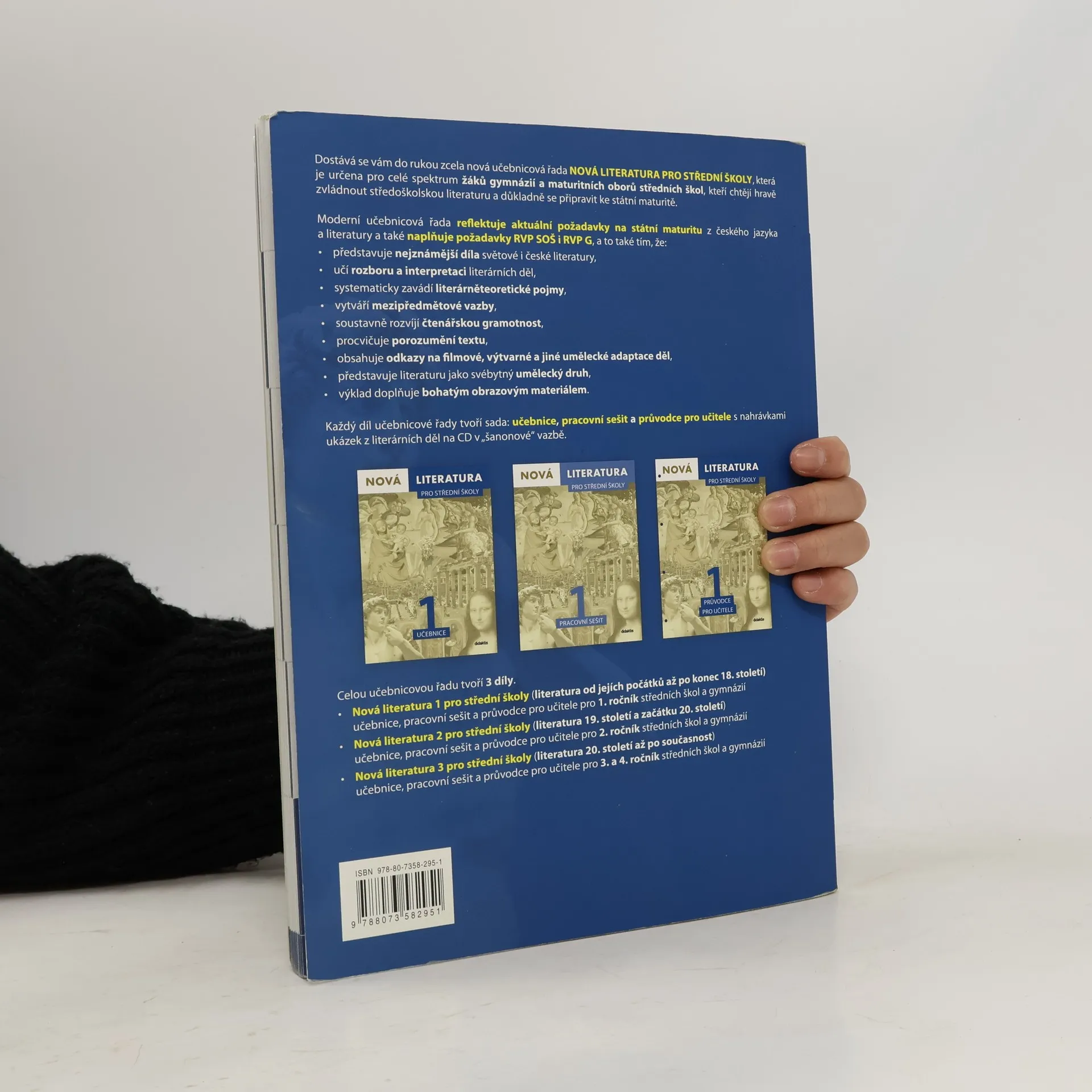 První díl učebnicové řady Nová literatura 1 pro střední školy je určen pro 1. ročník středních škol a gymnázií. Úvodní kapitola učebnice představuje žákům literaturu jako svébytný umělecký druh. Dále je učebnice řazena chronologicky a obsahuje učivo od nejstarších písemných památek po literaturu 18. století. Poslední kapitola učebnice zavádí základní literárněteoretické pojmy užívané při interpretaci děl. Učebnicové texty naplňují požadavky rámcových vzdělávacích programů a již od 1. ročníku soustavně připravují středoškoláky ke státní maturitě z předmětu český jazyk a literatura. Výjimečnost učebnicové sady Nová literatura 1 pro střední školy spočívá zejména v tom, že: * učí rozboru a interpretaci literárních děl, která se často vyskytují na školních seznamech literárních děl k maturitě; * systematicky seznamují studenty se základními literárněteoretickými pojmy, které jsou využívány k interpretaci děl; * rozvíjí čtenářskou gramotnost a soustavně procvičuje porozumění textu; * představuje historické pozadí doby vzniku literárního díla, uvádí žáka do kontextu doby a rozvíjí tak mezipředmětové vazby; * doplňuje učebnicové texty bohatým obrazovým materiálem a odkazy na filmové adaptace literárních děl. Orientaci v učebnici usnadňuje výborné grafické zpracování. Učebnicový text je rozdělen podle typu předkládaných informací do odpovídajících výkladových bloků a postranních rámečků.