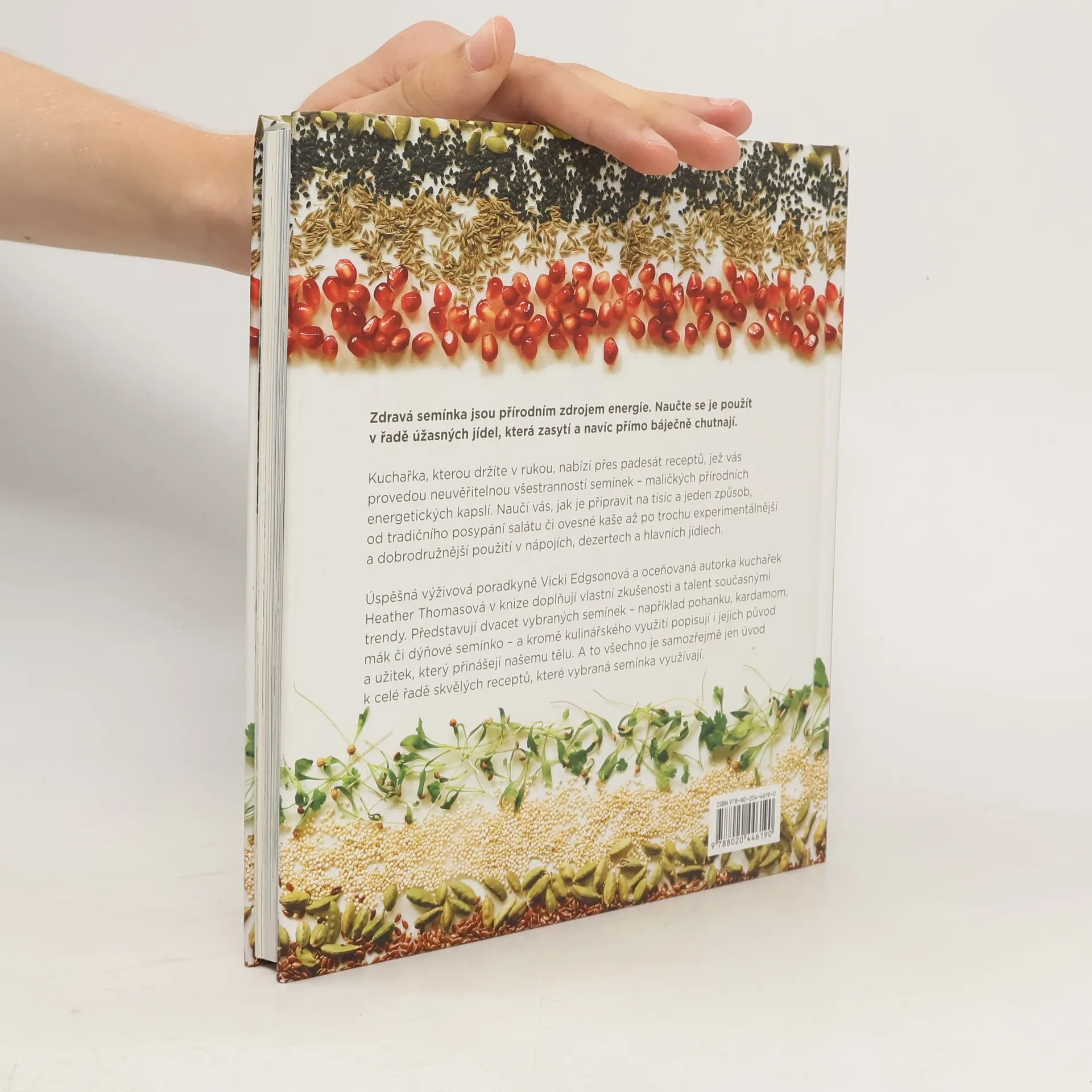 Kuchařka nabízí přes padesát receptů, které provedou neuvěřitelnou všestranností semínek – maličkých přírodních energetických kapslí. Naučí, jak je připravit na tisíc a jeden způsob, od tradičního posypání salátu či ovesné kaše až po trochu experimentálnější a dobrodružnější použití v nápojích, dezertech a hlavních jídlech. Úspěšná výživová poradkyně Vicki Edgsonová a oceňovaná autorka kuchařek Heather Thomasová v knize doplňují vlastní zkušenosti a talent současnými trendy. Představují dvacet vybraných semínek – například pohanku, kardamom, mák či dýňové semínko – a kromě kulinářského využití popisují i jejich původ a užitek, který přinášejí našemu tělu. A to všechno je samozřejmě jen úvod k celé řadě skvělých receptů, které vybraná semínka využívají.