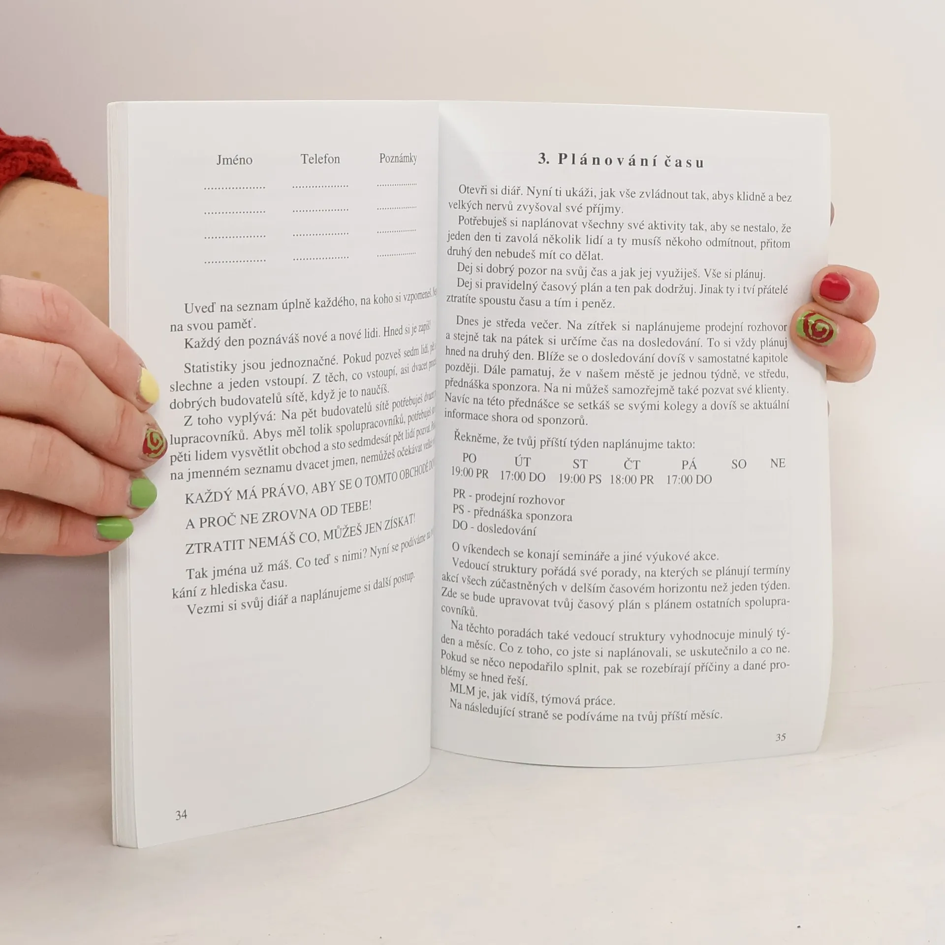 Od počátku mého působení v multi - level marketingu (dále jen MLM) slýchávám o problémech, které mají lidé vstupující do našeho obchodu. I já jsem měl, ale po delší době jsem zjistil, že jsem si je vytvářel sám. Dělal jsem to tak dlouho, až mi má sponzorka řekla: "V MLM můžeš najít jen tři věci: 1. PROBLÉMY 2. VÝMLUVY 3. PENÍZE. Co chceš? Vyber si." Má odpověď byla jasná: "Chci peníze!" "Potom zapomeň na první dvě věci a dobře mě poslouchej. Nedělej problémy a nedovol to ani druhým. Nevymýšlej si žádné výmluvy, vše u nás děláš dobrovolně a neposlouchej ani výmluvy druhých. Raději se jich zeptej, zda je někdo nutí. A začni už konečně se mnou vydělávat peníze. Já tě to naučím! To co tě naučím, ty budeš pak učit dál své spolupracovníky. Pak s nimi budeš učit jejich další kolegy a....a tak dál."