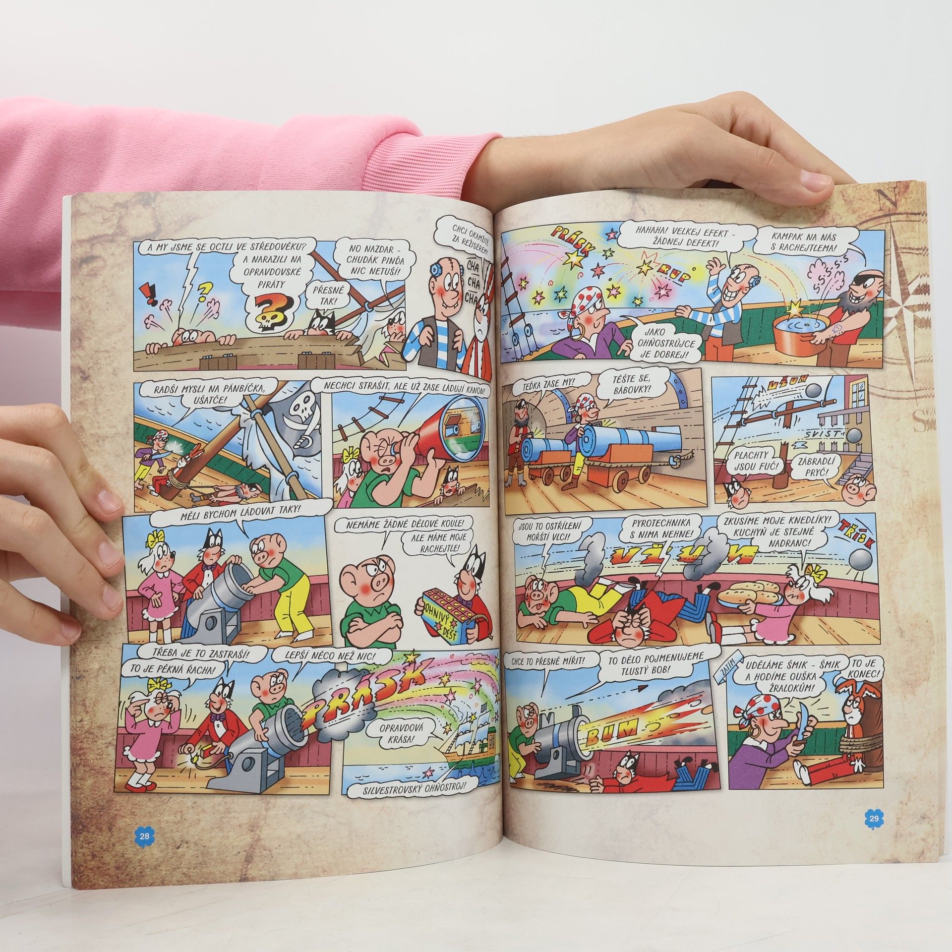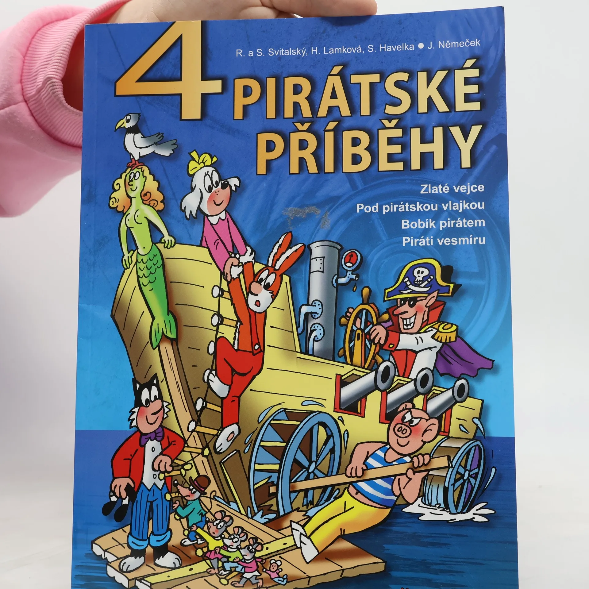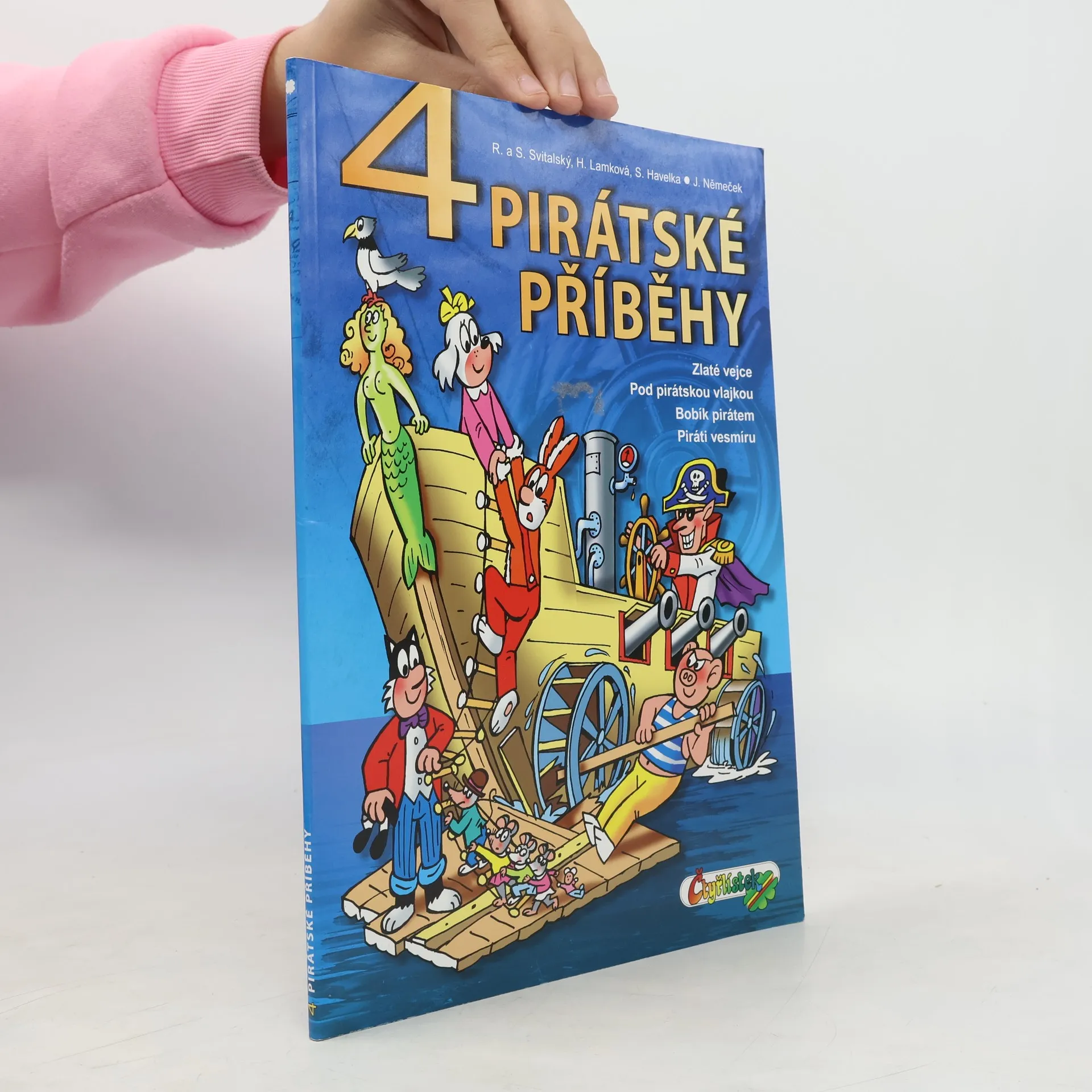 Další knížka z úspěšné knižní EDICE 4. ZLATÉ VEJCE -Čtyřlístek objeví pirátský poklad a zachrání dvě nešťastné pohádkové bytosti. POD PIRÁTSKOU VLAJKOU - Při natáčení historického filmu se ČTYŘLÍSTEK dostane do časové smyčky a střetne se s opravdickými středověkými piráty. BOBÍK PIRÁTEM - Bobíka si novodobí piráti dokonce spletou s jedním z nich. PIRÁTI VESMÍRU - ve vesmíru narazí na piráty, kteří vyvážejí do kosmu odpad.
