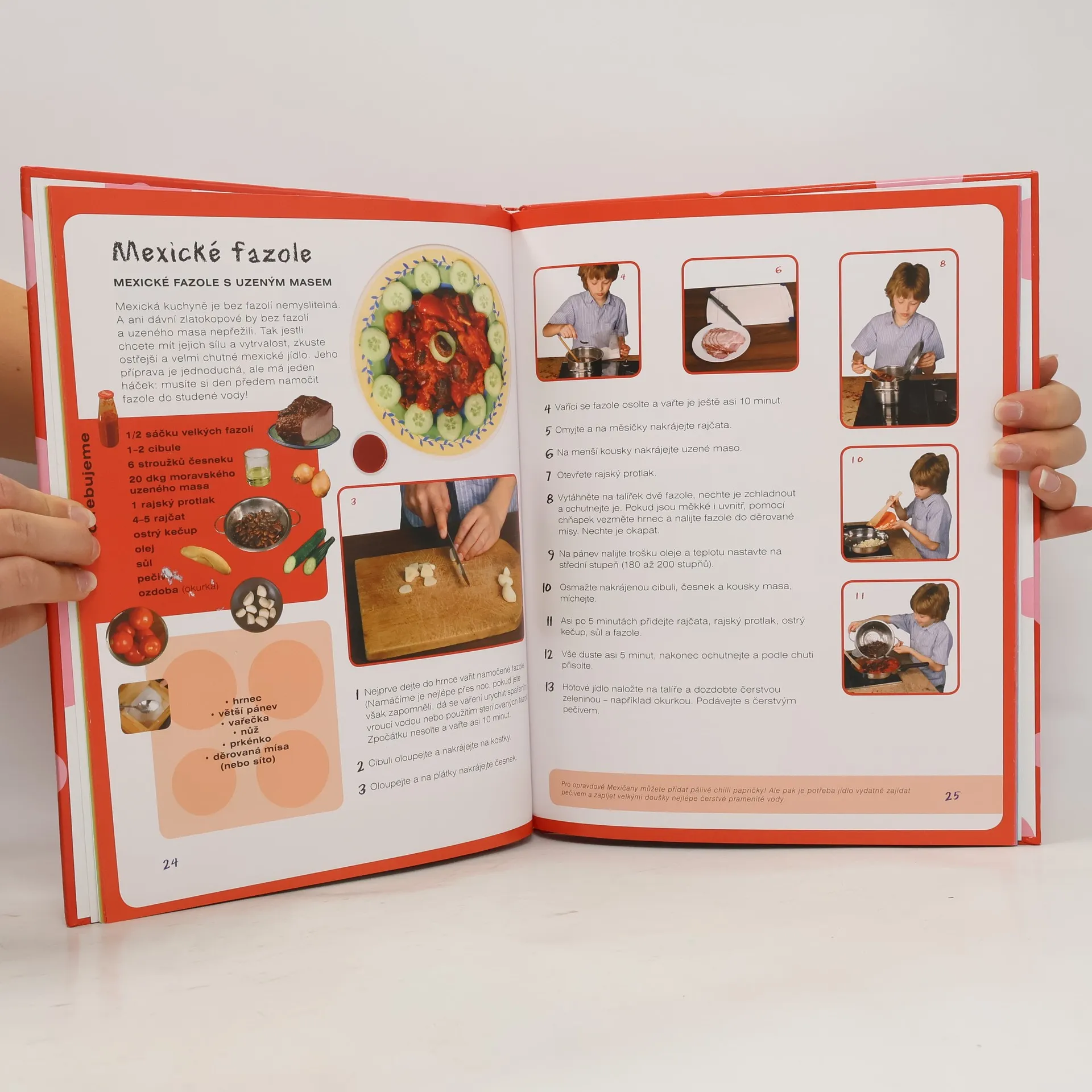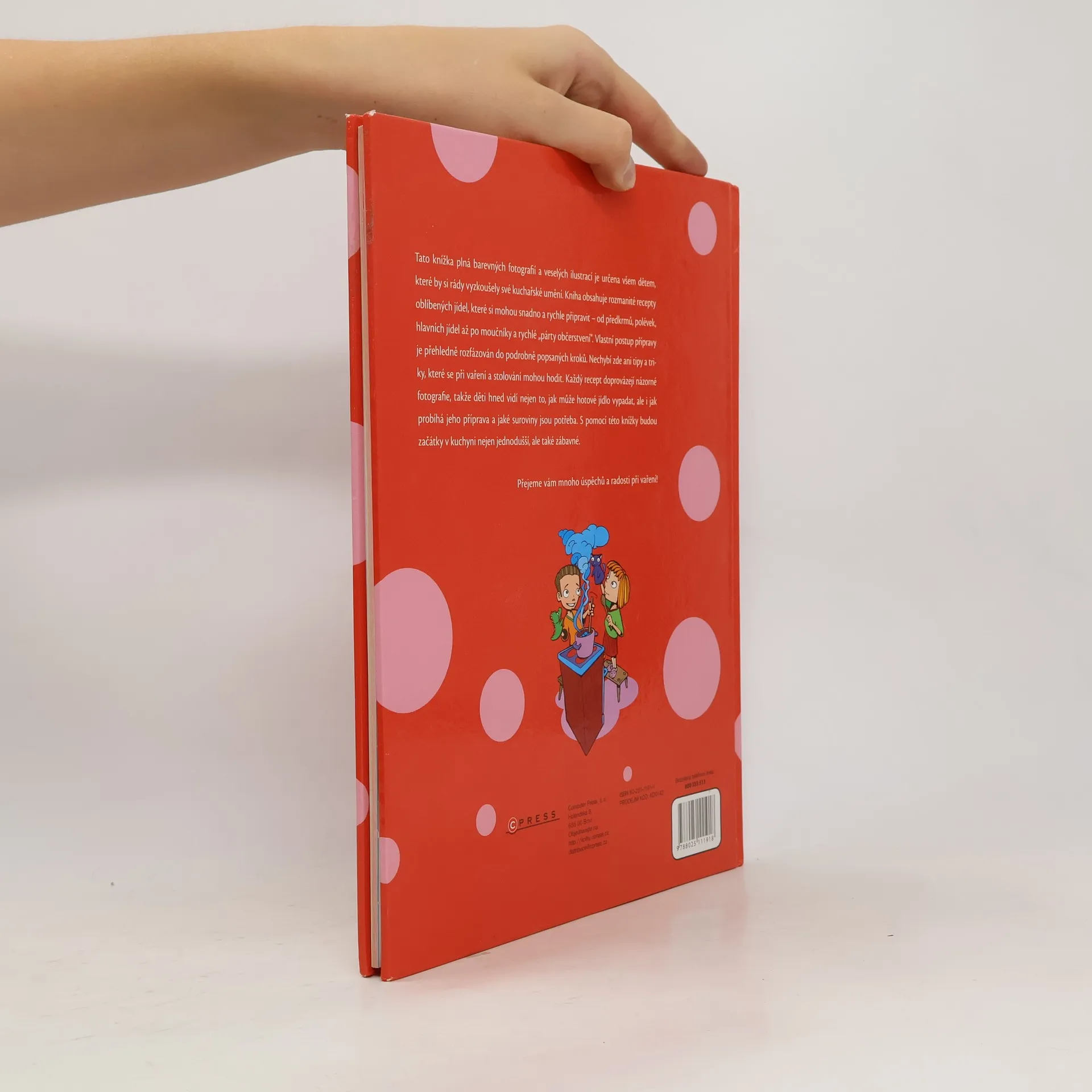 Tato knížka plná barevných fotografií a veselých ilustrací je určena všem dětem, které by si rády vyzkoušely své kuchařské umění. Kniha obsahuje rozmanité recepty oblíbených jídel, které si mohou snadno a rychle připravit - od předkrmů, polévek, hlavních jídel až po moučníky a rychlé "párty občerstvení." Vlastní postup přípravy je přehledně rozfázován do podrobně popsaných kroků. Nechybí zde ani tipy a triky, které se při vaření a stolování mohou hodit. Každý recept doprovázejí názorné fotografie, takže děti hned vidí nejen to, jak může hotové jídlo vypadat, ale i jak probíhá jeho příprava a jaké suroviny jsou potřeba. S pomocí této knížky budou začátky v kuchyni nejen jednodušší, ale také zábavné.