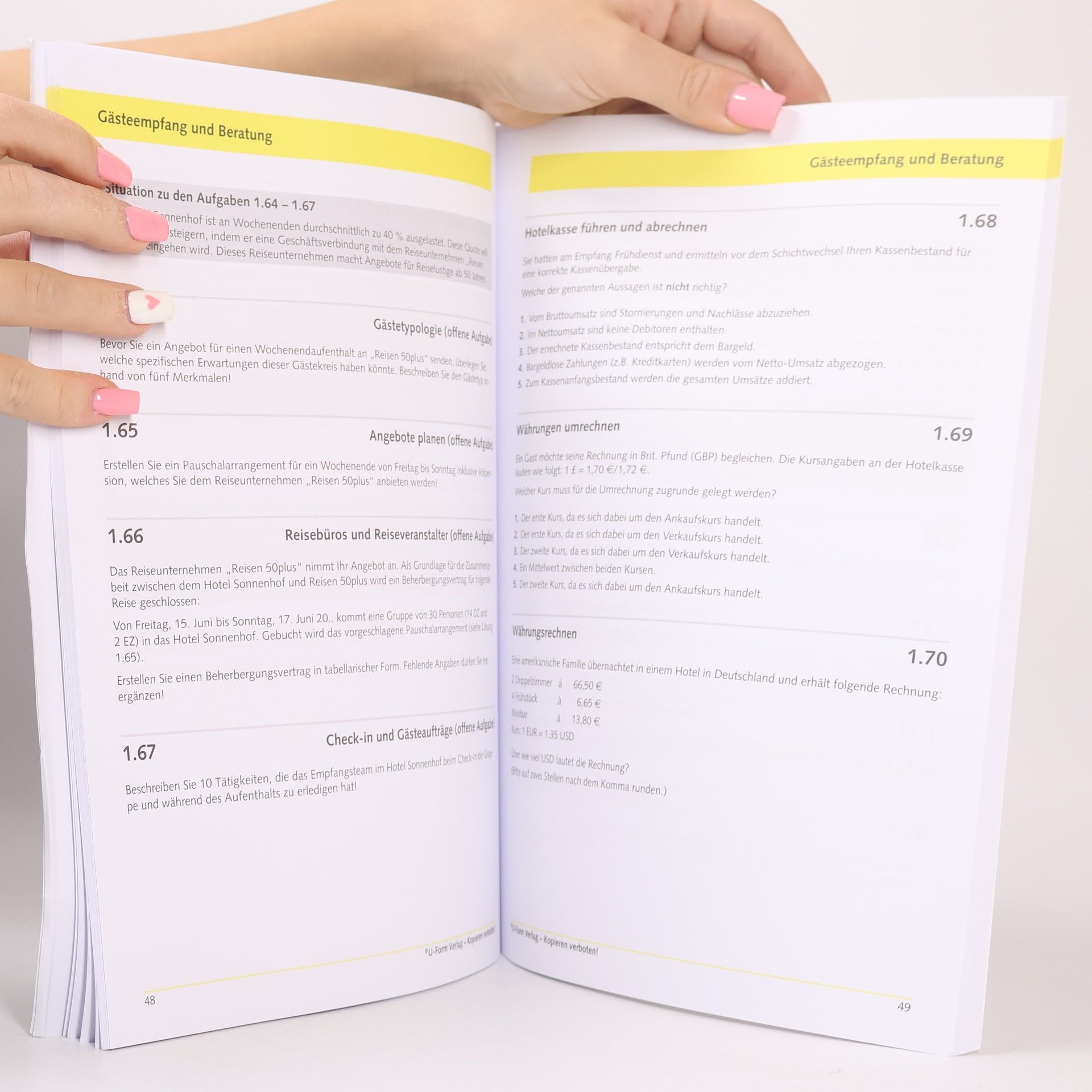 Den Erfolg zu GastMit einer guten IHK-Abschlussprüfung steht Ihnen die Welt offen und dem Erfolg nichts mehr im Weg. Den Anspruch, den Ihre Gäste an Sie stellen, sollten Sie daher auch an Ihre Prüfungsvorbereitung stellen. Wissen auf den Punkt gebracht, gut erklärt, prüfungsnah und immer aktuell.* Gästeempfang und Betreuung* Marketing und Absatzorganisation* Wirtschafts- und SozialkundeDie U-Form Prüfungstrainer wirken sofort - auch wenn es mal wieder etwas schneller gehen muss. In nur einem Lernschritt testen und vertiefen Sie Ihr Wissen. Wissenslücken werden dank der erläuterten Lösungen sofort geschlossen. So gehen Sie gut vorbereitet in die Prüfung.Ihre * Zeit sparen - In einem Wissen testen, vertiefen & erweitern* Mehr wissen - durch die gut erklärten Lösungen* Zielgerichtet lernen -Inhalte & Aufgaben wie in der IHK Prüfung* Erfolg haben - wie Tausende Azubis vor Ihnen