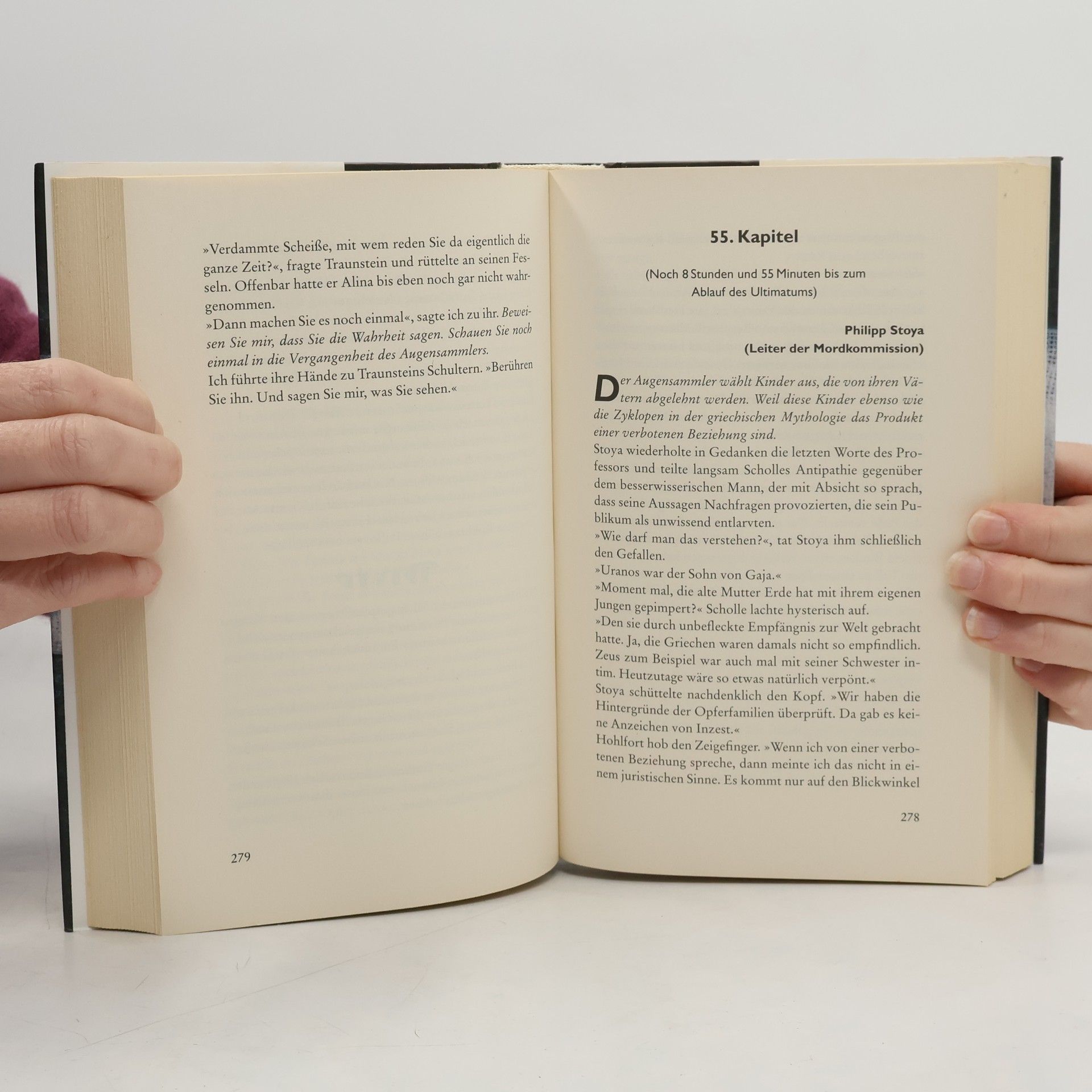 Er spielt das älteste Spiel der Welt: Verstecken. Er spielt es mit deinen Kindern. Er gibt dir 45 Stunden, sie zu finden. Doch deine Suche wird ewig dauern. Erst tötet er die Mutter, dann verschleppt er das Kind und gibt dem Vater 45 Stunden Zeit für die Suche. Das ist seine Methode. Nach Ablauf der Frist stirbt das Opfer in seinem Versteck. Doch damit ist das Grauen nicht vorbei: Den aufgefundenen Kinderleichen fehlt jeweils das linke Auge. Bislang hat der „Augensammler“ keine brauchbare Spur hinterlassen. Da meldet sich eine mysteriöse Zeugin: Alina Gregoriev, eine blinde Physiotherapeutin, die behauptet, durch bloße Körperberührungen in die Vergangenheit ihrer Patienten sehen zu können. Und gestern habe sie womöglich den Augensammler behandelt …