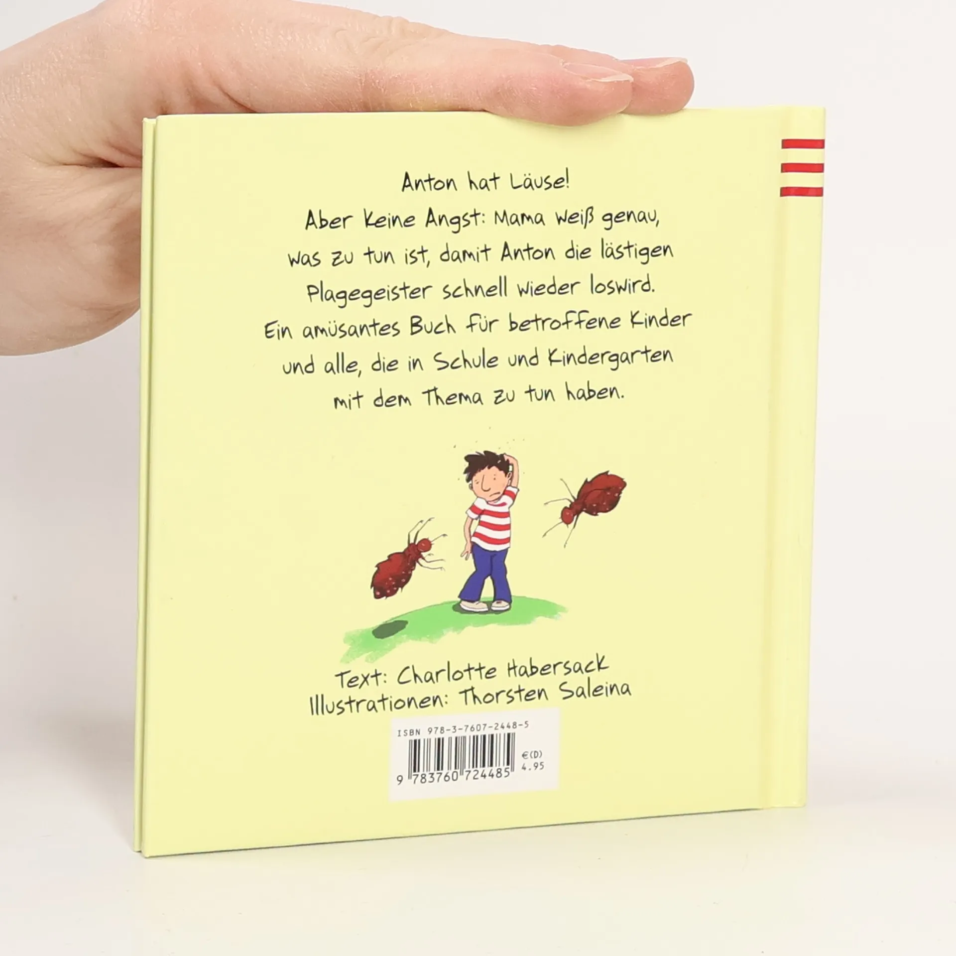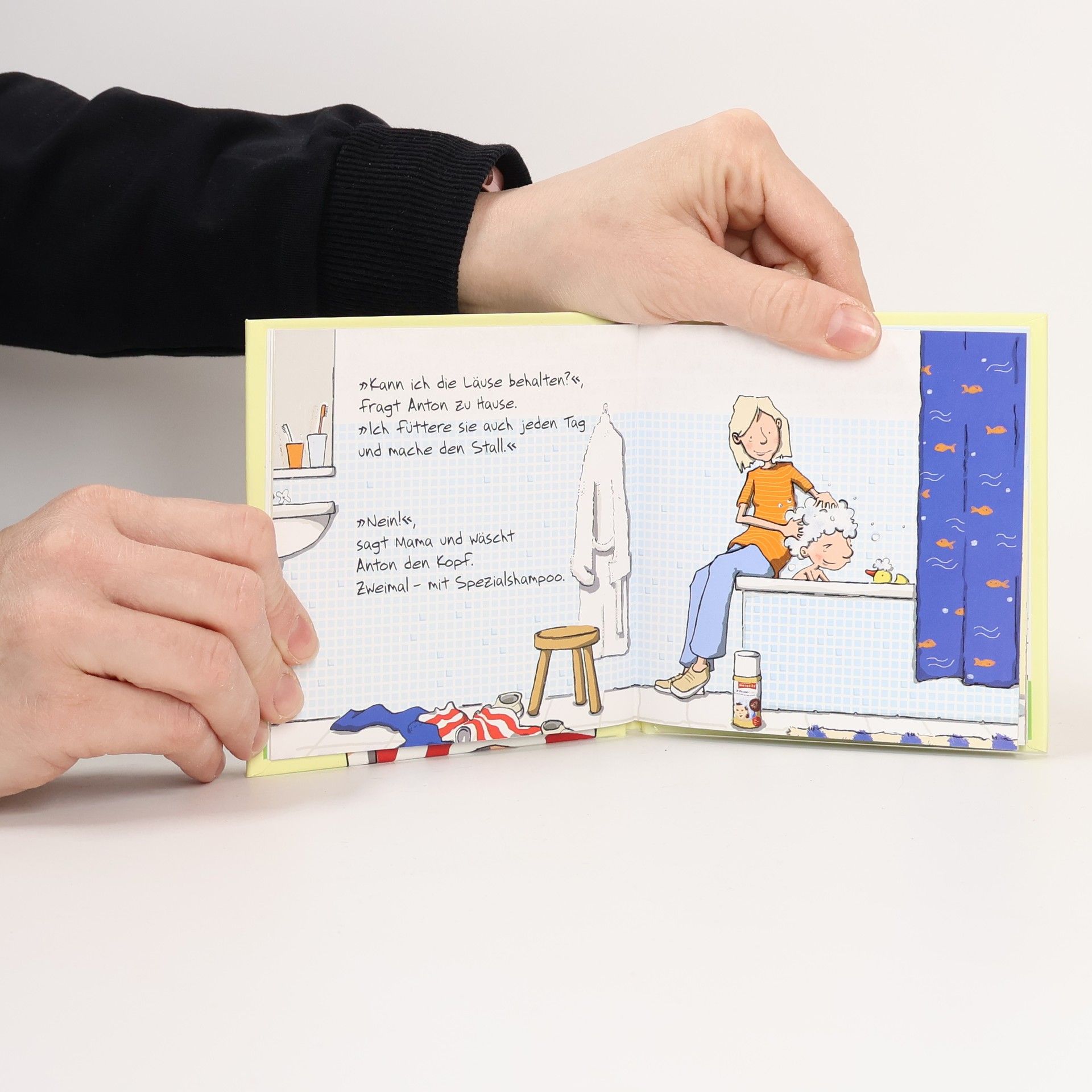Das Buch erklärt in kurzen Texten und witzigen Bildern, was alles getan werden muss, wenn man Läuse hat. Vom Haarewaschen, über das Einsprühen der Kuscheltiere, bis zum Saugen des ganzen Hauses. Puh, Antons Kopf juckt unglaublich und Marie sieht genau, warum: Anton hat Läuse! Erst findet er das eklig. Aber seine Mama rückt den ungebetenen Gästen auf den Pelz. Der Fahrradhelm wird gereinigt, der Kopf wird mit Spezialshampoo geschrubbt und sogar Antons Kuscheltiere werden entlaust. Ein lustig erzähltes »Trostpflaster«, das am besten schon vor dem Läusealarm zum Einsatz kommt.