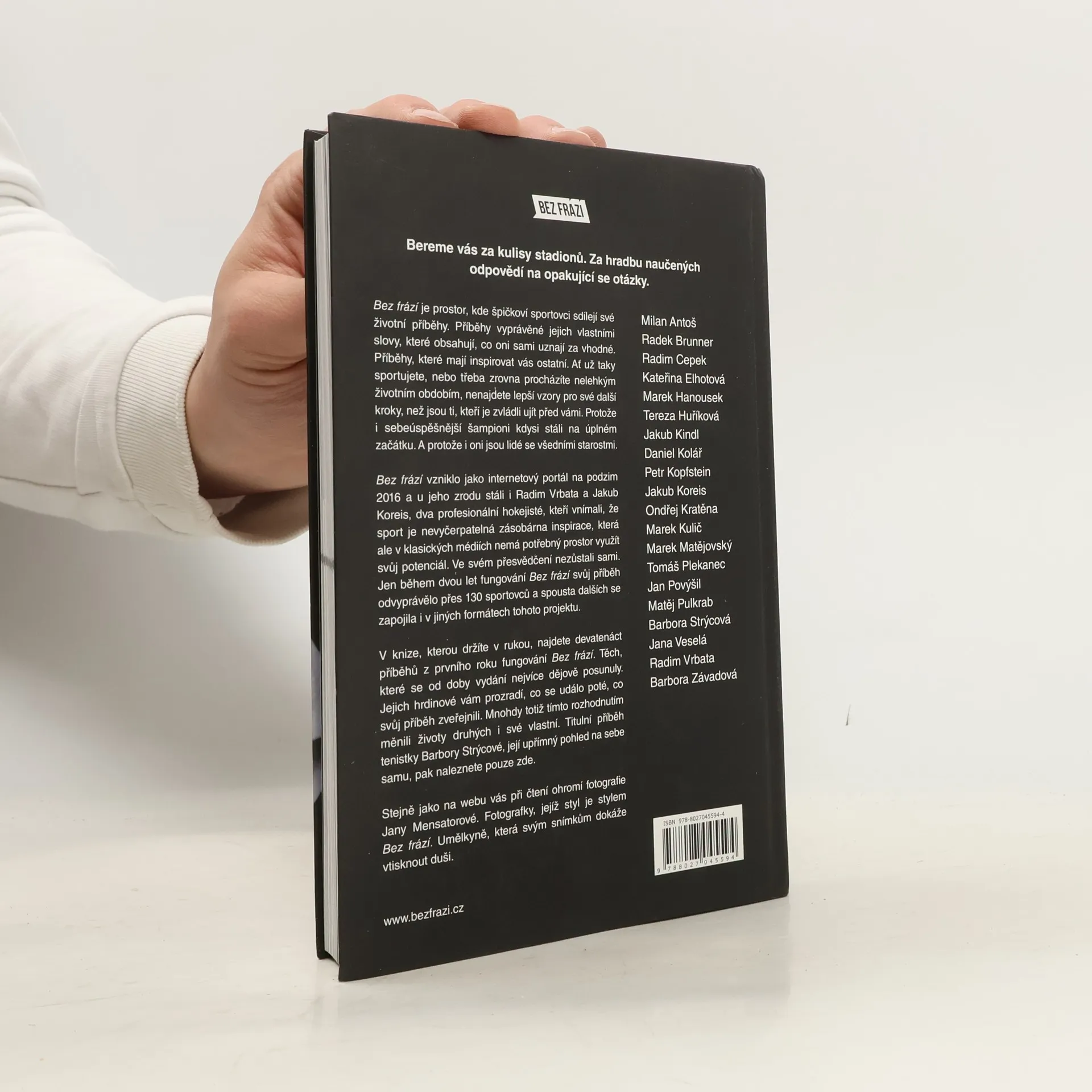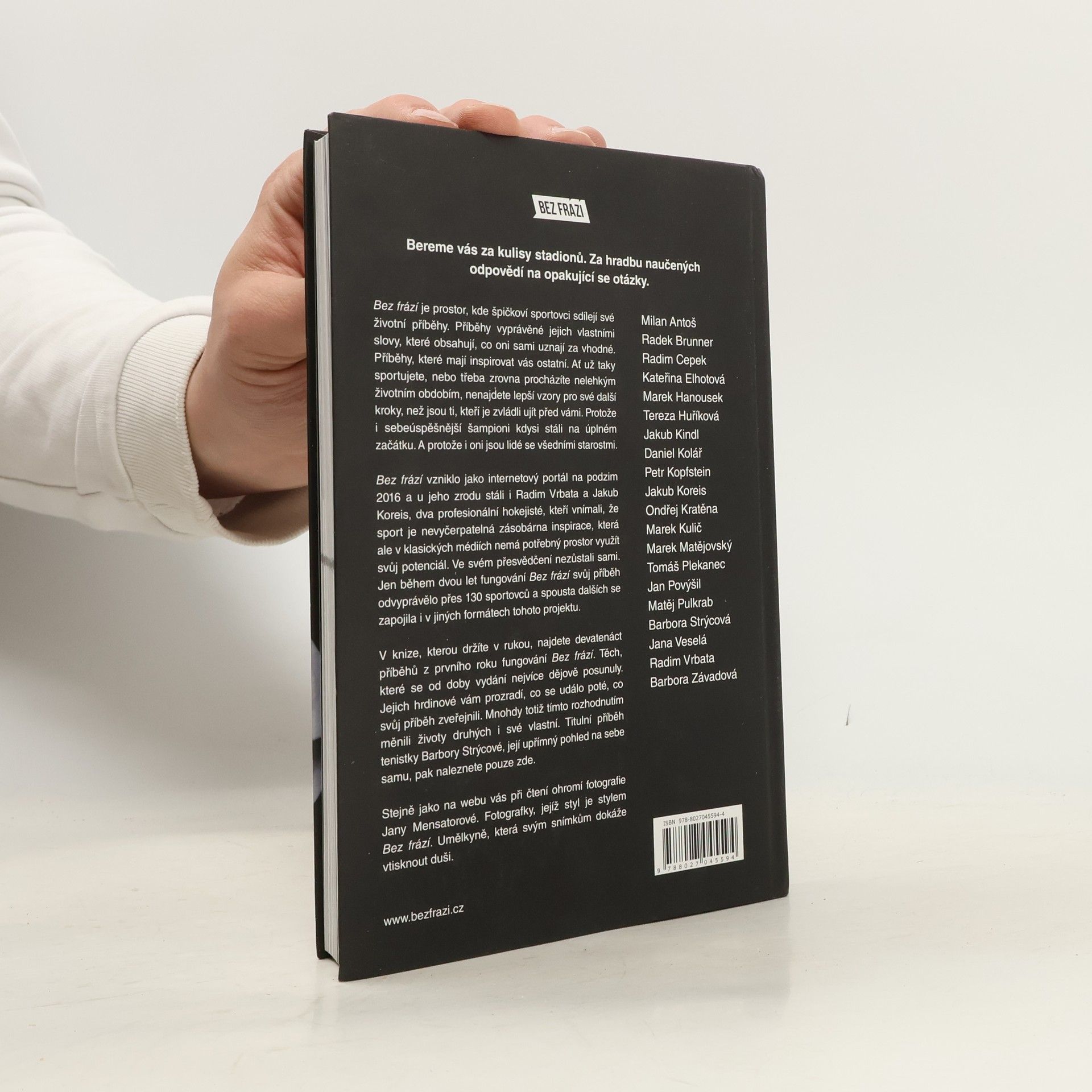 Bereme vás za kulisy stadionů, za hradbu naučených odpovědí na opakující se otázky. Bez frází je prostor, kde špičkoví sportovci sdílejí své životní příběhy vlastními slovy. Tyto příběhy mají inspirovat ostatní, ať už sportujete nebo procházíte těžkým obdobím. I ti nejúspěšnější šampioni kdysi stáli na začátku a mají běžné starosti. Bez frází vzniklo jako internetový portál na podzim 2016, kdy Radim Vrbata a Jakub Koreis, profesionální hokejisté, cítili, že sport nabízí nevyčerpatelnou inspiraci, která v tradičních médiích nemá dostatečný prostor. Během dvou let se připojilo přes 130 sportovců, kteří sdíleli své příběhy a zapojili se do různých formátů projektu. V knize najdete devatenáct příběhů z prvního roku fungování, které se od doby vydání výrazně posunuly. Hrdinové vám prozradí, co se stalo po zveřejnění jejich příběhů, často měnících životy druhých i jejich vlastní. Titulní příběh tenistky Barbory Strýcové nabízí její upřímný pohled na sebe samu. Čtení doprovázejí fotografie Jany Mensatorové, jejíž styl dokonale vystihuje podstatu Bez frází.