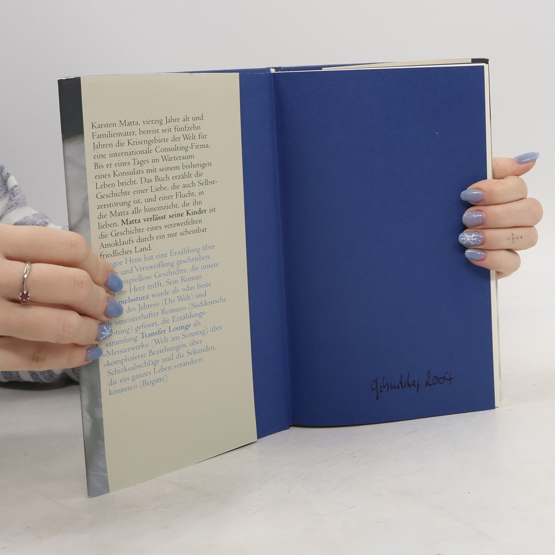 Karsten Matta, vierzig Jahre alt und Familienvater, bereist seit fünfzehn Jahren die Krisengebiete der Welt für eine internationale Consulting-Firma. Bis er eines Tages im Warteraum eines Konsulats mit seinem bisherigen Leben bricht. Das Buch erzählt die Geschichte einer Liebe, die auch Selbstzerstörung ist, und einer Flucht, in die Matta alle hineinzieht, die ihn lieben. Matta verlässt seine Kinder ist die Geschichte eines verzweifelten Amoklaufs durch ein nur scheinbar friedliches Land. Gregor Hens hat einen Roman über Liebe und Verzweiflung geschrieben, eine beispiellose Geschichte, die unsere Zeit ins Herz trifft. Sein Roman Himmelssturz wurde als „das beste Debüt des Jahres“ (Die Welt) und als „meisterhafter Roman“ (Süddeutsche Zeitung) gefeiert, die Erzählungssammlung Transfer Lounge als „Meisterwerk (...) über (...) die Wonnen und den Schrecken der Liebe.“ (Welt am Sonntag)