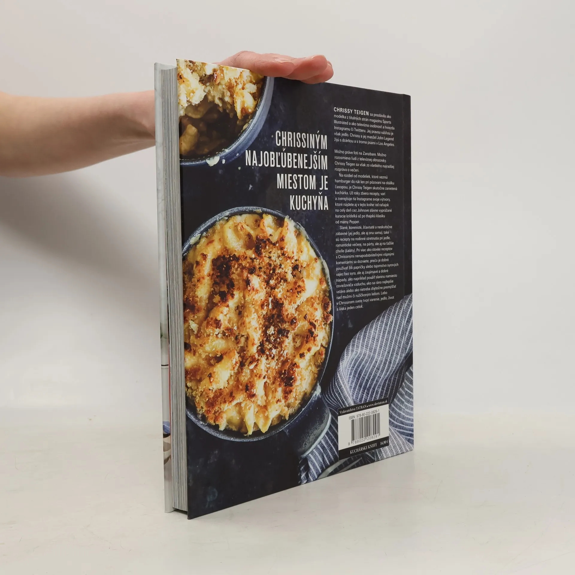 Chrissy Teigen sa preslávila ako modelka z titulných strán magazínu Sports Illustrated a ako televízna osobnosť a hviezda Instagramu či Twitteru. Jej pravou vášňou je však jedlo. Chrissy a jej manžel John Legend žijú s dcérkou a s troma psami v Los Angeles. Možno práve fotí na Zanzibare. Možno rozosmieva ľudí z televíznej obrazovky. Chrissy Teigen sa však zo všetkého najradšej rozpráva o večeri. Na rozdiel od modeliek, ktoré vezmú hamburger do rúk len pri pózovaní na obálku časopisu, je Chrissy Teigen skutočne zanietená kuchárka. Už roky zbiera recepty, varí a zverejňuje na Instagrame svoje výtvory, ktoré nájdete aj v tejto knihe: od raňajok na celý deň cez Johnove slávne vyprážané kuracie krídelká až po thajskú klasiku od mamy Pepper. Slané, korenisté, šťavnaté a neskutočne zábavné (jej jedlo, ale aj ona sama), také sú recepty na rodinné stretnutia pri jedle, romantické večere, na párty, ale aj na ťažšie chvíle (šaláty). Pri viac ako stovke receptov s Chrissinými nenapodobniteľnými vtipnými komentármi sa dozviete, prečo je dobré používať čili papričky alebo tajomstvo syrových vajec bez syra, ale aj zaujímavé a dobré nápady, ako napríklad použiť slaninu namiesto osviežovača vzduchu, ako sa ráno najlepšie vstáva alebo ako netreba zbytočne premýšľať nad mužmi či ružičkovým kelom. Lebo v Chrissinom svete tvorí varenie, jedlo, život a láska jeden celok.