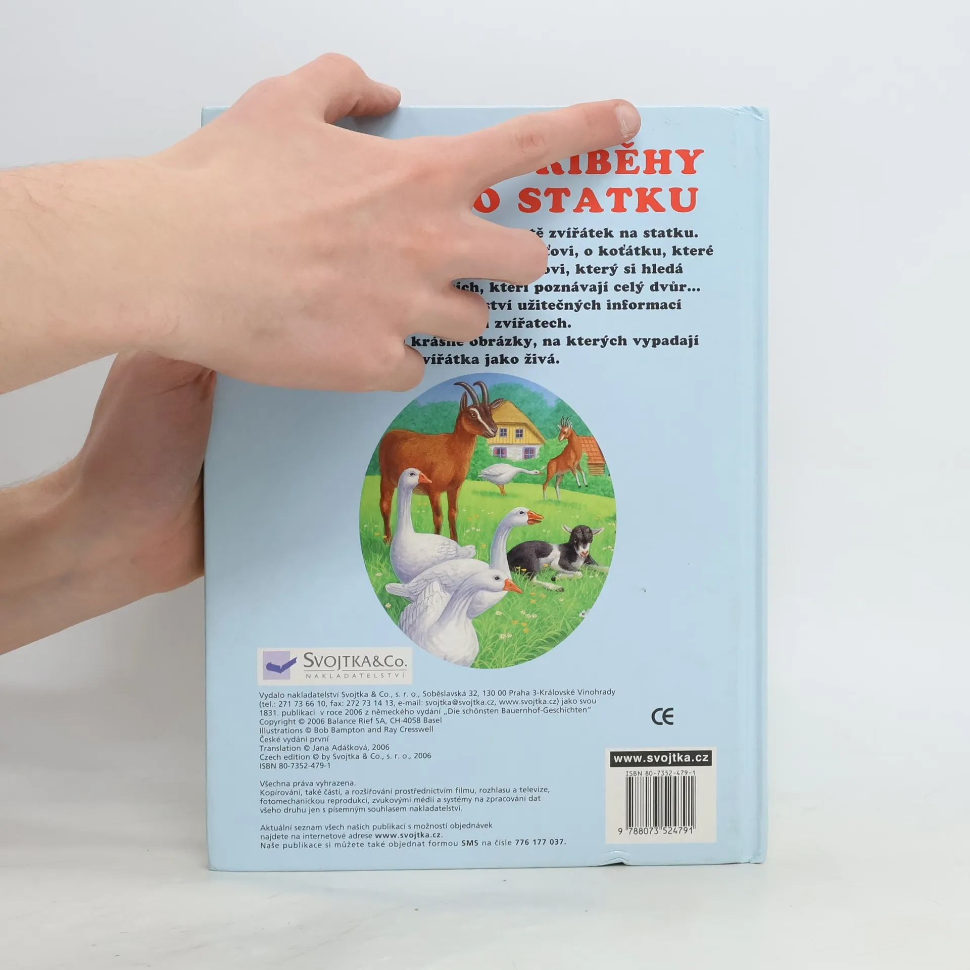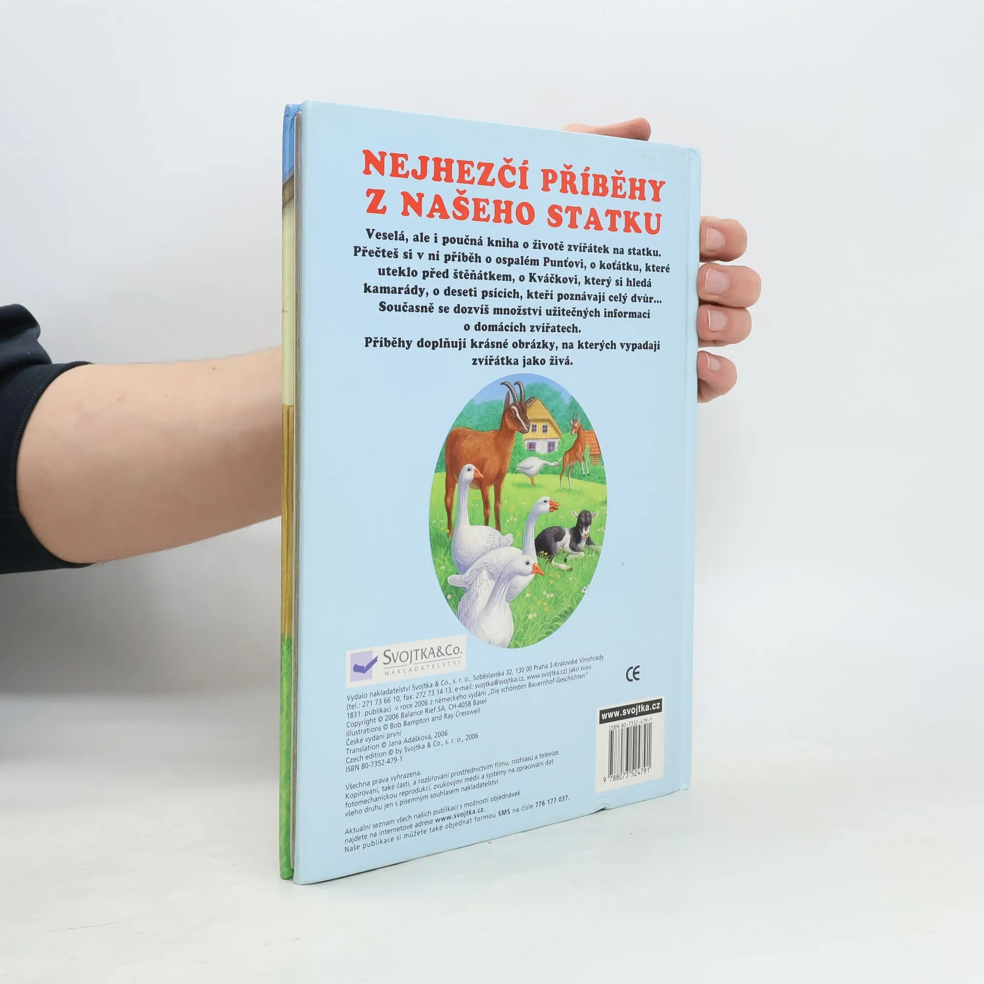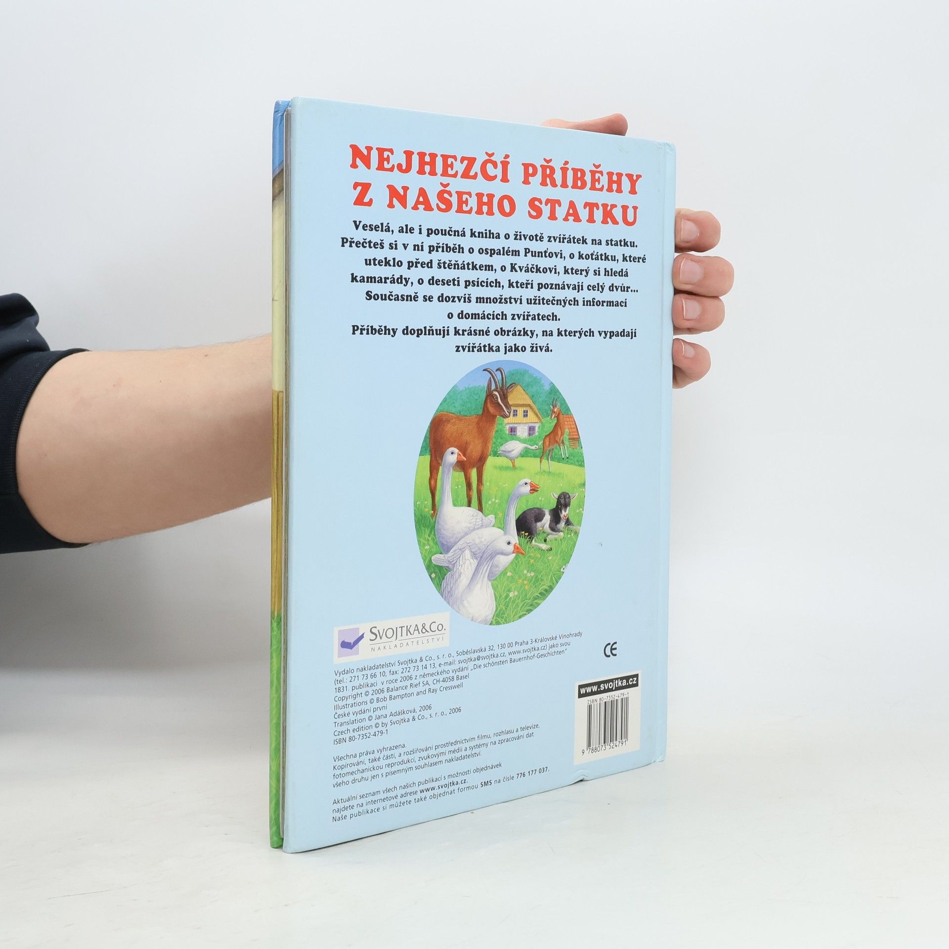 Tato kniha je veselá i poučná a seznámí nás se životem zvířátek na statku. Přečtete si v ní příběh o ospalém Punťovi, o koťátku, které uteklo před štěňátkem, o Kváčkovi, který si hledá kamarády, o deseti psících, kteří poznávají celý dvůr… Současně se dozvíte množství užitečných informací o domácích zvířatech. Příběhy doplňují krásné obrázky, na kterých vypadají zvířátka jako živá.