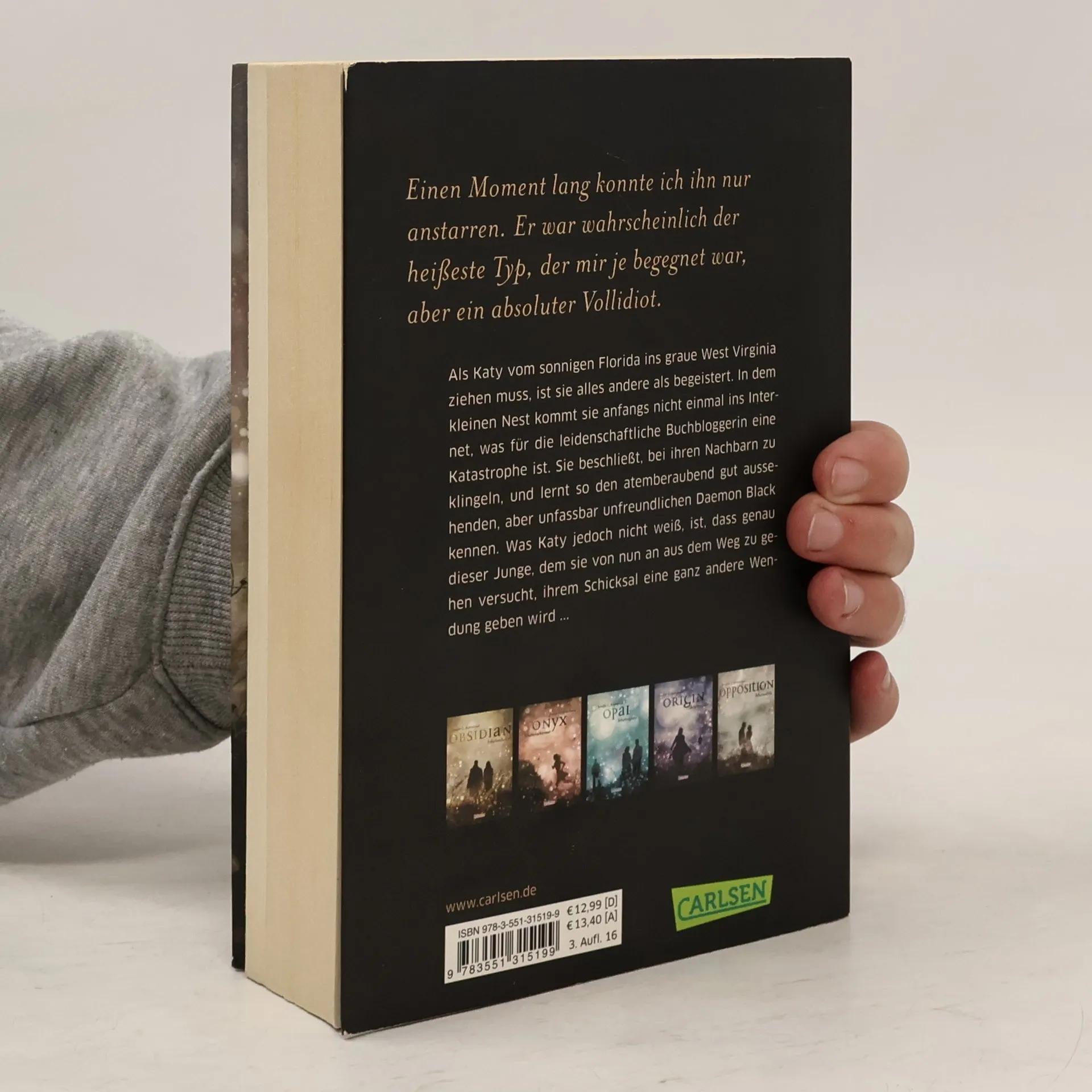 Als Katy vom sonnigen Florida ins graue West Virginia ziehen muss, ist sie alles andere als begeistert. In dem kleinen Nest kommt sie anfangs nicht einmal ins Internet, was für die leidenschaftliche Buchbloggerin eine Katastrophe ist. Sie beschließt, bei ihren Nachbarn zu klingeln, und lernt so den atemberaubend gut aussehenden, aber unfassbar unfreundlichen Daemon Black kennen. Was Katy jedoch nicht weiß, ist, dass genau dieser Junge, dem sie von nun an aus dem Weg zu gehen versucht, ihrem Schicksal eine ganz andere Wendung geben wird … Dies ist der erste Band der Obsidian-Serie von Jennifer L. Armentrout. Alle Bände der unwiderstehlichen Bestsellerserie: Obsidian. SchattendunkelOnyx. SchattenschimmerOpal. SchattenglanzOrigin. SchattenfunkeOpposition. Schattenblitz Alle Bände der dazugehörigen Oblivion-Serie:Oblivion 1: Lichtflüstern (Obsidian aus Daemons Sicht erzählt)Oblivion 2: Lichtflimmern (Onyx aus Daemons Sicht erzählt)Oblivion 3: Lichtflackern (Opal aus Daemons Sicht erzählt) Alle bisher erschienenen Bände der Spin-off-Serie »Revenge«:Revenge. SternensturmRebellion. SchattensturmRedemption. Nachtsturm