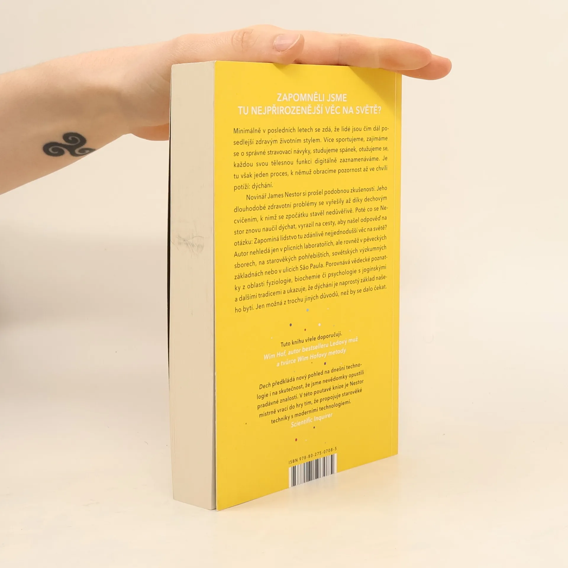 Nádech, výdech a znovu. Zapomněli jsme tu nejpřirozenější věc na světě? Minimálně v posledních letech se zdá, že lidé jsou čím dál posedlejší zdravým životním stylem. Více sportujeme, zajímáme se o správné stravovací návyky, studujeme spánek, otužujeme se, každou tělesnou funkci digitálně zaznamenáváme. Je tu však jeden proces, k němuž obracíme pozornost až ve chvíli potíží: dýchání. Novinář James Nestor si prošel podobnou zkušeností. Jeho dlouhodobé zdravotní problémy se vyřešily až díky dechovým cvičením, k nimž se zpočátku stavěl nedůvěřivě. Poté co se Nestor znovu naučil dýchat, vyrazil na cesty, aby našel odpověď na otázku: Zapomíná lidstvo tu zdánlivě nejjednodušší věc na světě? Autor nehledá jen v plicních laboratořích, ale rovněž u pěveckých sborů, na starověkých pohřebištích, sovětských výzkumných základnách nebo v ulicích Săo Paula. Porovnává vědecké poznatky z oblasti fyziologie, biochemie či psychologie s jogínskými a dalšími tradicemi a ukazuje, že dýchání je naprostý základ našeho bytí. Jen možná trochu jinak, než by se dalo čekat.