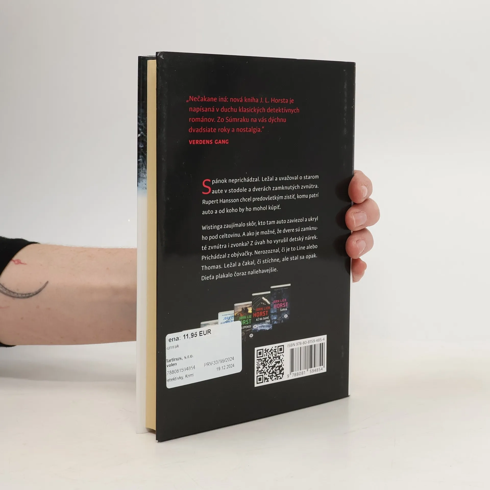Stavern 1983: Blížia sa Vianoce a husto sneží. Williamovi Wistingovi, mladému ambicióznemu policajnému strážnikovi, sa prednedávnom narodili dvojičky. Počas bankovej lúpeže sa náhle ocitne v centre dramatických udalostí. Vyšetrovania sa ujmú jeho skúsenejší kolegovia. Keď ho kamarát požiada o priateľskú službu, nečakane sa dostane na stopu iného zločinu. Nielenže ide o nevyriešenú vraždu, ale navyše o nej doteraz nikto nič nevedel. V stodole, ktorú nik nepoužíva, stojí staré auto s dierami po guľkách. A mnohé naznačuje, že šofér odtiaľ nevyviazol živý. Prípad bude mať dopad na to, ako sa bude vyvíjať Wistingov policajný inštinkt. Bude ho formovať po zvyšok jeho kariéry a mnohé ho naučí. Okrem iného aj to, že v rodinách ostávajú a dedia sa nielen majetky, ale aj zločin, vina a bolesť. Najnovšia Horstova kniha Súmrak sa vracia na úvod celej detektívnej série s Williamom Wistingom, chronologicky sa odohráva ešte pred prvou knihou, ktorá vyšla pod názvom Kľúčový svedok.