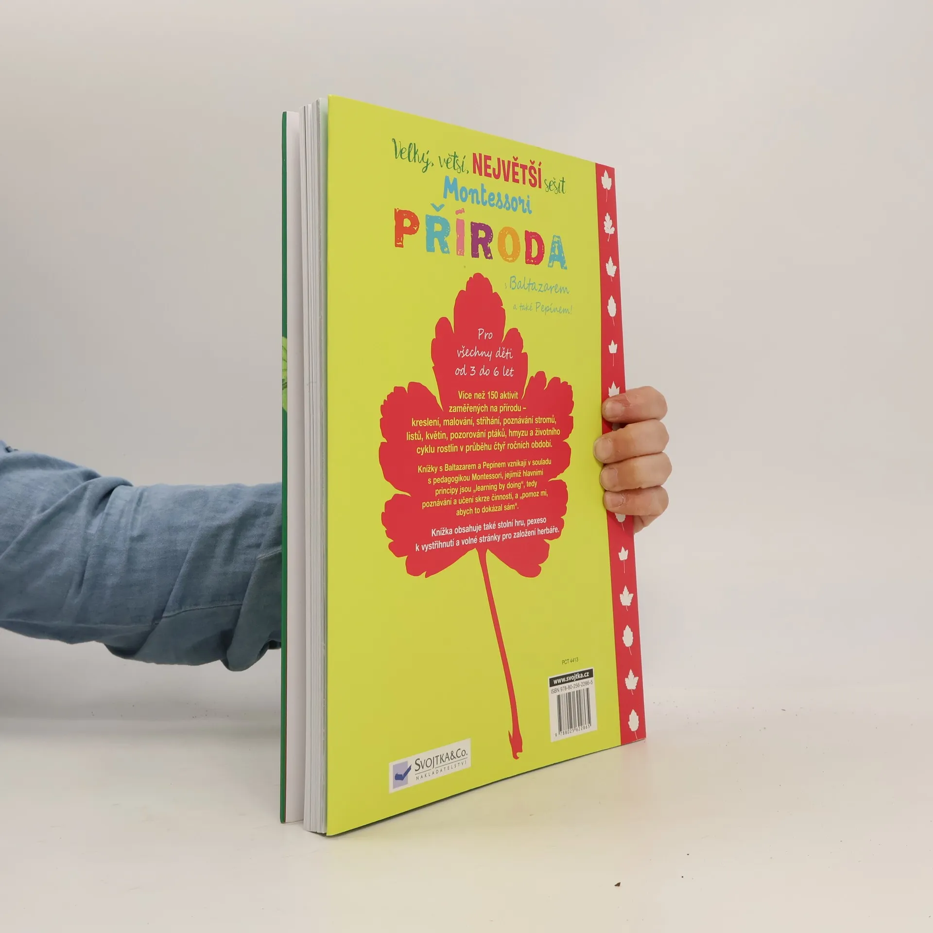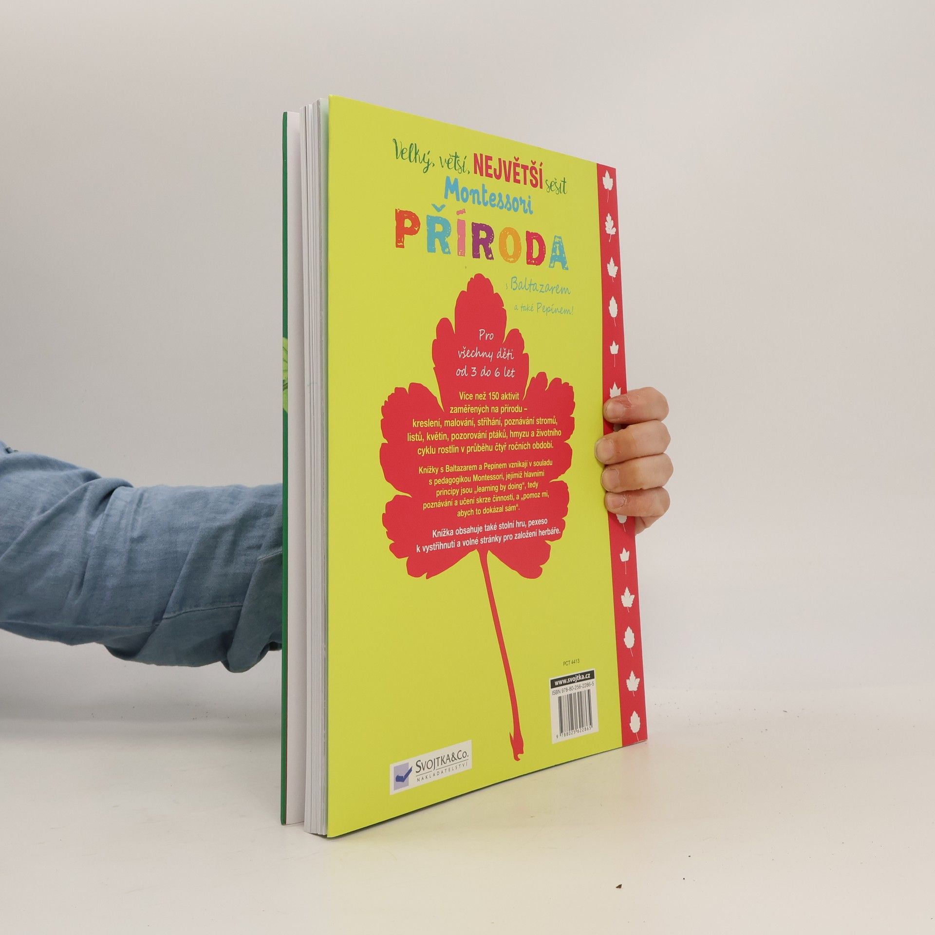 V tomto opravdu velkém sešitu na vás čeká více než 150 aktivit zaměřených na přírodu. Najdete zde kreslení, malování, stříhání, poznávání stromů, listů, květin, pozorování ptáků, hmyzu a životního cyklu rostlin v průběhu čtyř ročních období. Knížkou provázejí sympatické postavičky Baltazara a Pepína. Aktivity jsou vytvořené v souladu s pedagogikou Montessori, jejímiž hlavními principy jsou "learning by doing", tedy poznávání a učení skrze činnosti, a "pomoz mi, abych to dokázal sám" – citlivé vedení dětí k samostatnosti. Sešit obsahuje také stolní hru, pexeso k vystřihnutí a volné stránky pro založení herbáře. Pro všechny děti od tří do šesti let.