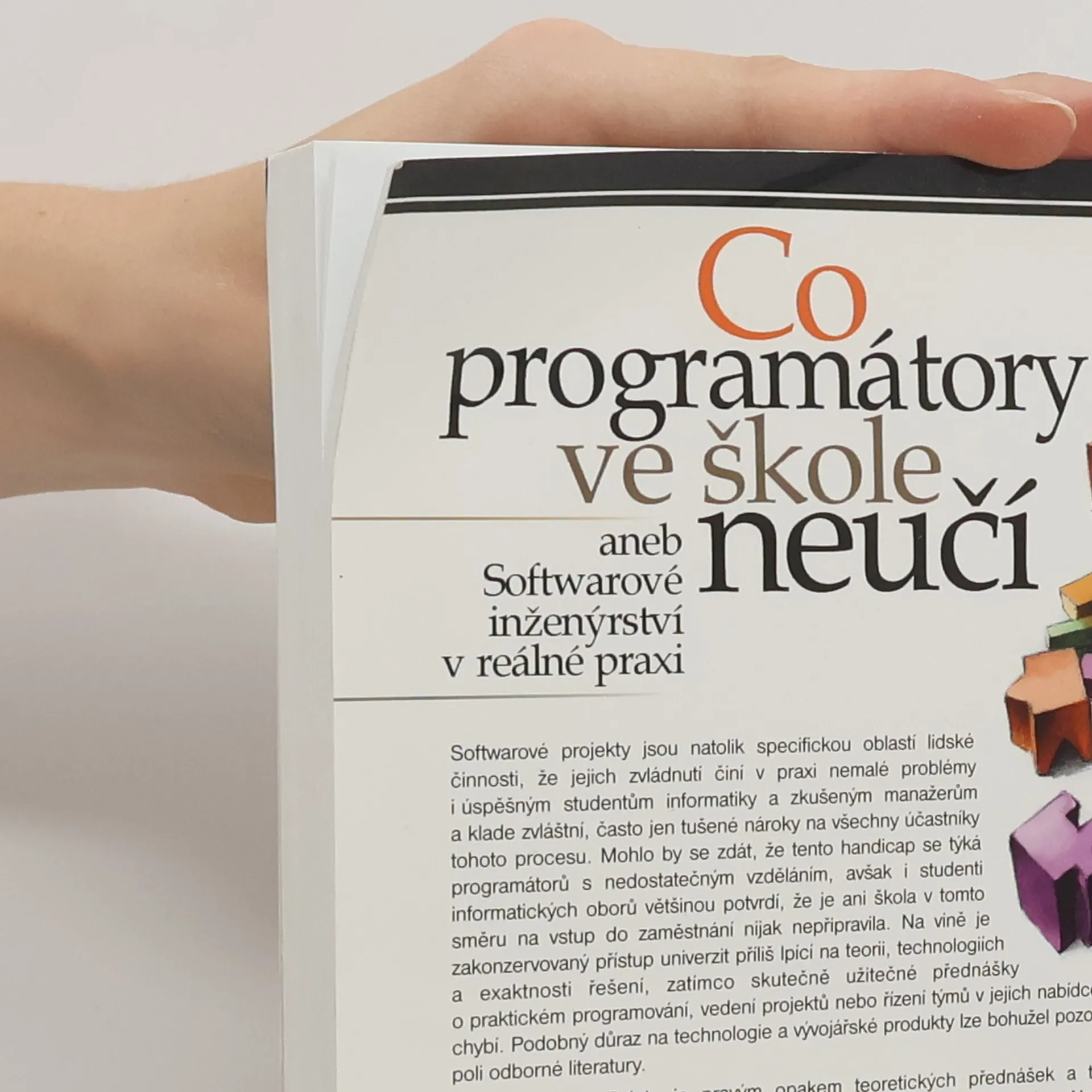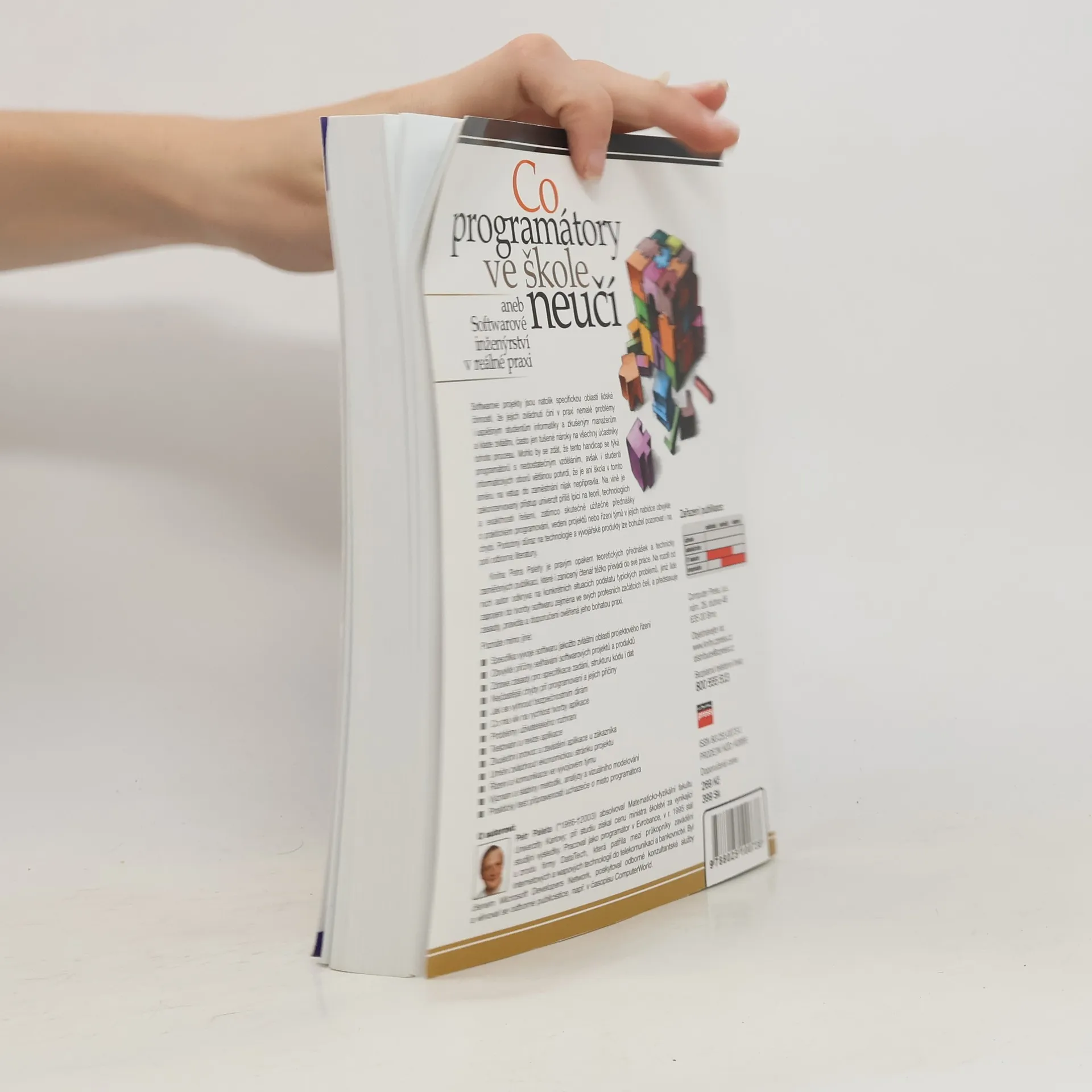 Softwarové projekty jsou natolik specifickou oblastí lidské činnosti, že jejich zvládnutí činí v praxi nemalé problémy i úspěšným studentům informatiky a zkušeným manažerům a klade zvláštní, často jen tušené nároky na všechny účastníky tohoto procesu. Mohlo by se zdát, že tento handicap se týká programátorů s nedostatečným vzděláním, avšak i studenti informatických oborů většinou potvrdí, že je ani škola v tomto směru na vstup do zaměstnání nijak nepřipravila. Na vině je zakonzervovaný přístup univerzit příliš lpící na teorii, technologiích a exaktnosti řešení, zatímco skutečně užitečné přednášky o praktickém programování, vedení projektů nebo řízení týmů v jejich nabídce obvykle chybí. Podobný důraz na technologie a vývojářské produkty lze bohužel pozorovat i na poli odborné literatury. Kniha Petra Palety je pravým opakem teoretických přednášek a technicky zaměřených publikací, které i zanícený čtenář těžko převádí do své práce. Na rozdíl od nich autor odkrývá na konkrétních situacích podstatu typických problémů, jimž lidé zapojení do tvorby softwaru zejména ve svých profesních začátcích čelí, a představuje zásady, pravidla a doporučení ověřená jeho bohatou praxí.