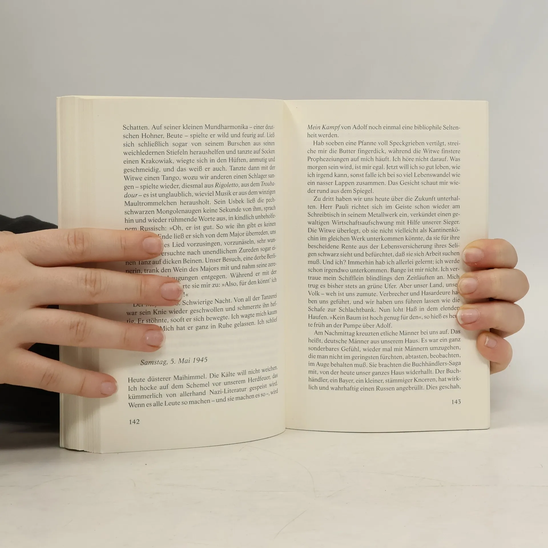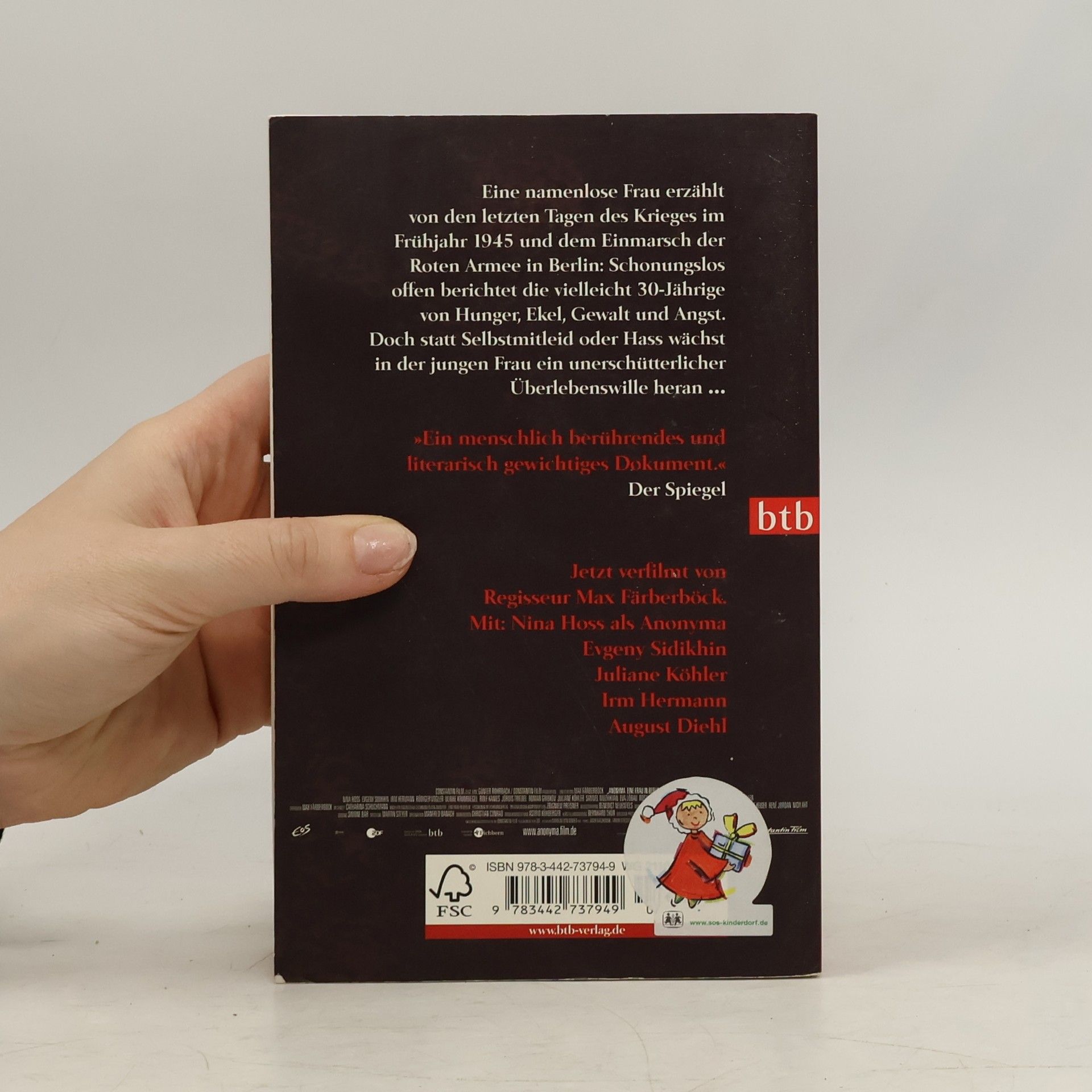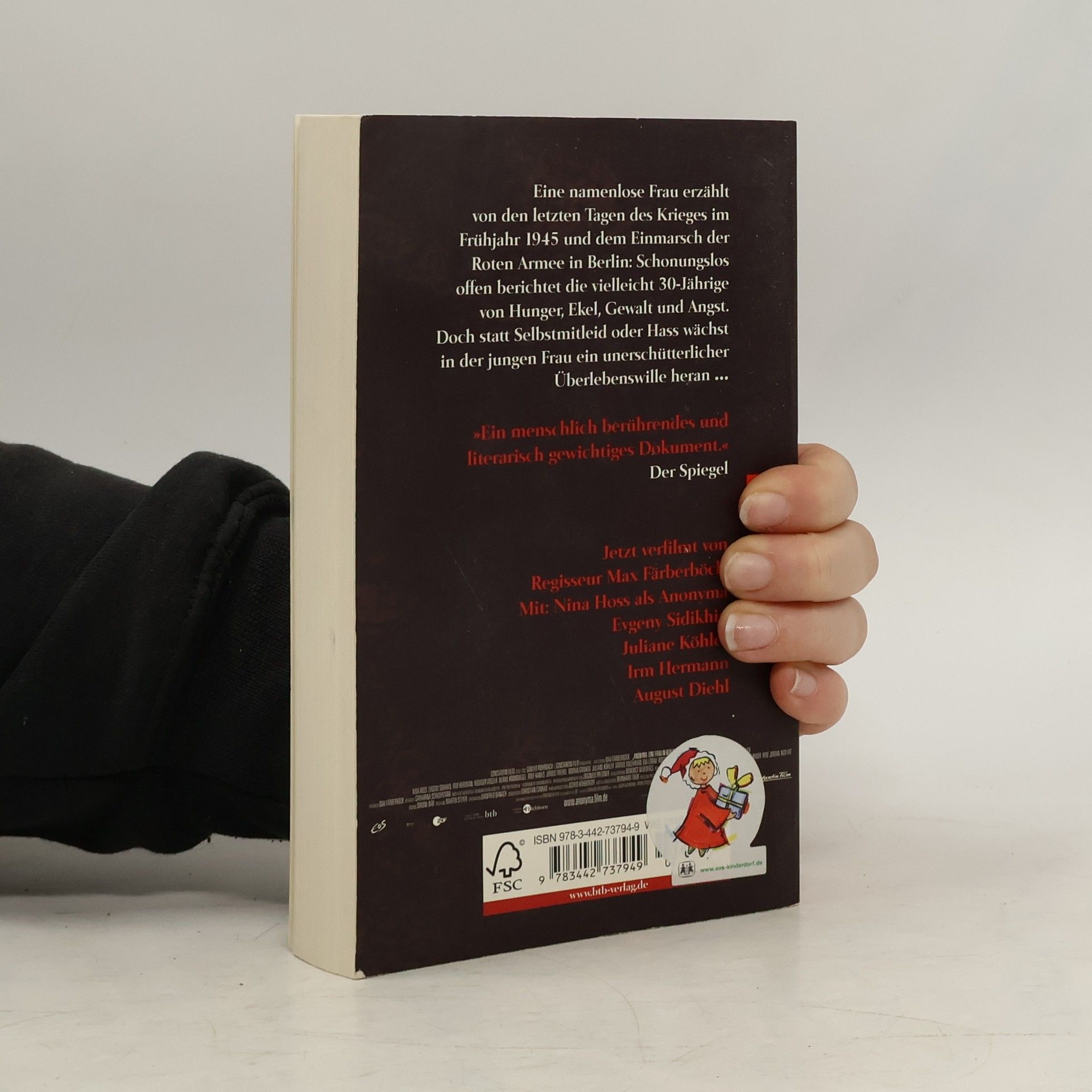 Die erschütternden Aufzeichnungen einer jungen Frau über die letzten Tage des Zweiten Weltkriegs in Berlin Eine namenlose Frau erzählt von den letzten Tagen des Krieges im Frühjahr 1945 und dem Einmarsch der Roten Armee in Berlin: Schonungslos offen und mit einem feinsinnigen Gespür für diese beispiellose Zeit berichtet die vielleicht 30-Jährige von Hunger, Ekel, Gewalt und Angst. Drei Schulhefte sind ihr geblieben, in die sie nun notiert, was ihr während des Tages und der Nacht widerfährt, und statt Selbstmitleid oder Hass wächst in der jungen Frau ein unerschütterlicher Überlebenswille heran. Das Filmereignis im Oktober 2008 - die Titelrolle spielt Nina Hoss, ihr Mann Gerd wird von August Diehl dargestellt. In weiteren Rollen spielen Sandra Hüller, Juliane Köhler und Jördis Triebel.