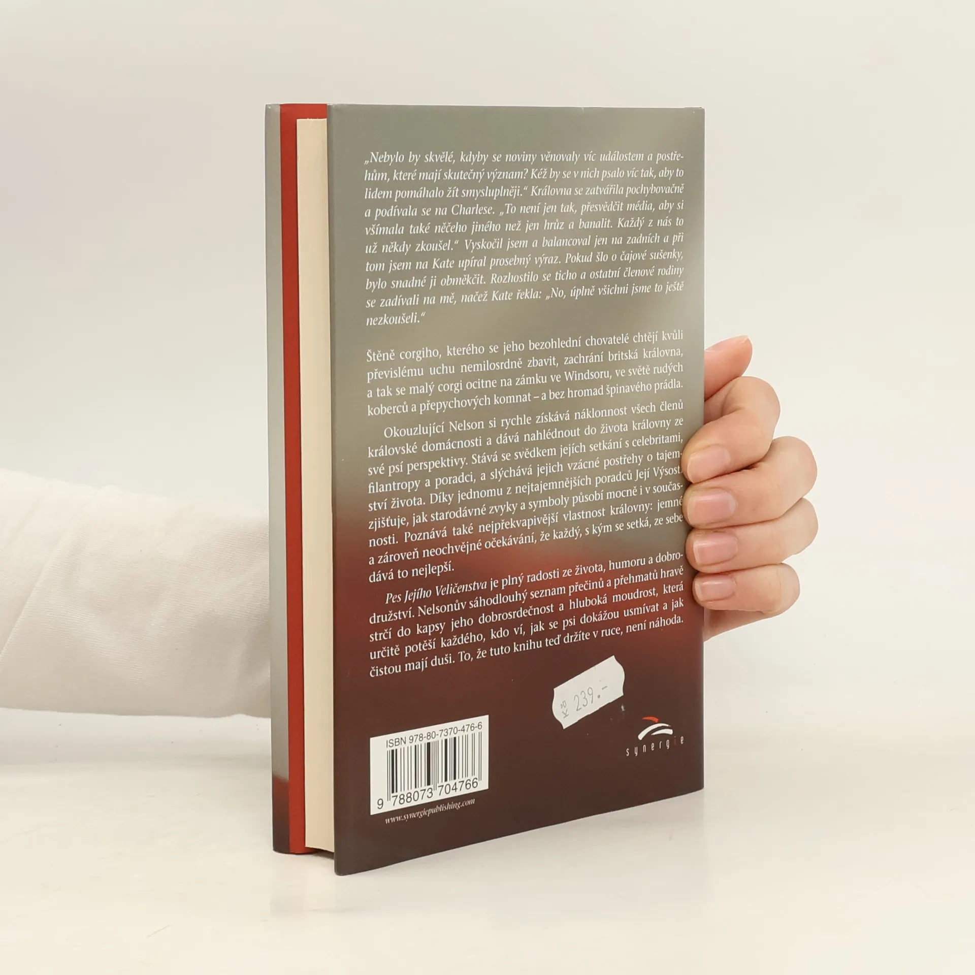 Štěně corgiho, kterého se jeho bezohlední chovatelé chtějí kvůli převislému uchu nemilosrdně zbavit, zachrání britská královna, a tak se malý corgi ocitne na zámku ve Windsoru, ve světě rudých koberců a přepychových komnat – a bez hromad špinavého prádla. Okouzlující Nelson si rychle získává náklonnost všech členů královské domácnosti a dává nahlédnout do života královny ze své psí perspektivy. Stává se svědkem jejích setkání s celebritami, filantropy a poradci, a slýchává jejich vzácné postřehy o tajemství života. Díky jednomu z nejtajemnějších poradců Její Výsosti zjišťuje, jak starodávné zvyky a symboly působí mocně i v současnosti. Poznává také nejpřekvapivější vlastnost královny: jemné a zároveň neochvějné očekávání, že každý, s kým se setká, ze sebe dává to nejlepší. Pes Jejího Veličenstva je plný radosti ze života, humoru a dobrodružství. Nelsonův sáhodlouhý seznam přečinů a přehmatů hravě strčí do kapsy jeho dobrosrdečnost a hluboká moudrost, která určitě potěší každého, kdo ví, jak se psi dokážou usmívat a jak vřelý mají jazyk.