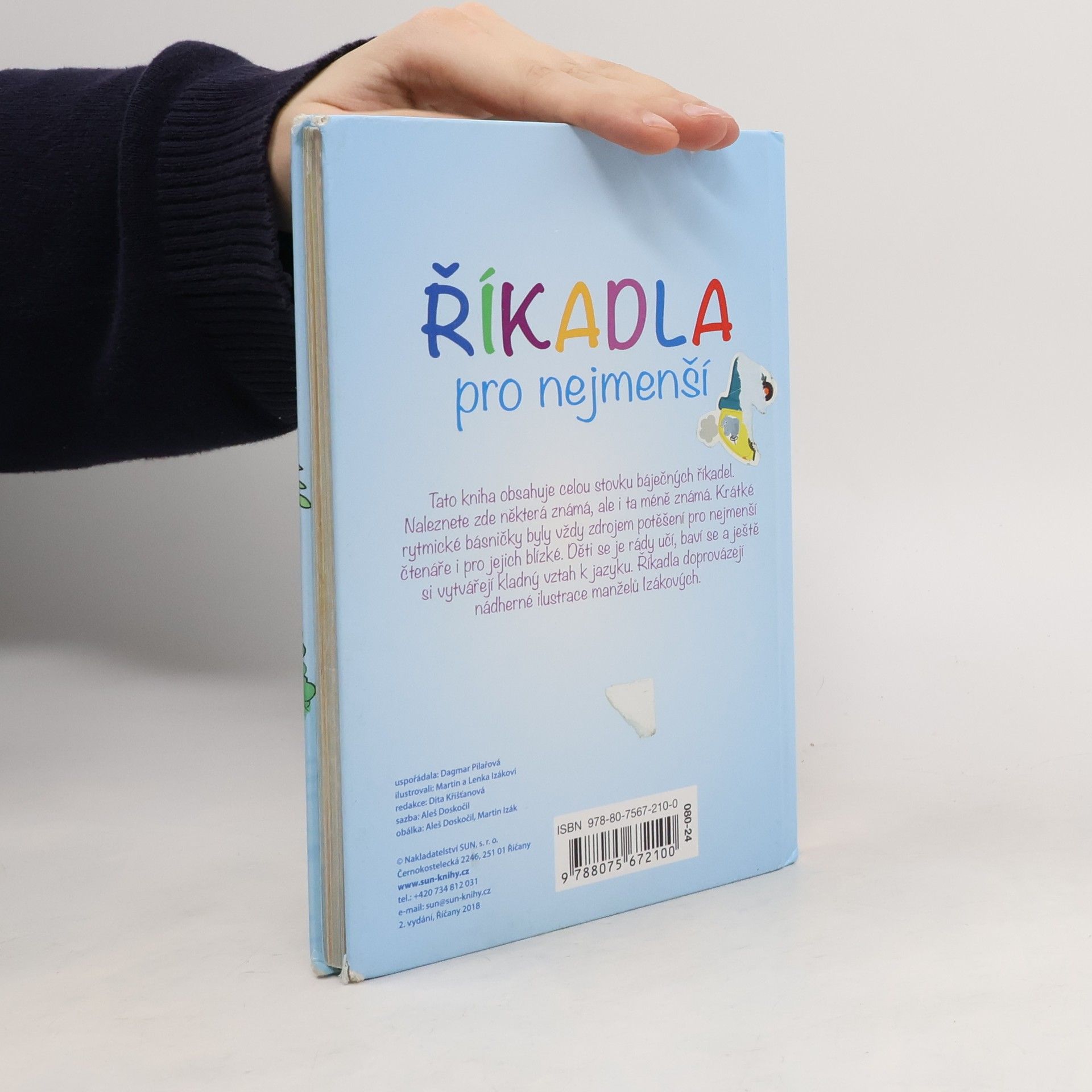 Tato kniha obsahuje celou stovku říkadel. Naleznete zde některá známá, ale i ta méně známá. Krátké rytmické básničky byly vždy zdrojem potěšení pro nejmenší čtenáře i pro jejich blízké. Děti se je rády učí, baví se a ještě si vytvářejí kladný vztah k jazyku. Říkadla doprovázejí nádherné ilustrace manželů Izákových.