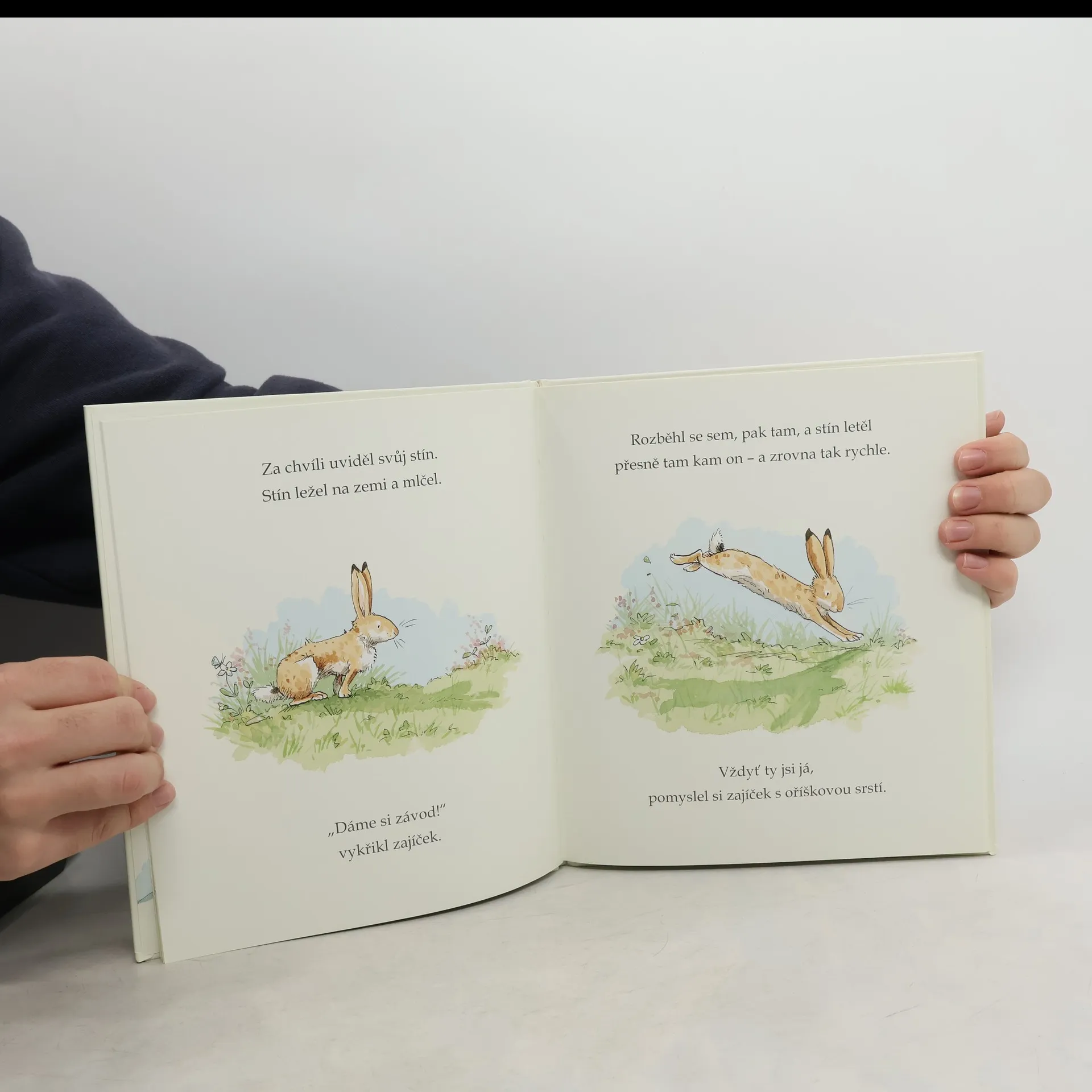Táta zajíc měl hodně práce, a tak se zajíček s oříškovou srstí vydal na dobrodružnou výpravu po okolí sám. Ale s kaluží a soutěžit se svým stínem není vůbec žádná zábava. A tak běžel dál. Doběhl až k Mračné hoře a ve vřesu tam na něj čekalo překvapení - sněhově bílý zajíček! Kouzelná knížka s překrásnými ilustracemi vypráví příběh o přátelství mezi dvěma malými zajíčky.