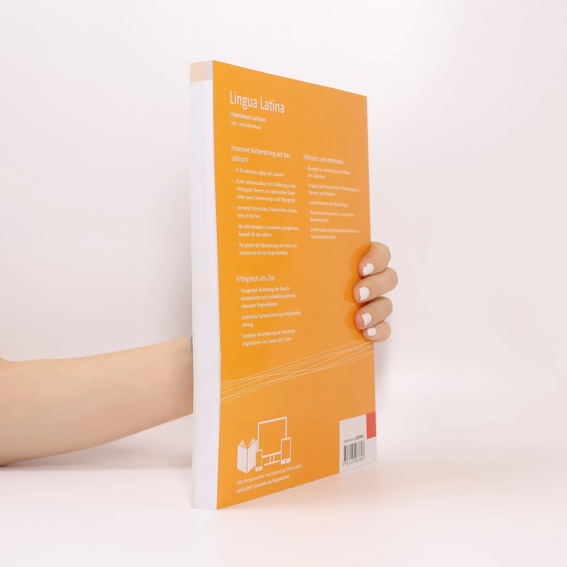 Jetzt in Niedersachsen als Schulbuch zugelassen! Mit der kompletten Neubearbeitung von Lingua Latina „ex efef “ werden bewährte und neue Lernansätze zueinem aktuellen Lateinlehrwerk kombiniert. Das Lehrwerk orientiert sich an den Inhalten des Latinums und bereitet gezielt auf die Prüfung vor. Intensivkurs Latinum behandelt die wichtigsten Erscheinungen der lateinischen Grammatik und bereitet auf das Übersetzen prüfungsrelevanter Originaltexte vor ist ideal für Erwachsene, die sich auf die Ergänzungsprüfung zum Latinum vorbereiten beinhaltet zahlreiche Übungen und Erläuterungen zu den wichtigsten Grammatikphänomenen ausführlicher Anhang mit systematischer Grammatik und umfangreichem Glossar unterstützt das autonome Lernen ermöglicht interessante Einblicke in Sprache und Kultur der römischen Antike