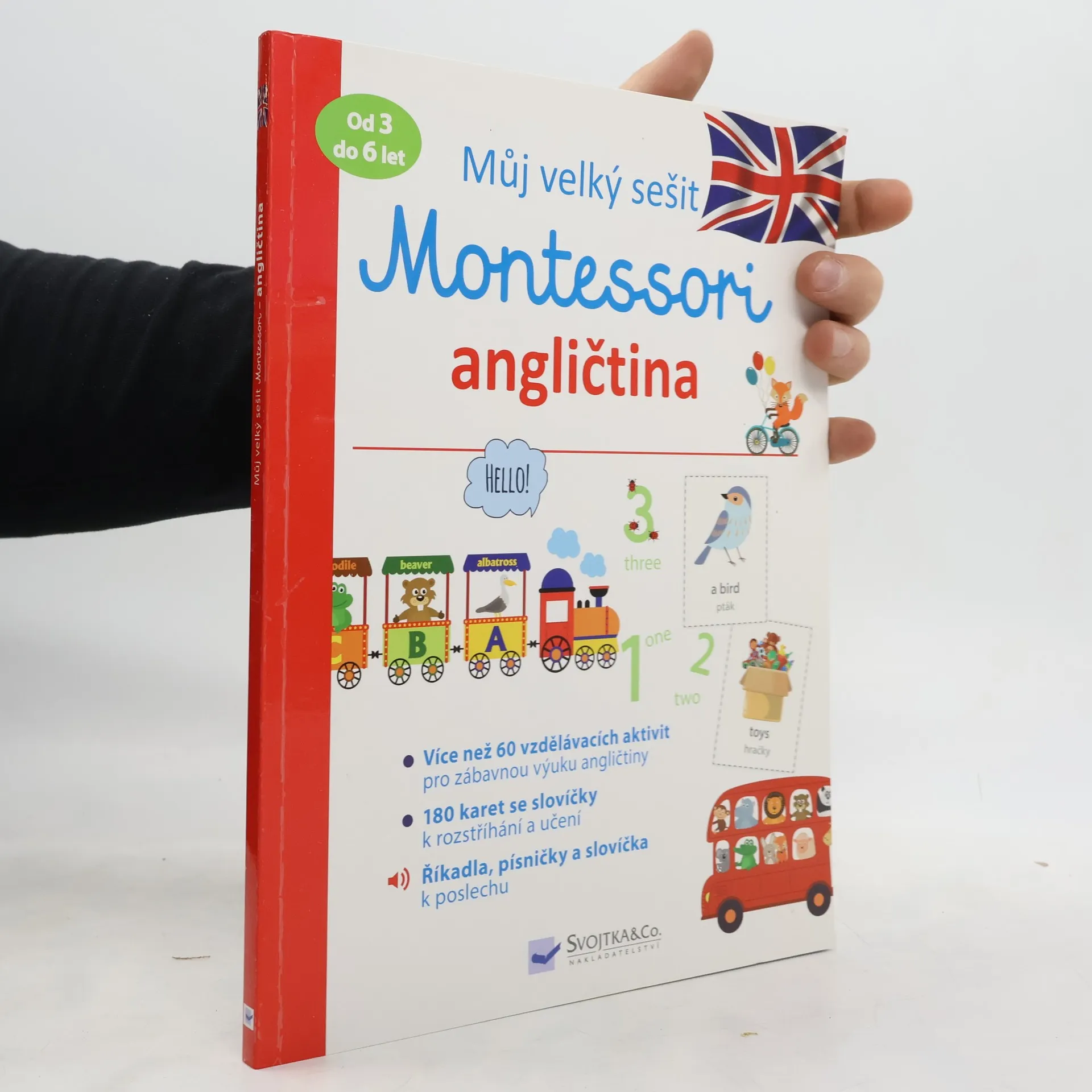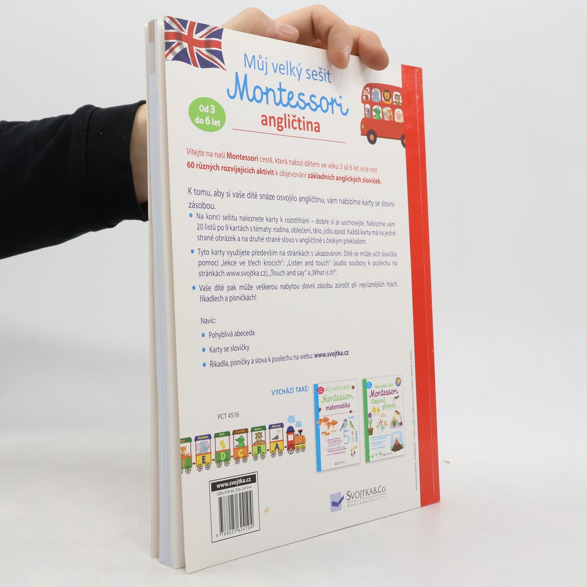 K tomu, aby si vaše dítě snáze osvojilo angličtinu, vám v tomto pracovním sešitu nabízíme karty se slovní zásobou. Aktivity a karty jsou s těmito tématy: rodina, oblečení, tělo, jídlo apod. Každá karta má na jedné straně obrázek a na druhé straně slovo v angličtině s českým překladem. Tyto karty využijete především na stránkách s ukazováním. Dítě se bude učit slovíčka pomocí "lekce ve třech krocích": "Listen and touch", "Touch and say" a "What is it?". Vaše dítě pak veškerou nabytou slovní zásobu zúročí při nejrůznějších hrách, říkadlech a písničkách. Ke knize patří též audio soubory ke stažení.