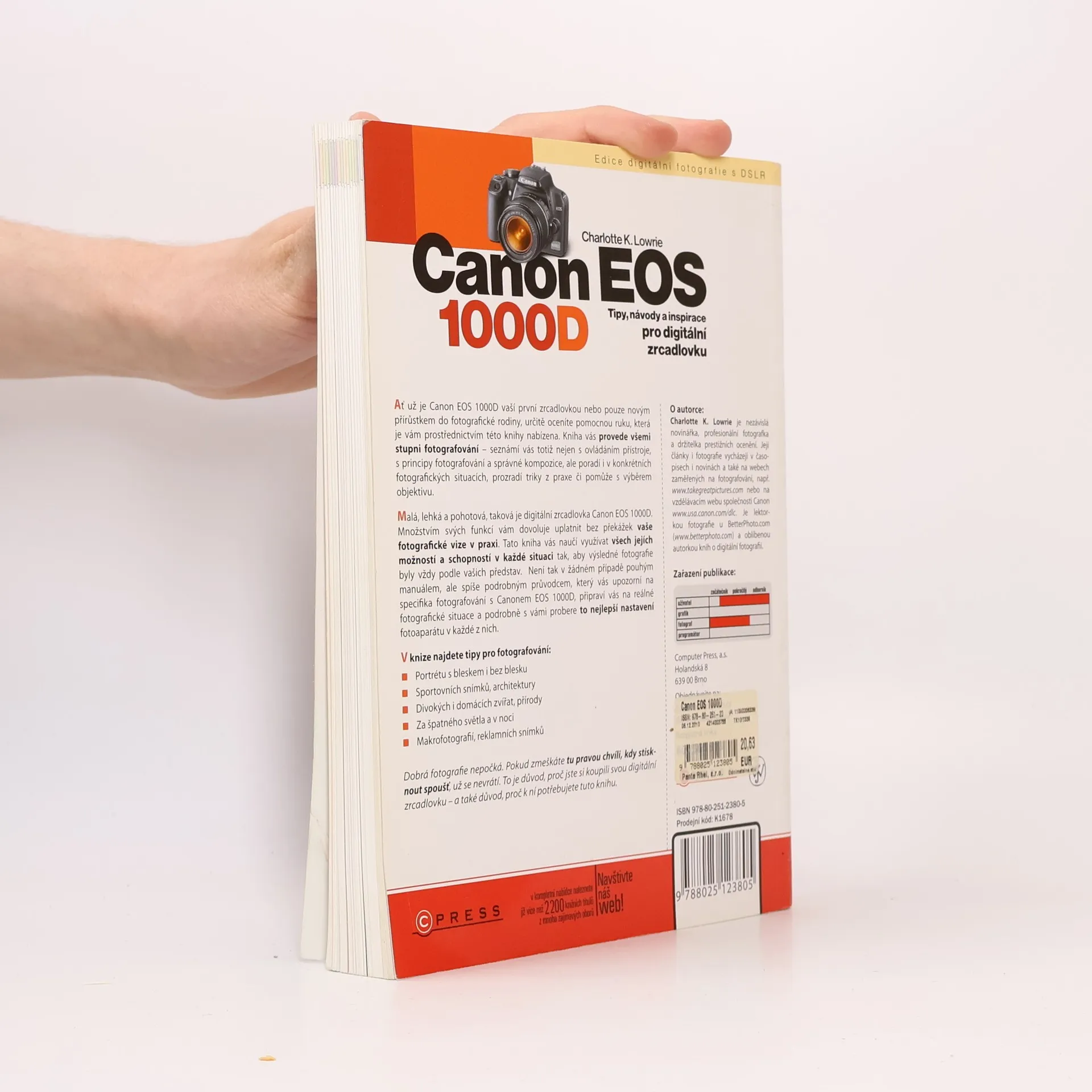 Ať už je Canon EOS 1000D vaší první zrcadlovkou nebo pouze novým přírůstkem do fotografické rodiny, určitě oceníte pomocnou ruku, která je vám prostřednictvím této knihy nabízena. Kniha vás provede všemi stupni fotografování – seznámí vás totiž nejen s ovládáním přístroje, s principy fotografování a správné kompozice, ale poradí i v konkrétních fotografických situacích, prozradí triky z praxe či pomůže s výběrem objektivu. Malá, lehká a pohotová, taková je digitální zrcadlovka Canon EOS 1000D. Množstvím svých funkcí vám dovoluje uplatnit bez překážek vaše fotografické vize v praxi. Tato kniha vás naučí využívat všech jejích možností a schopností v každé situaci tak, aby výsledné fotografie byly vždy podle vašich představ. Není tak v žádném případě pouhým manuálem, ale spíše podrobným průvodcem, který vás upozorní na specifika fotografování s Canonem EOS 1000D, připraví vás na reálné fotografické situace a podrobně s vámi probere to nejlepší nastavení fotoaparátu v každé z nich.