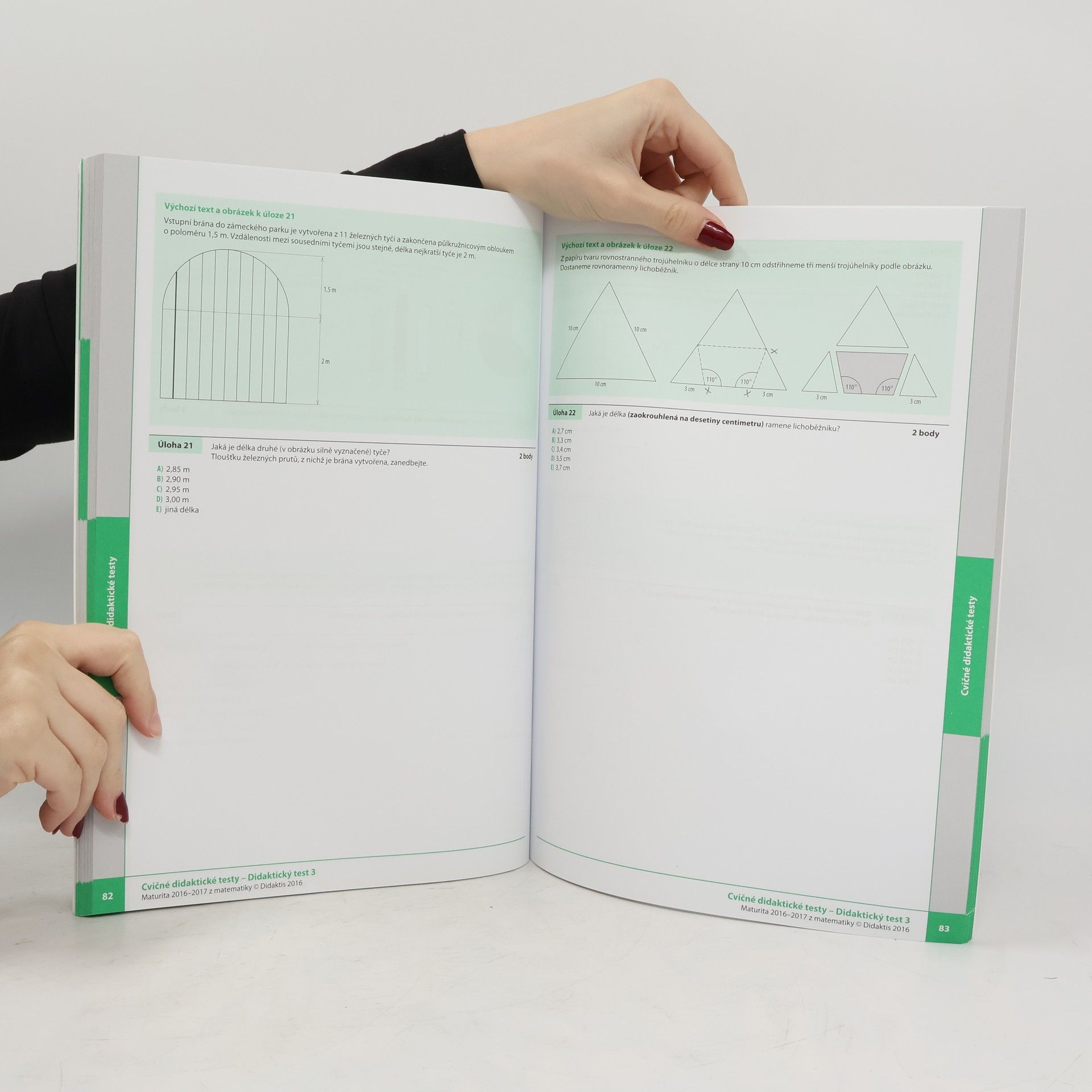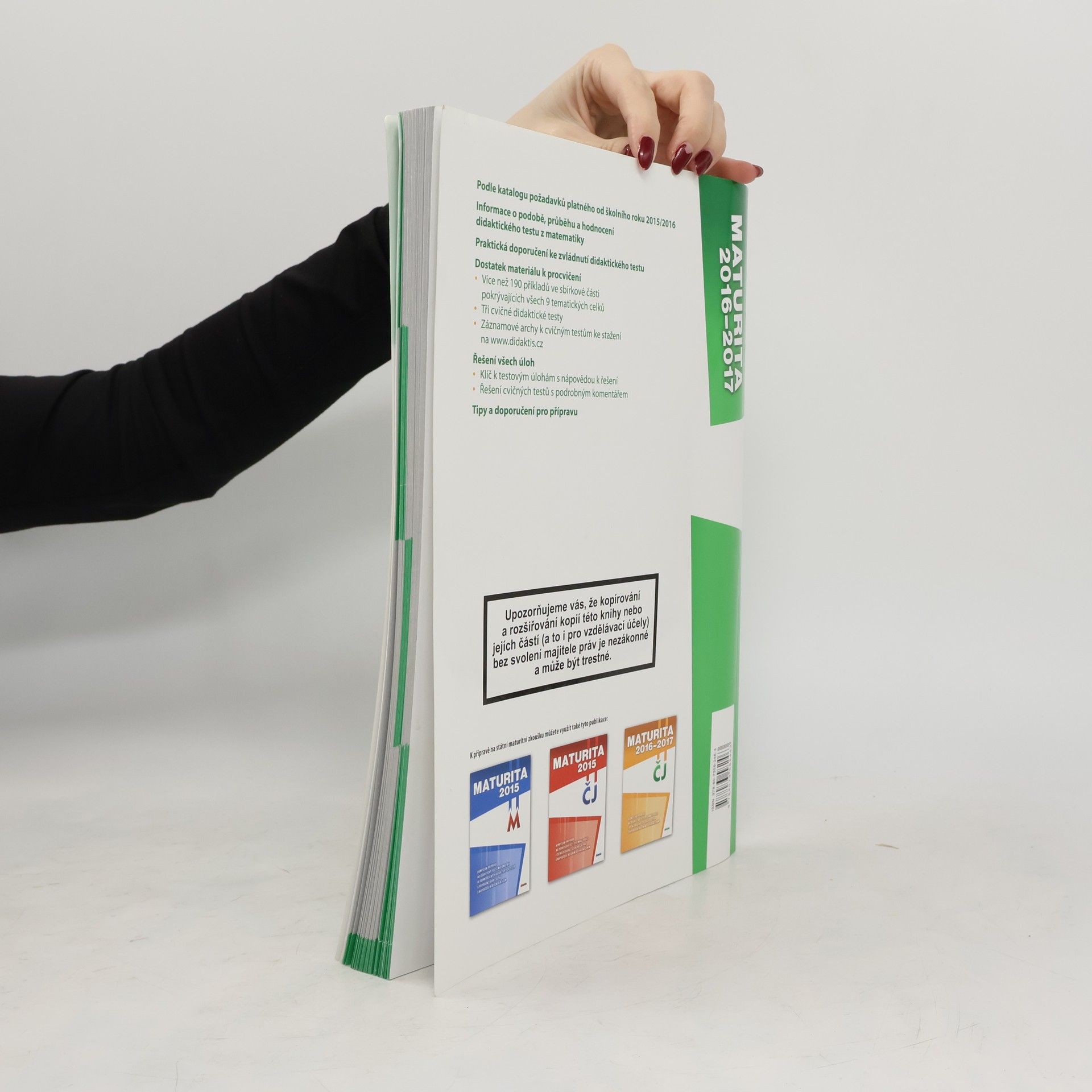 Komplexní cílená příprava na maturitní zkoušku z matematiky, poskytující metodická doporučení jak k přípravě na zkoušku, tak k jejímu průběhu. Zohledňuje aktuálně platný katalog požadavků. OBSAH Titul Maturita 2016–2017 z matematiky poskytuje základní informace, tipy a doporučení ke státní maturitní zkoušce. Titul je rozdělen do následujících částí: I. Úvodní informace informace k průběhu didaktického testu a seznam povolených pomůcek typy testových úloh tipy a doporučení pro přípravu návod na řešení základních typů úloh v didaktickém testu II. Testové úlohy:požadavky na konkrétní vědomosti a dovednosti z jednotlivých tematických okruhů vymezených v Katalogu požadavkůsada přibližně 20 úloh na procvičení ke každé z devíti oblastí vymezených v Katalogu požadavků; úlohy odpovídají zadávaným typům úloh v didaktickém testu – výběr z pěti možností, přiřazovací úlohy, otevřené úlohy III. Cvičné didaktické testy:tři didaktické testy, které odpovídají svou strukturou dosud zadaným ostrým a ilustračním testům IV. Řešení testových úloh a komentované řešení didaktických testů:řešení úloh z testové části u každé úlohy navíc tipy na postup při řešení nebo nápověda, jak jsme k danému výsledku dospěli řešení didaktických testů z III. části publikace doplněno rozsáhlým komentářem ke každé úloze