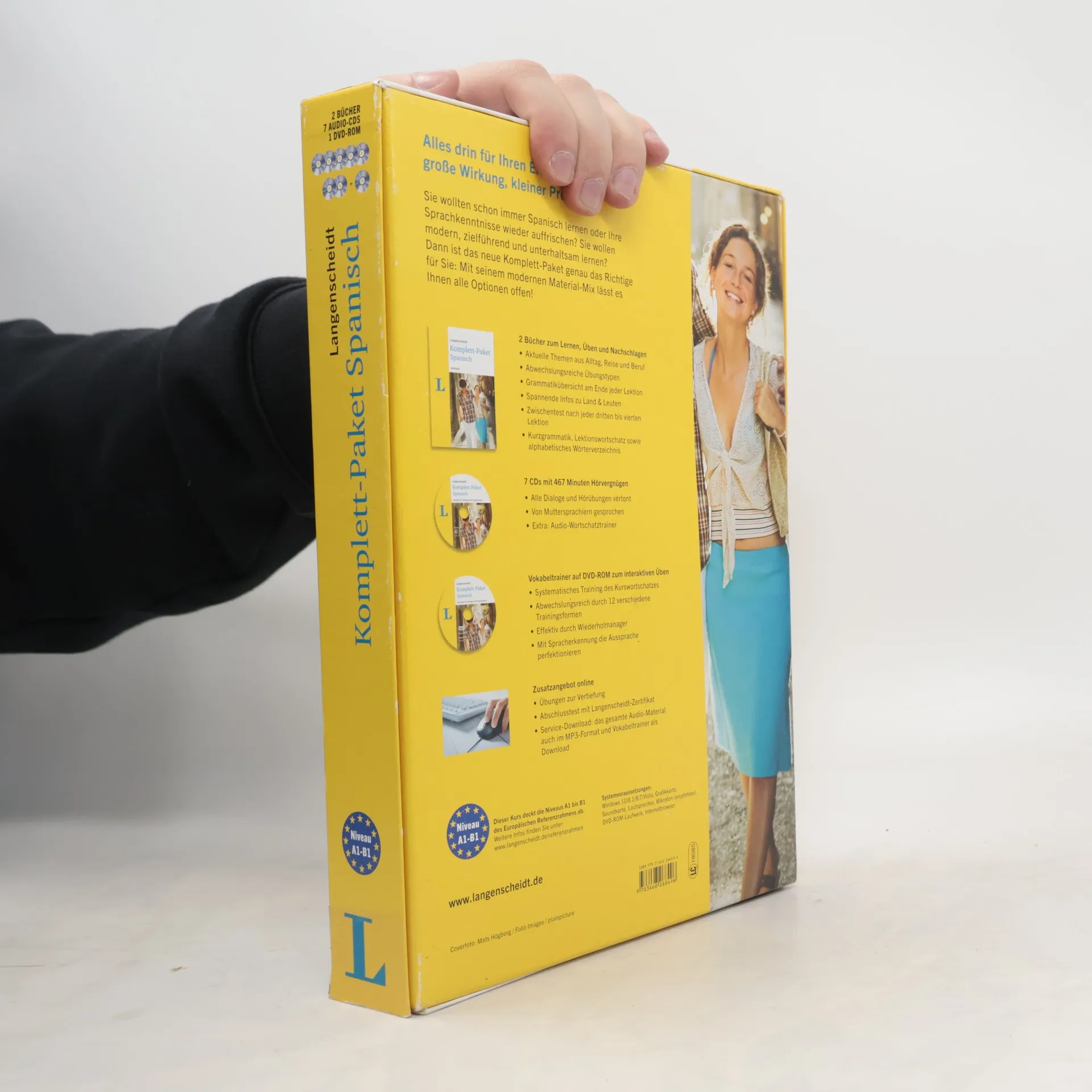 Der effektive Sprachkurs spricht alle Sinne an und ermöglicht ein schnelles Erlernen der spanischen Sprache. Mit einem klar strukturierten Lehrbuch und einem Begleit-Übungsbuch wird das Lernen durch alltagsnahe Themen, eine Grammatikübersicht nach jedem Kapitel und Zwischentests zur Lernkontrolle erleichtert. Ein Vokabeltrainer für den PC (Windows) ermöglicht zusätzliches Üben des Kurswortschatzes. Für unterwegs steht ein Service-Download zur Verfügung, mit dem das komplette Audio-Material online heruntergeladen werden kann – ideal für MP3-Player und Smartphones. Nach Bestehen des Abschlusstests erhalten Sie ein angesehene Zertifikat. Der Kurs richtet sich an Anfänger und Fortgeschrittene und deckt die Niveaus A1–B1 ab. Ob für einen Spanien-Urlaub, die Arbeit oder einfach so: Mit diesem Komplett-Kurs können Sie die Grundlagen der spanischen Sprache spielend leicht erlernen. Der multimediale Ansatz spricht alle Sinne an und macht das Sprachenlernen einfacher. Der Audio-Sprachkurs bietet für jede Situation das passende Lernmedium, was das Sprachtraining beschleunigt und Erfolgserlebnisse schafft.
