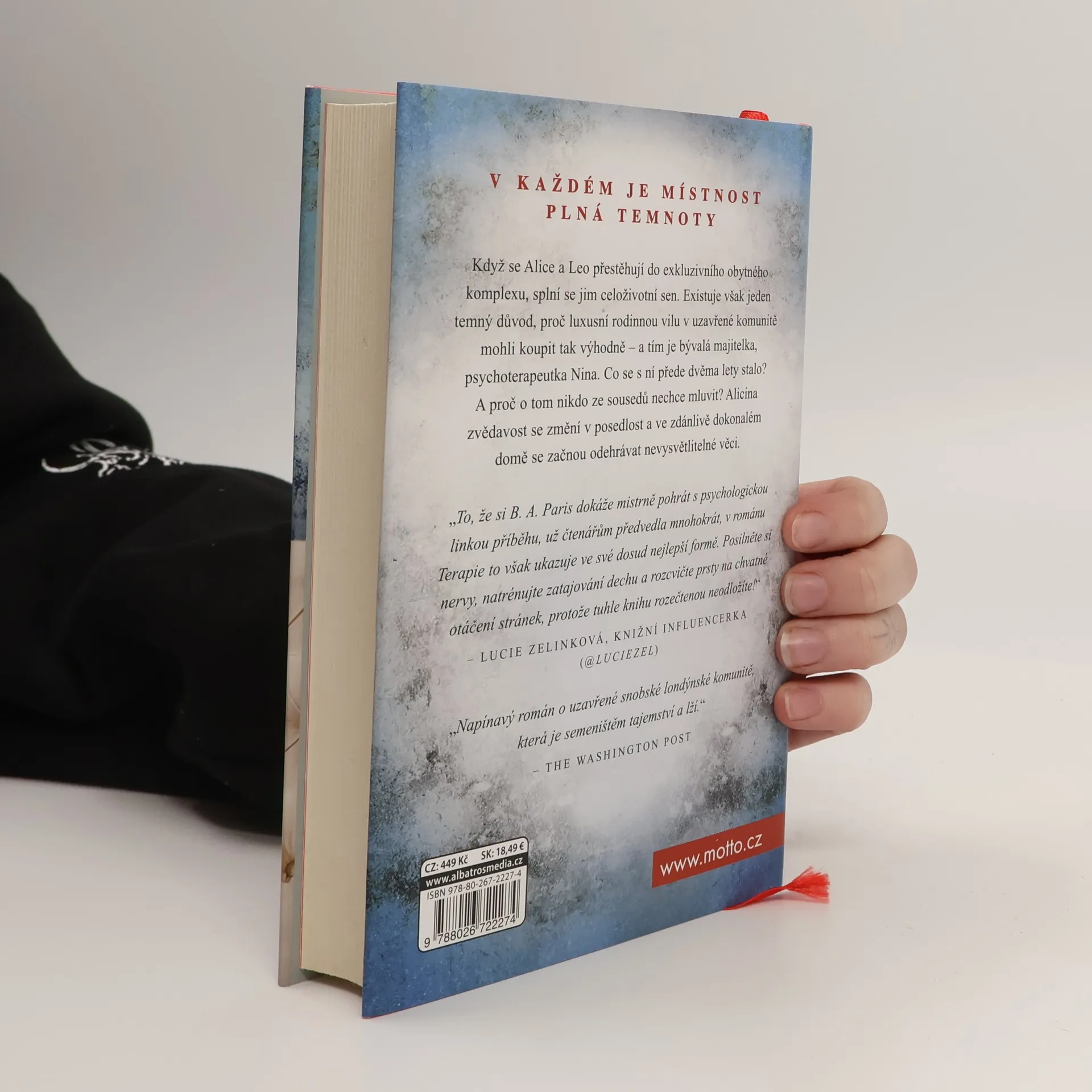 V každé duši je místnost, do které je nebezpečné vstoupit. Když se Alice a Leo přestěhují do exkluzivního obytného komplexu, splní se jim celoživotní sen. Existuje však jeden temný důvod, proč luxusní rodinnou vilu v uzavřené komunitě mohli koupit tak výhodně – a tím je bývalá majitelka, psychoterapeutka Nina. Co se s ní přede dvěma lety stalo? A proč o tom nikdo ze sousedů nechce mluvit? Alicina zvědavost se změní v posedlost a ve zdánlivě dokonalém domě se začnou odehrávat nevysvětlitelné věci. B. A. Paris, autorka bestsellerů Za zavřenými dveřmi a V pasti lží, se v Terapii vrací k tomu, v čem je nejlepší - k napínavému psychologickému thrilleru.