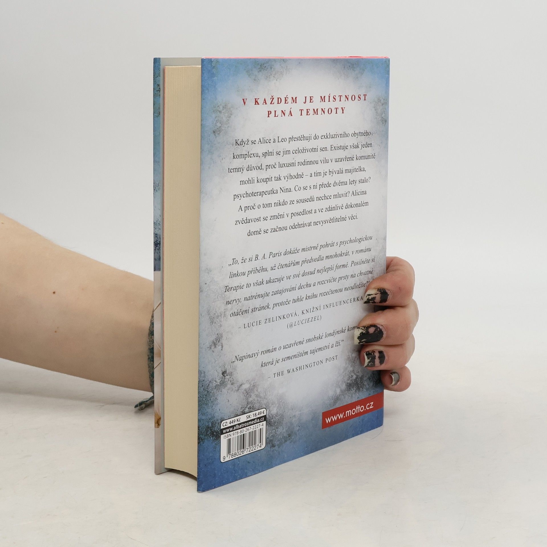 V každé duši je místnost, do které je nebezpečné vstoupit. Když se Alice a Leo přestěhují do exkluzivního obytného komplexu, splní se jim celoživotní sen. Existuje však jeden temný důvod, proč luxusní rodinnou vilu v uzavřené komunitě mohli koupit tak výhodně – a tím je bývalá majitelka, psychoterapeutka Nina. Co se s ní přede dvěma lety stalo? A proč o tom nikdo ze sousedů nechce mluvit? Alicina zvědavost se změní v posedlost a ve zdánlivě dokonalém domě se začnou odehrávat nevysvětlitelné věci. B. A. Paris, autorka bestsellerů Za zavřenými dveřmi a V pasti lží, se v Terapii vrací k tomu, v čem je nejlepší - k napínavému psychologickému thrilleru.