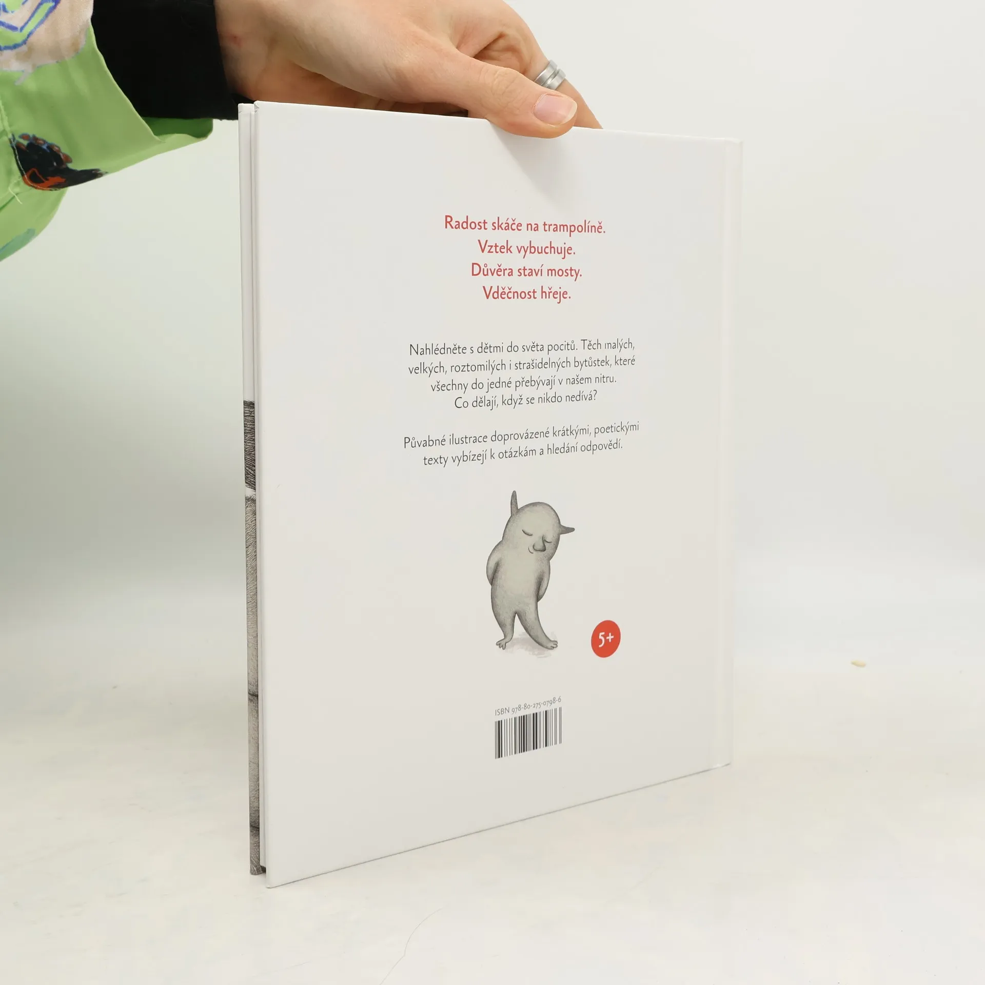 Laskavá obrázková knížka (nejen) o emocích Vezměte děti na výpravu do světa citů, pocitů a emocí. Nečekejte však žádné barvy. Naopak, paleta něžných ilustrací Alexandry Zającové je příjemně neutrální, měkce šedá, růžová či modrá. O to více vyniká to, co autorky chtějí sdělit. Z pocitů totiž stvořily zvláštní bytůstky — malé, velké, roztomilé i strašidelné —, které si žijí vlastním životem v našem nitru. Radost skáče na trampolíně, vztek vybuchuje, smutek se choulí v dece, trpělivost pěstuje růže, strach dělá, že není… láska rozsvěcuje. To, co tyto bytůstky dělají, vystihuje hlubokou podstatu daného pocitu a neobvyklým způsobem jej tak dětem přibližuje. Půvabné ilustrace doprovázené krátkými poetickými texty vybízejí k otázkám a hledání odpovědí. Emoce tu nejsou ani hodnoceny, ani nijak klasifikovány, prostě jen jsou a jednají. Přesně tak jako v každém z nás.